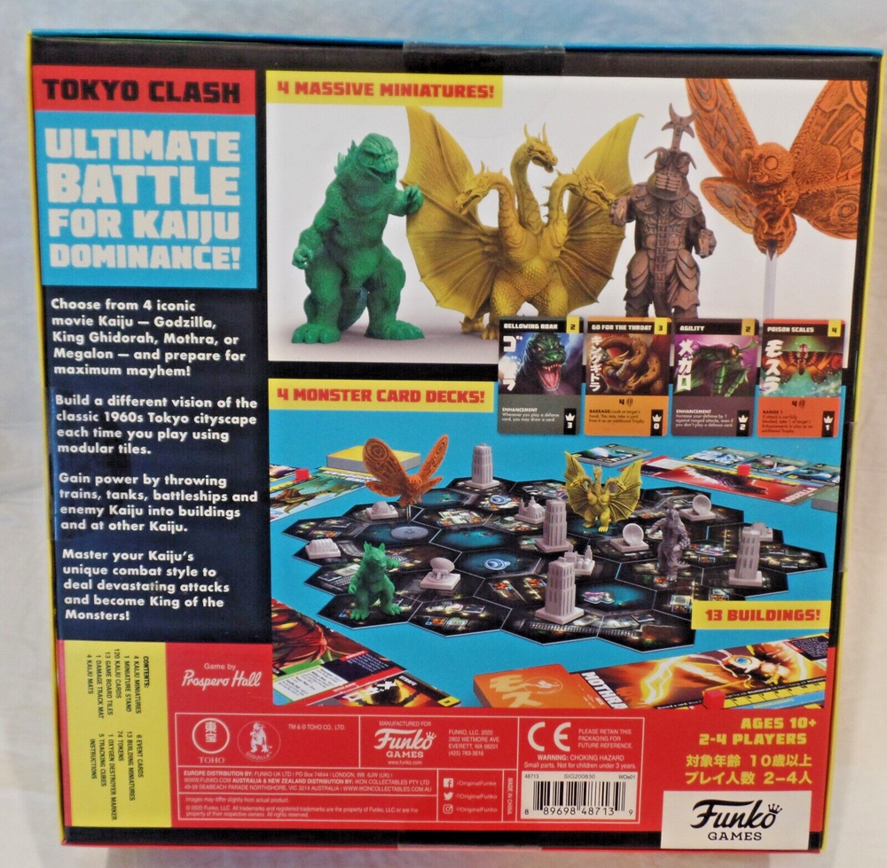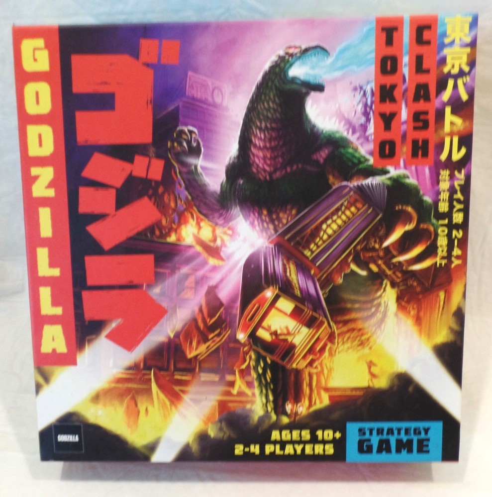 FUNKO GAMES Godzilla Tokyo Clash Miniatures Strategy Board Game New Play as famous Kaiju, with each player selecting to be either Godzilla, Mothra, King Ghiborah, or Megalon, and battle to see which monster will reign as king! Plan your strategy to gain energy by destroying select targets in order to use your Kaiju’s special abilities to defeat the other monsters. It’s a race to establish dominance before the humans are able to deploy their special game ending weapon. 4 stunning massive Kaiju miniatures! Ages 10 and Up