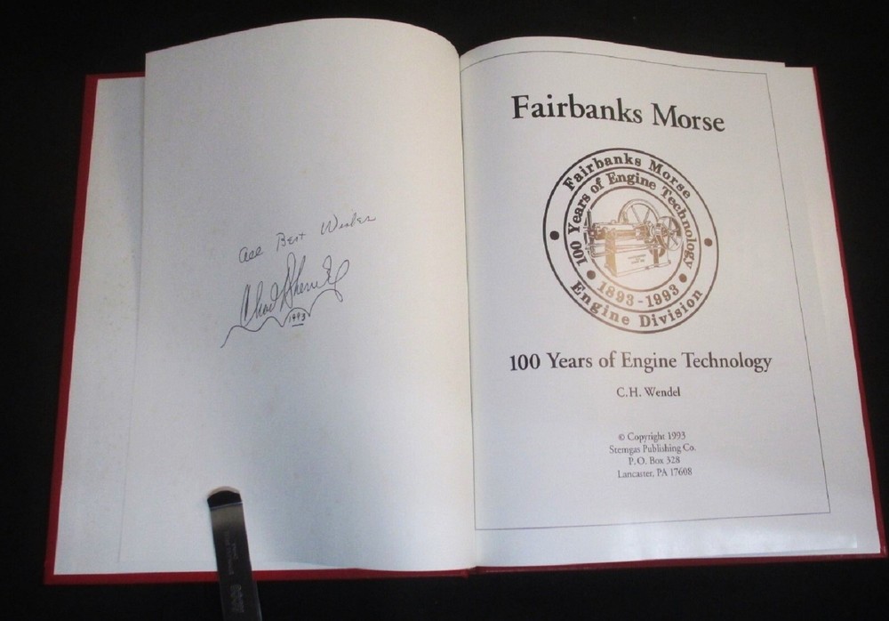 Fairbanks Morse: 100 Years of Engine Technology C.H. Wendel 1993 Stemgas Publishing 176 page illustrated hardcover Red Leather with Gilt Graphics – black and white photos and illustrations Signed by author on ffep ______________________________ Much of the historical material is taken directly from internal company documents, including a significant series of general letters sent out two territory man and branch houses as needs dictated. The vast majority of photographs appearing in this book are taken from originals held by Fairbanks morse. Many are published here for the first time.