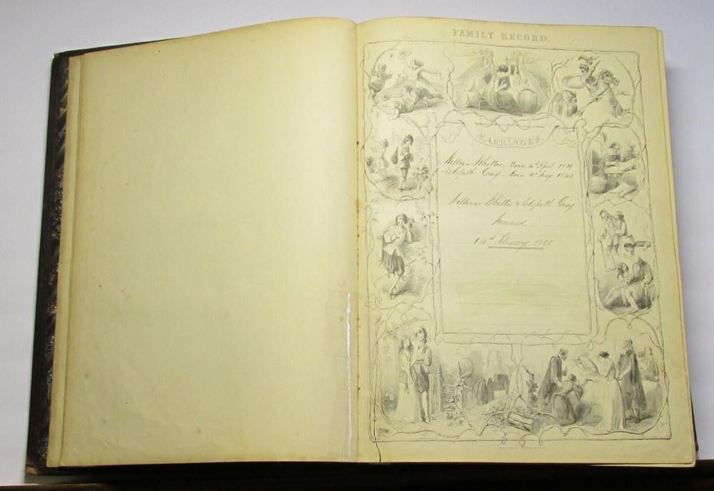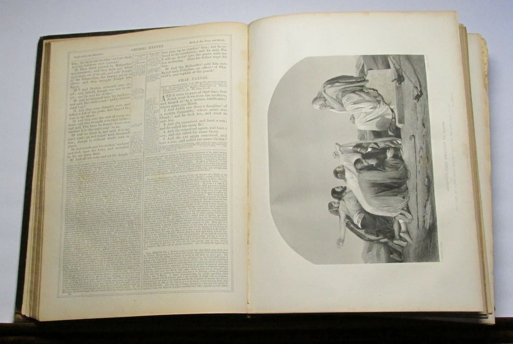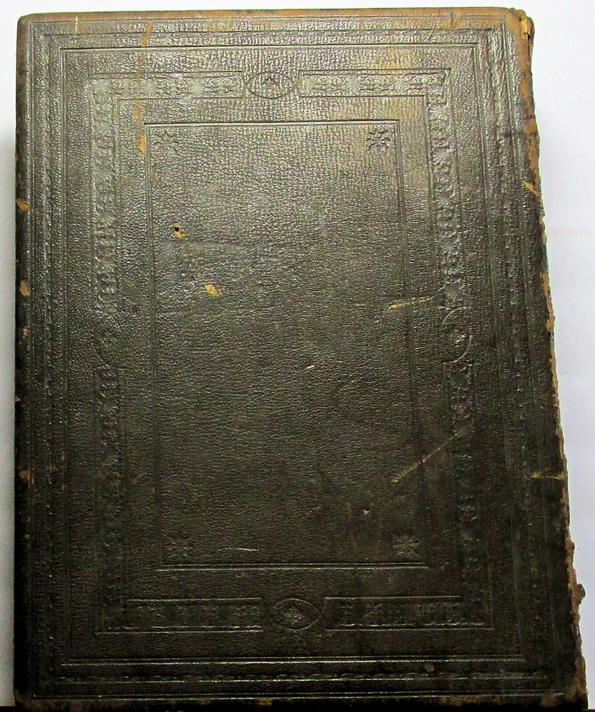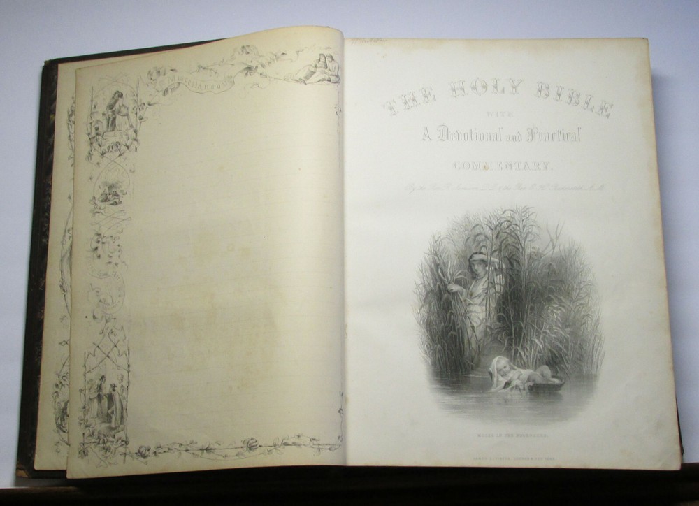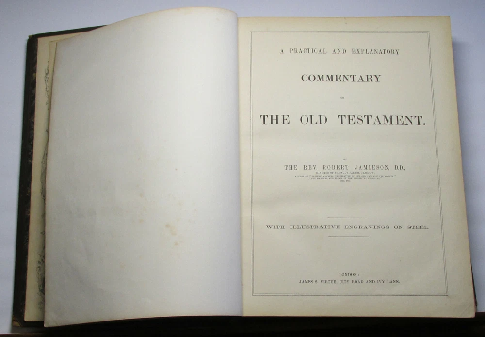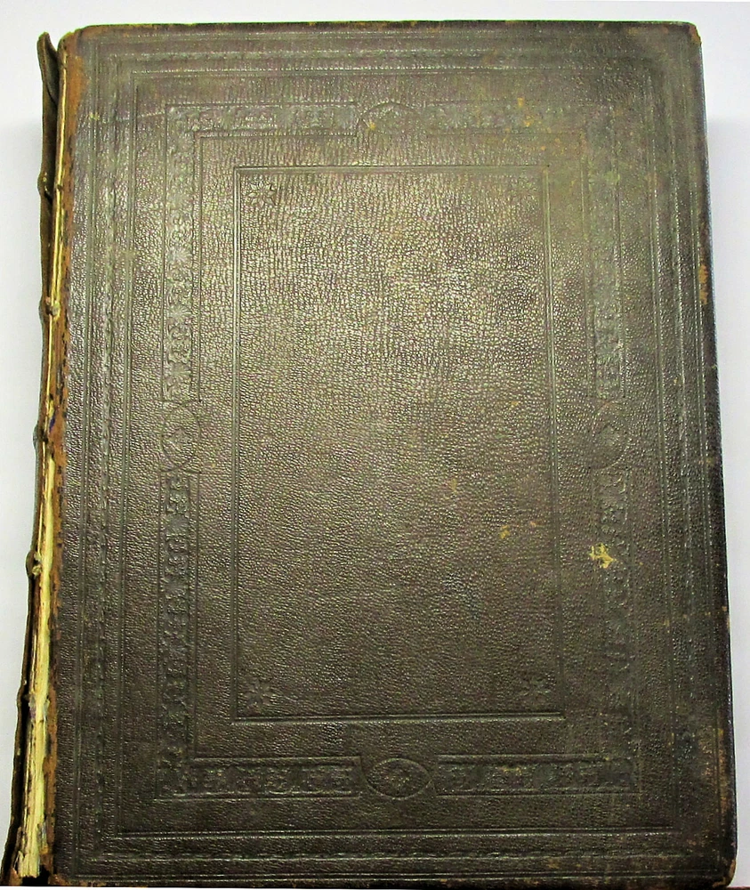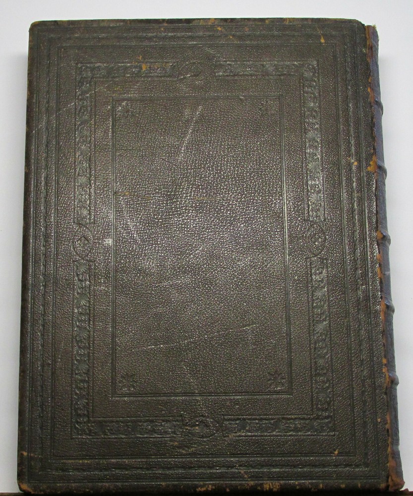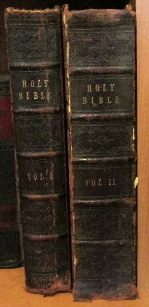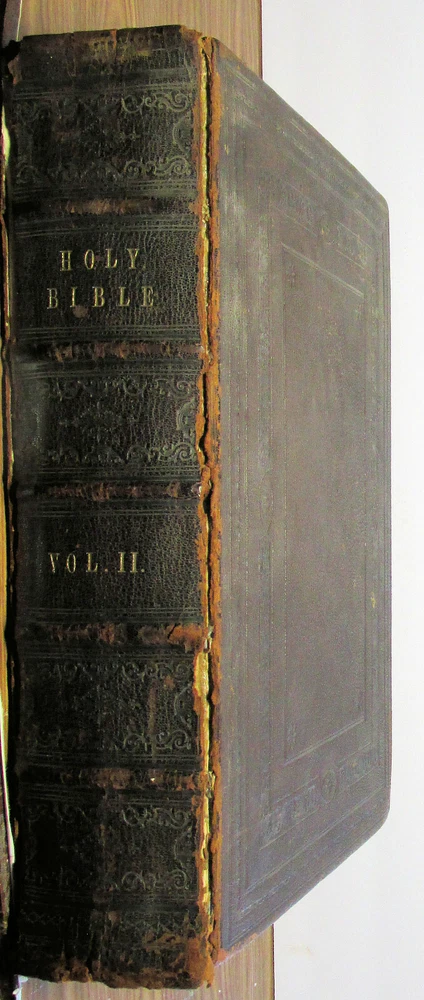 THE HOLY BIBLE with a Devotional and Practical COMMENTARY. (circa 1860). THE REV. ROBERT JAMIESON, with ILLUSTRATIVE ENGRAVINGS on STEEL, JAMES S. VIRTUE, CITY ROAD, and IVY LANE, LONDON. Two volumes, Civil War era leather folio family Bible. Full leather with all edges gilt, five raised bands to spine, and gilt title, with marbled endpapers. About 14-1/2 x 11 with 730 pp. (vol. I) and 459 pp. plus one and 423 pp. plus PSALMS OF DAVID AND SCRIPTURE PARAPHRASES. The outer binding on the heaviest volume (#2) is heavily shaken with the front and rear covers ALL BUT DETACHED and cracking along the spine leather with the joints heavily weakened. Some mild color fading to the covers with some wear marks. The first few pages of volume #1 with new archival tape. FAMILY RECORD from volume #1 has MARRIAGES with a few entries with dates of 1839, 1843, and the 14th of February, 1865 (near the end of the Civil War). Good minus to fair condition (volume one and two respectively). Rare two-volume Civil War Bible! HEAVY VOLUMES, NO INTERNATIONAL SHIPPING! Both volumes weigh a total of about twenty-five pounds.