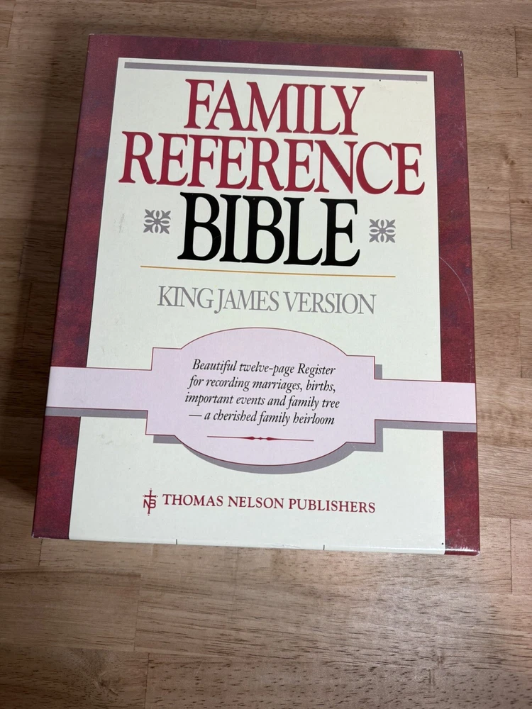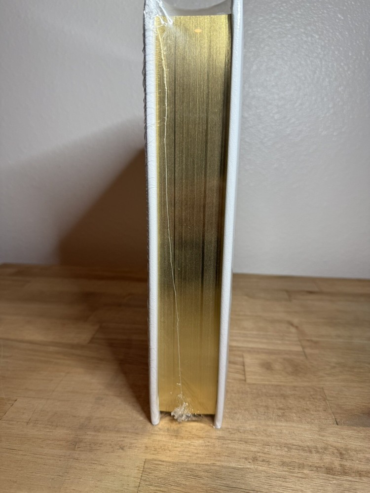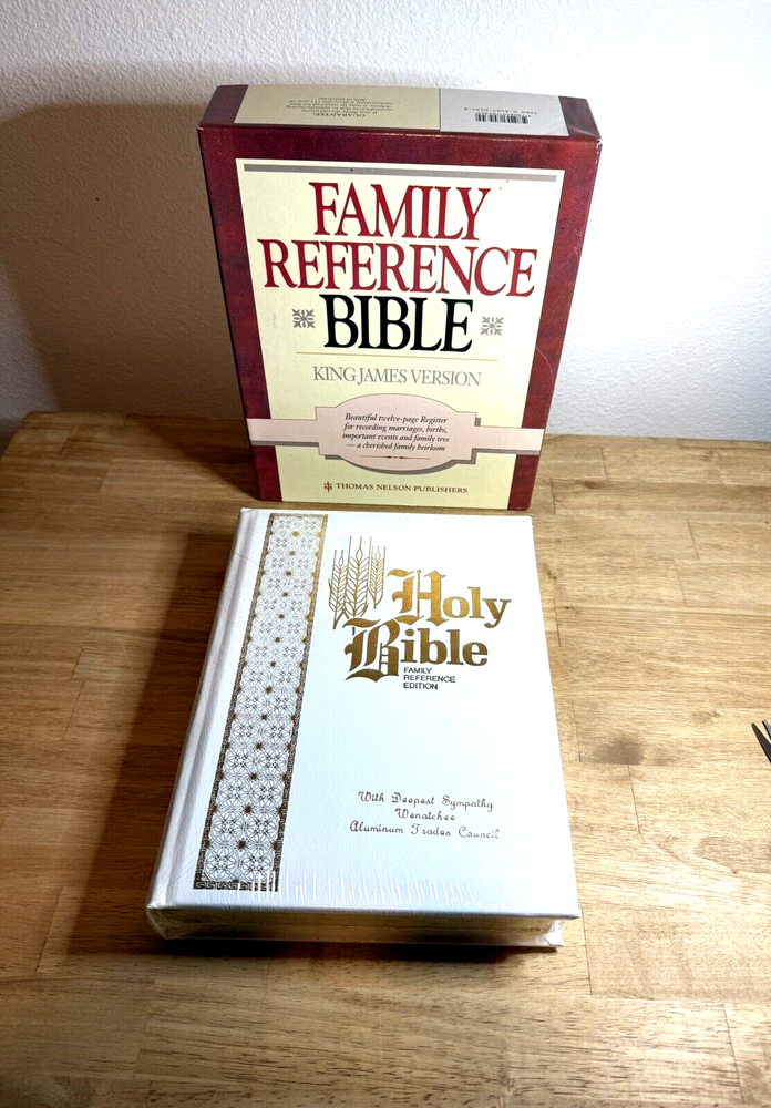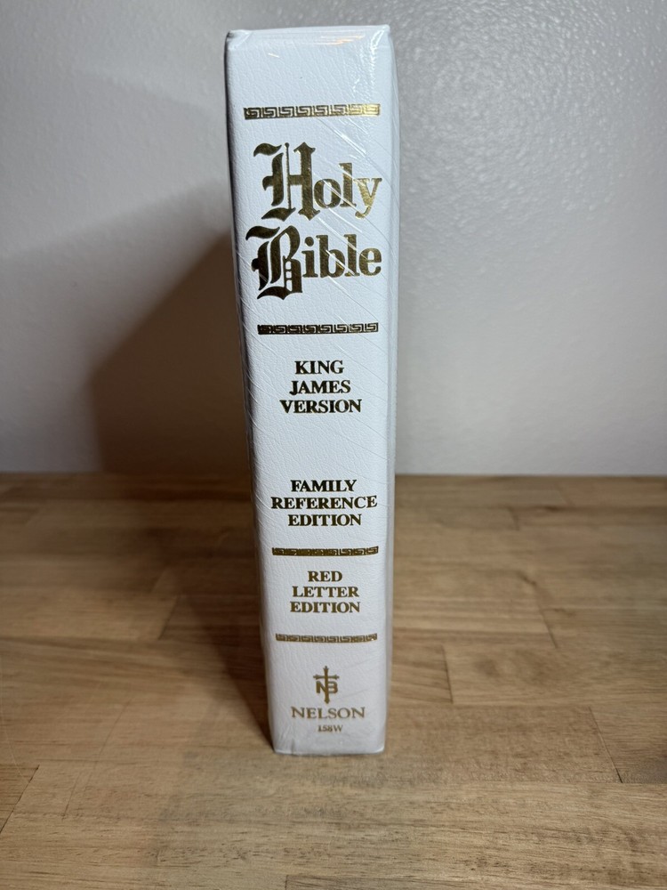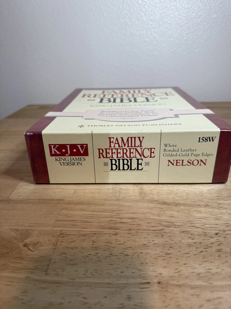 Family Reference Bible: King James Version White Bonded Leather Gilded Gold Page Edges Factory Sealed in Box Please see all pictures Smoke-free home. Features White Bonded Leather Gilded-Gold Page Edges 12 Page Register for Recording Marriages, Births, Important Events and Family Tree