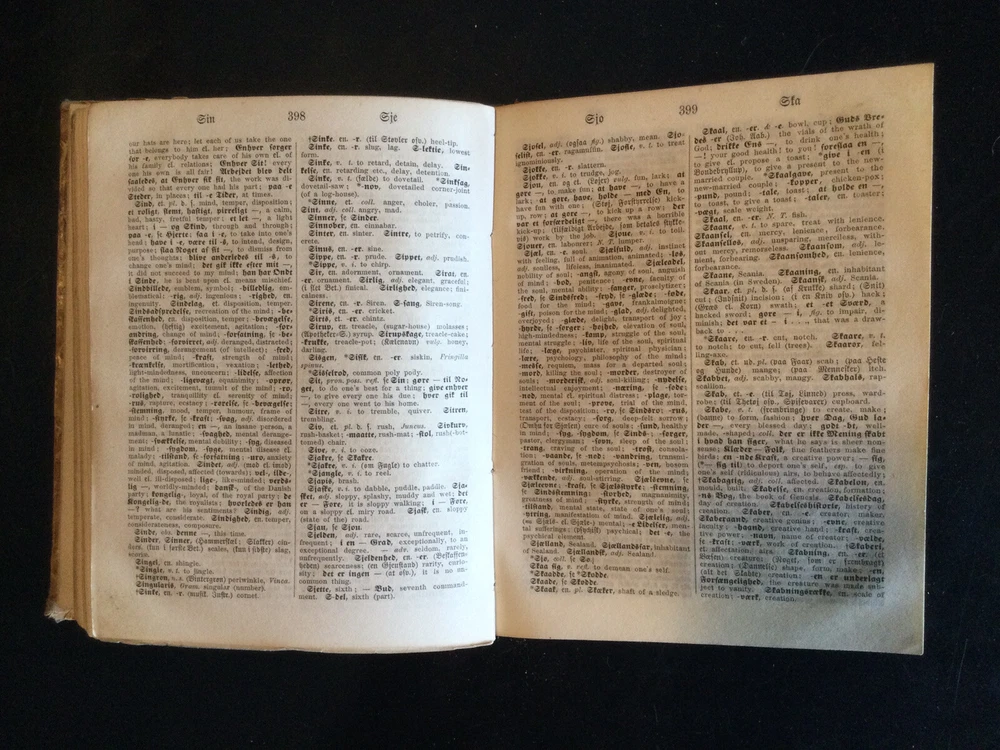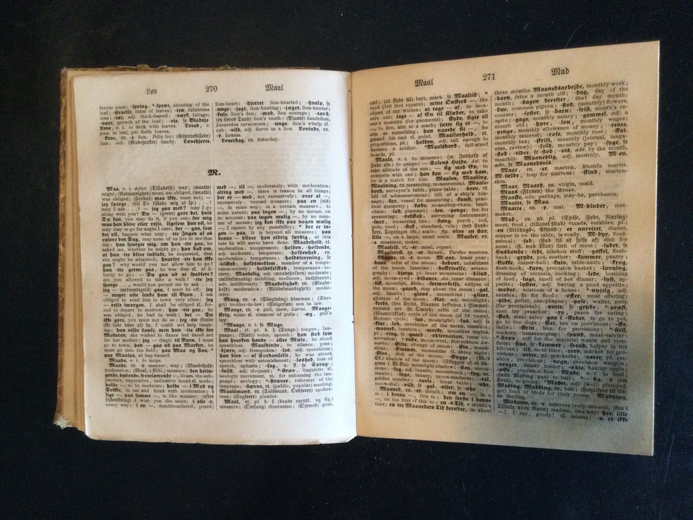 Ferall og Kepp's Dansk-norsk-engelske Ordbog, German Dictionary, 1873. Danish-Norwegian-English Dictionary. Calf spine with marbled covers. Shipped with USPS Media Mail.