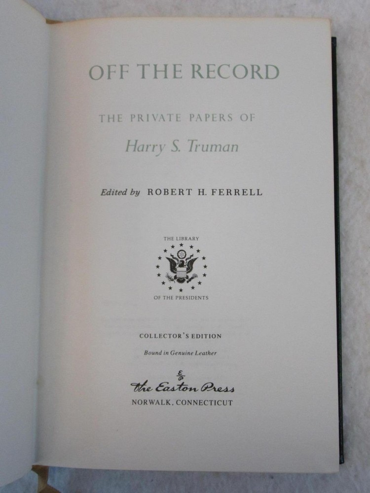 Robert H. Ferrell OFF THE RECORD The Private Papers of Harry S. Truman 1989 Easton Press Presidents Library Robert H. Ferrell OFF THE RECORD The Private Papers of Harry S. Truman 1989 Easton Press Presidents Library Condition: We strive to describe and photograph the condition of every item as accurately as possible. Photos are of the actual item that is being sold. Please examine the photos carefully for any condition details and possible flaws. Best Offers: We consider all offers in relation to current market values. We try to respond almost immediately to most offers. Most of our counteroffers are firm but we are open to bargaining. Shipping: We combine shipping. When ordering multiple items from us please request a total before paying. We charge postage based on weight plus $1 for each eBay listing. All of our orders are packed carefully to prevent damage during shipment. We ship most of our items within 24 hours. Contact Us: We are available 7 days a week and are happy to answer any questions you may have. Get Images that Make Supersized Seem Small. Attention Sellers - Get Templates Image Hosting, Scheduling at Auctiva.com.