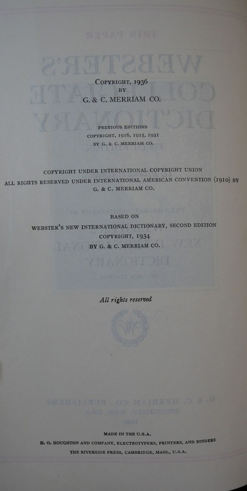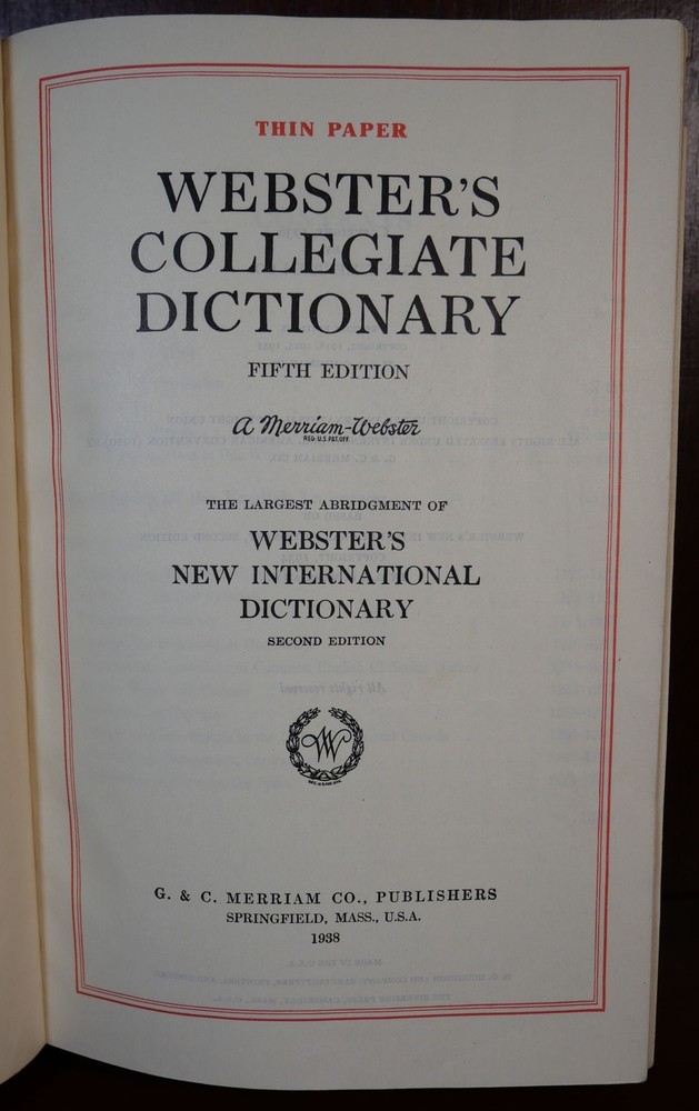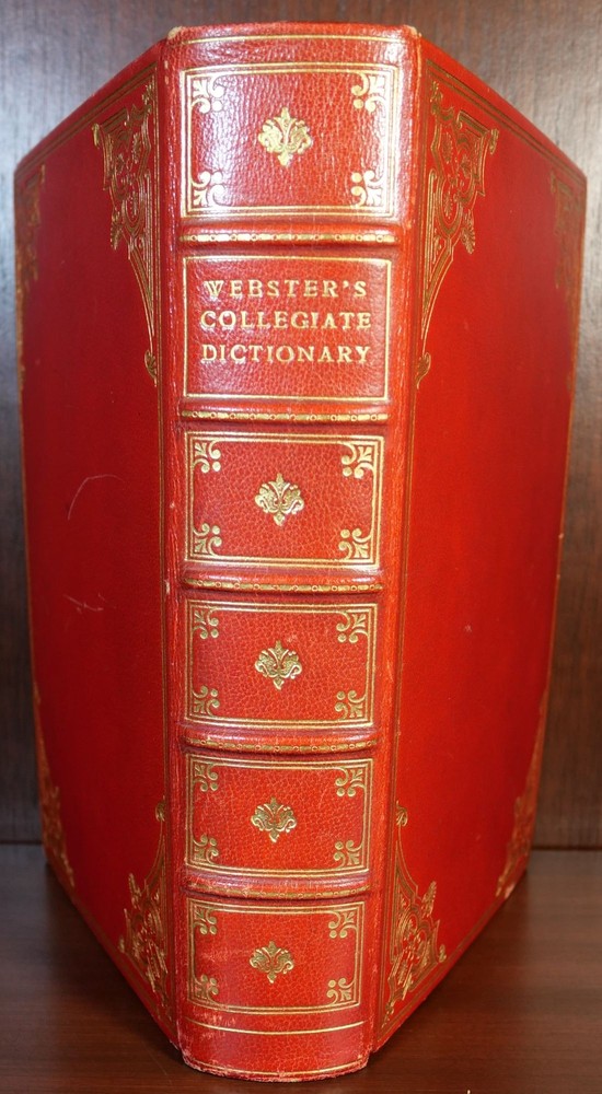 Find Leather Bound Webster Dictionary Title: Find Leather Bound Webster Dictionary Publication: Massachusetts: G. & C. Merriam Co. Publishers, 1938 Description: Fine Leather. Measuring approximately 9" x 6" with 1274 numbered pages. This book is in very good plus condition. Minor scuffing to both ends of spine. Gilt lettering and design on spine and boards full and vivid. All edges are gilt and full. Interior pages are bright and clean. Please view the many other rare titles available for purchase at our store. We are always interested in purchasing individual or collections of fine books. Inventory #(N10-29). Seller ID: 5138 Subject: Leather-Bound , Reference/Textbooks Ernestoic Books Terms All orders ship within two business days. Standard mail is USPS Media Mail. Expedited and international shipping are also available. We offer combined shipping on multiple orders. All items are guaranteed to be as described or they may be returned within 30 days of receipt for a full refund. This listing was created by Bibliopolis.