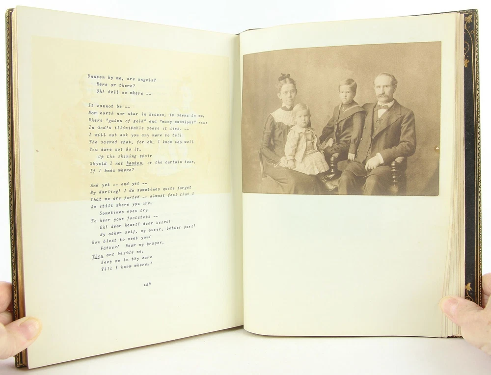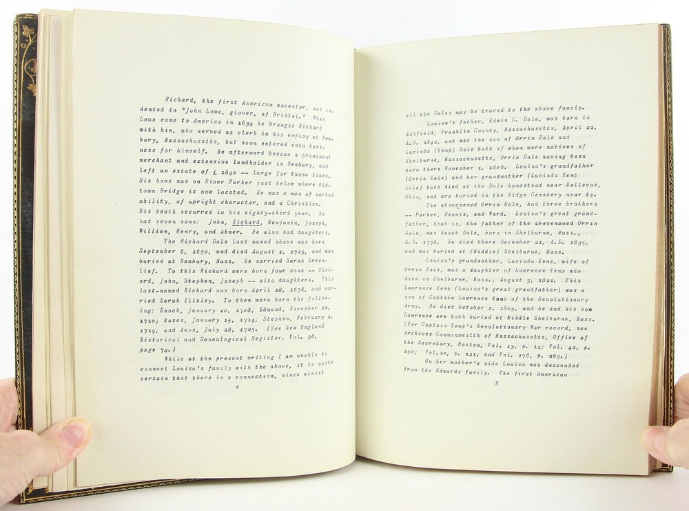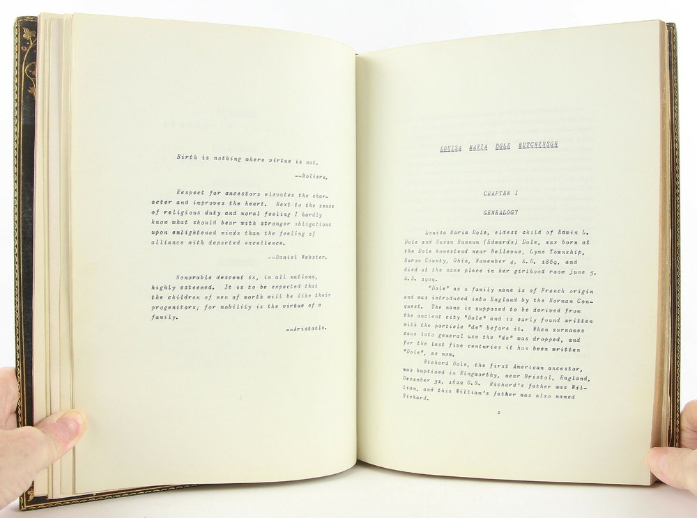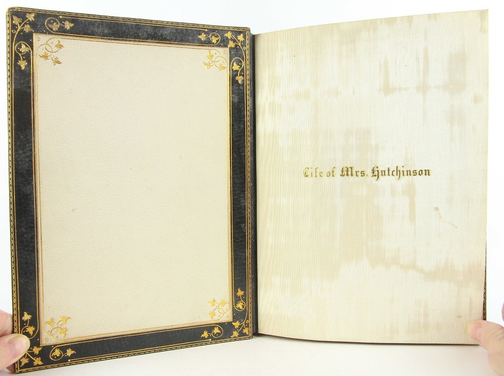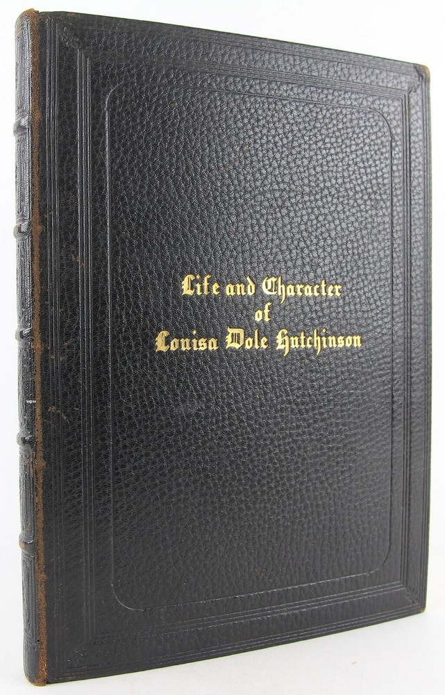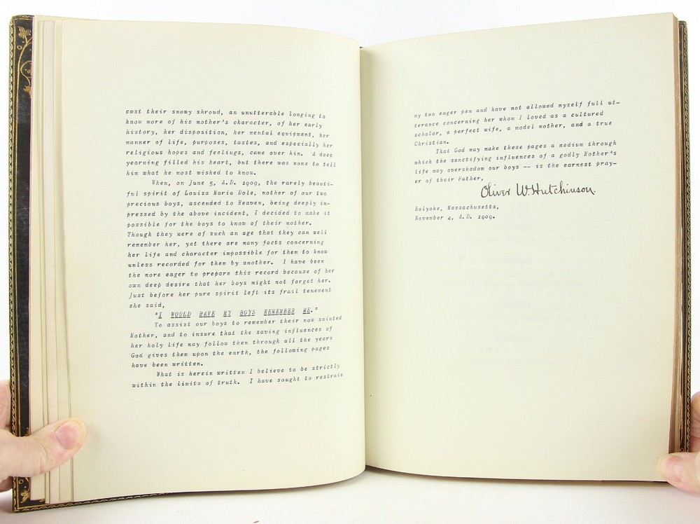 Sketch of the Life and Character of Louisa Maria Dole Hutchinson Prepared by Her Husband, The Rev. Oliver W. Hutchinson, For Their Sons, Oliver Wesley Hutchinson and Eliot Dole Hutchinson by Rev. Oliver W. Hutchinson 1909 O.W. Hutchinson (Bellevue, Ohio), an exquisitely bound volume, 8 x 11 1/8 inches tall x 1 1/4 inches thick full grain embossed leather bound, five raised bands to spine, gilt lettering to front cover, all page edges gilt, inlaid two-tone leather front and rear pastedowns framed by gilt dentelles, silk moire endpapers, neat type script profusely illustrated with tipped-in period photographs, and original family documents and press clippings throughout, signed by the author in period ink on the introduction, [13], 146, [13] pp. plus additional family memorabilia tipped onto blank rear free-endpapers, and laid in at the rear of the volume. Slight to moderate staining, rubbing and edgewear to covers. Slight bumping to the upper tips. Otherwise, in very good condition - clean, bright and unmarked. A seemingly unique work, not listed in OCLC or other indexes. A remarkable, apparently unique and uncatalogued 1909 biography and tribute to Louisa Maria (Dole) Hutchinson (1869-1909) of Bellevue, a small town in Huron County in northern Ohio. Written by her grieving husband to memorialize her for his sons, it is a poignant and meticulously written work, combining biography with personal reminiscences with a paean to the woman he loved, who was taken at the age of 39 from him and their two sons. The author, a Methodist minister, Rev. Oliver Wertz Hutchinson (1856-1922), appears to have completed the work on Thursday, November 4, 1909, the day he signed the introduction, just five months after her death. Contents: Introduction Genealogy Childhood and Youth Student and Teacher: Life at the Ohio Wesleyan University Love and Marriage Life at Medford: First Year in a Parsonage Life at Watertown Life at Cambridge Life at Leominster Removal to Holyoke Translation from Her Girlhood Home to Her Heavenly Home An incredibly lucid and even vivid portrait of the life of a young wife of a Methodist minister in the Midwest at the turn of the twentieth century.