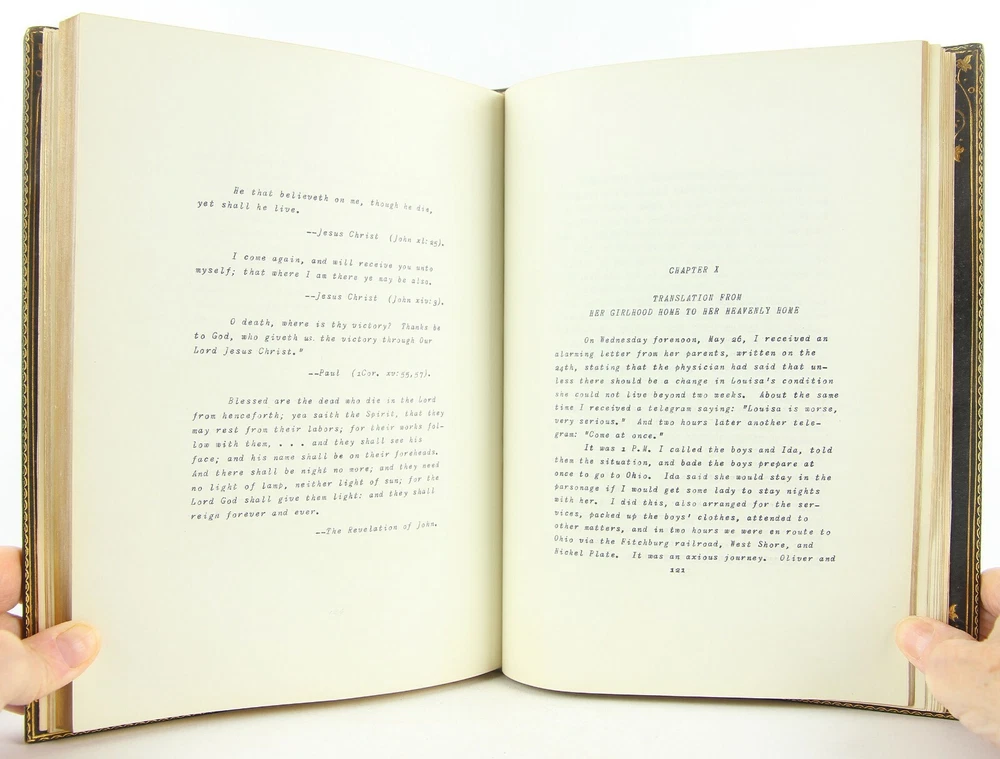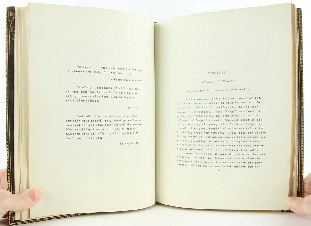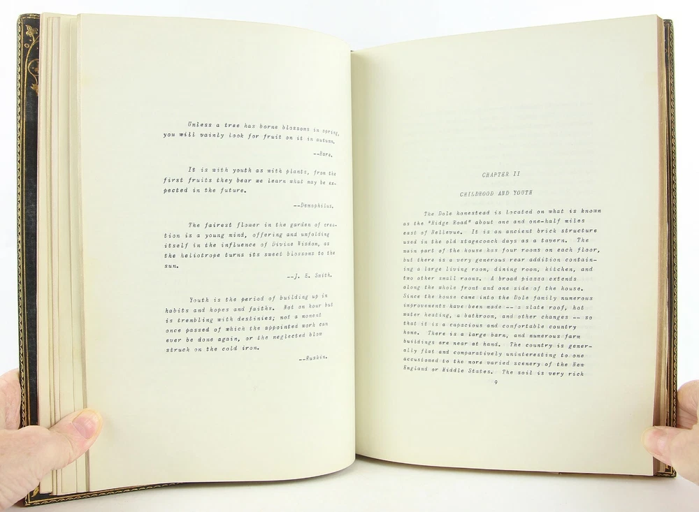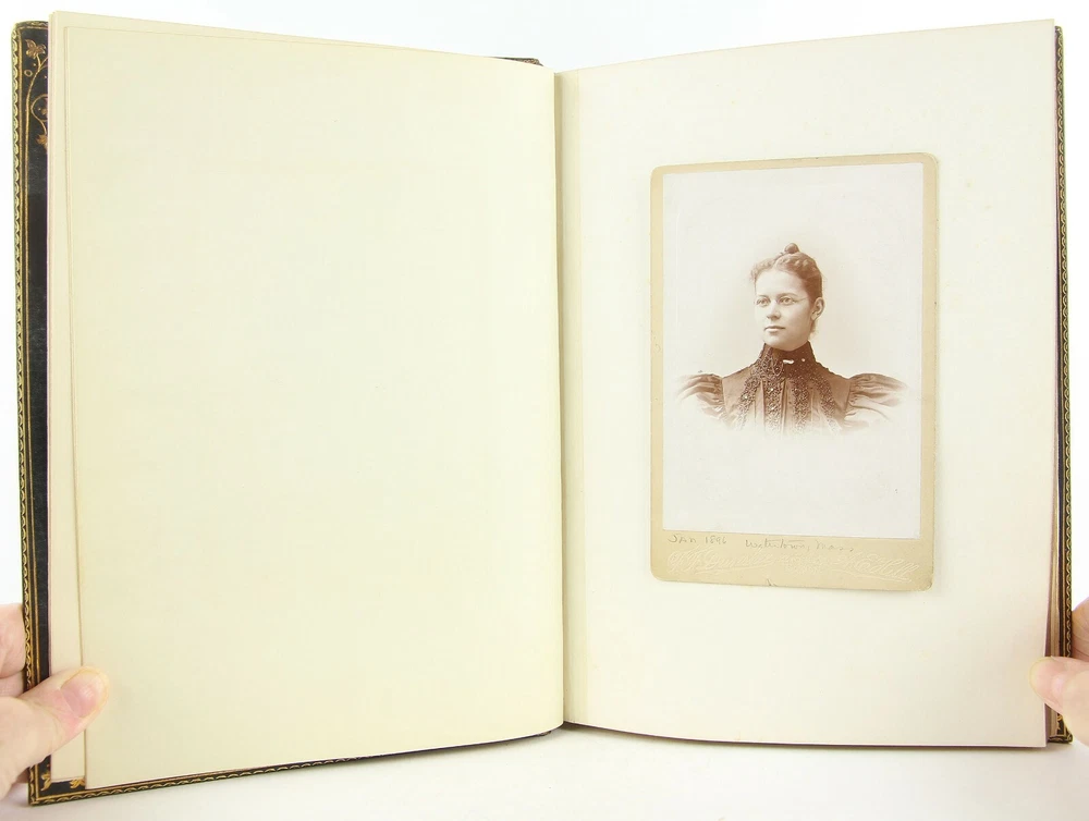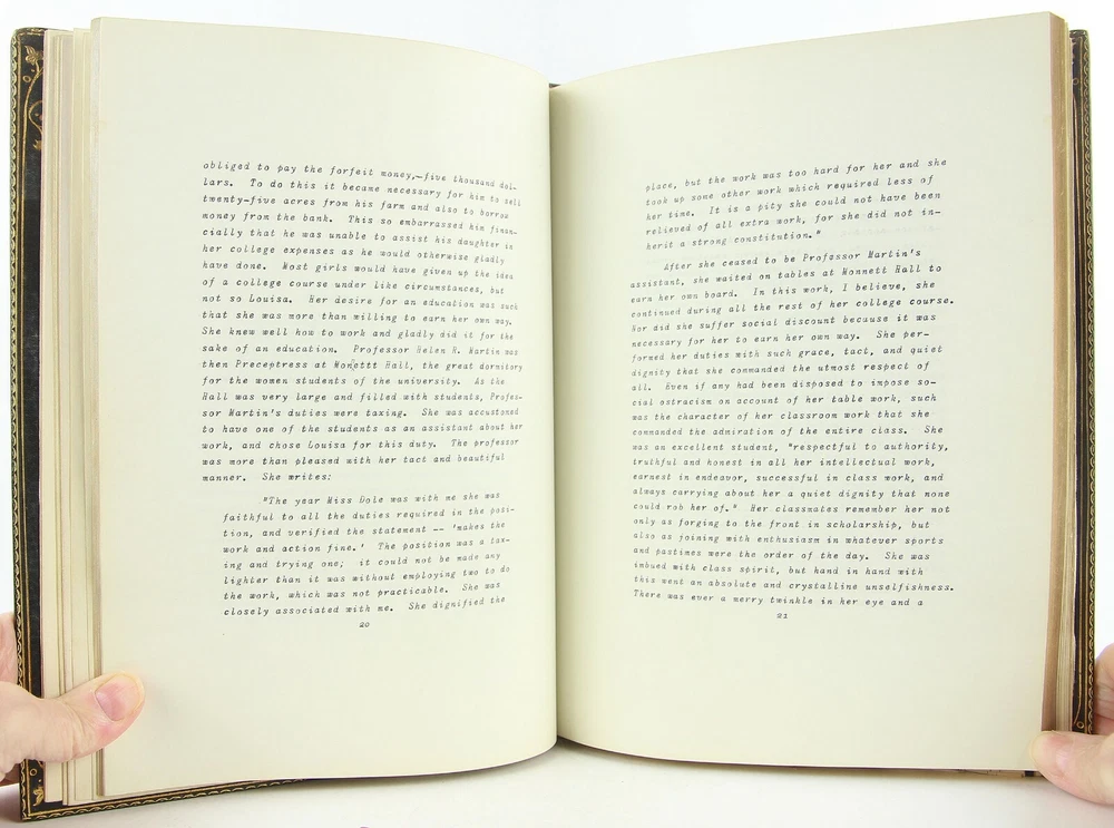 Sketch of the Life and Character of Louisa Maria Dole Hutchinson Prepared by Her Husband, The Rev. Oliver W. Hutchinson, For Their Sons, Oliver Wesley Hutchinson and Eliot Dole Hutchinson by Rev. Oliver W. Hutchinson 1909 O.W. Hutchinson (Bellevue, Ohio), an exquisitely bound volume, 8 x 11 1/8 inches tall x 1 1/4 inches thick full grain embossed leather bound, five raised bands to spine, gilt lettering to front cover, all page edges gilt, inlaid two-tone leather front and rear pastedowns framed by gilt dentelles, silk moire endpapers, neat type script profusely illustrated with tipped-in period photographs, and original family documents and press clippings throughout, signed by the author in period ink on the introduction, [13], 146, [13] pp. plus additional family memorabilia tipped onto blank rear free-endpapers, and laid in at the rear of the volume. Slight to moderate staining, rubbing and edgewear to covers. Slight bumping to the upper tips. Otherwise, in very good condition - clean, bright and unmarked. A seemingly unique work, not listed in OCLC or other indexes. A remarkable, apparently unique and uncatalogued 1909 biography and tribute to Louisa Maria (Dole) Hutchinson (1869-1909) of Bellevue, a small town in Huron County in northern Ohio. Written by her grieving husband to memorialize her for his sons, it is a poignant and meticulously written work, combining biography with personal reminiscences with a paean to the woman he loved, who was taken at the age of 39 from him and their two sons. The author, a Methodist minister, Rev. Oliver Wertz Hutchinson (1856-1922), appears to have completed the work on Thursday, November 4, 1909, the day he signed the introduction, just five months after her death. Contents: Introduction Genealogy Childhood and Youth Student and Teacher: Life at the Ohio Wesleyan University Love and Marriage Life at Medford: First Year in a Parsonage Life at Watertown Life at Cambridge Life at Leominster Removal to Holyoke Translation from Her Girlhood Home to Her Heavenly Home An incredibly lucid and even vivid portrait of the life of a young wife of a Methodist minister in the Midwest at the turn of the twentieth century.