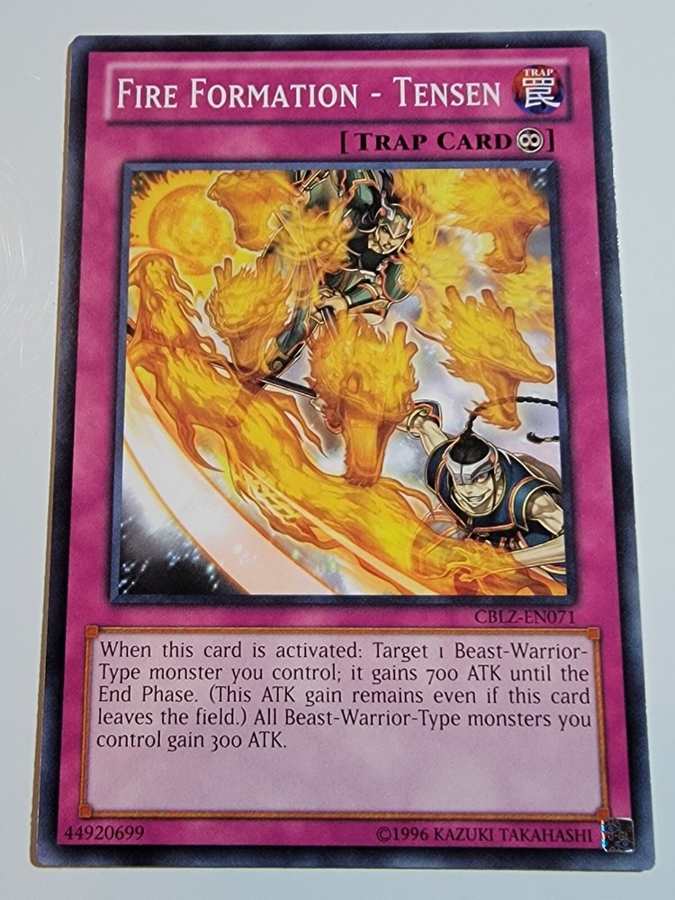Fire Formation - Tensen CBLZ-EN071 Common Unlimited Yugioh. Overall lightly played condition. (Please reference pictures for c osmetic condition). Take advantage of our multi item discount!!! When you buy 2 items you will have the opportunity to select a 3rd item of equal our lesser value for free from our whole inventory. (Must use Ebay's shopping cart feature in order to take advantage of this discount). If you have any inquiries please feel free to message us and we will respond as soon possible, usually within 24 hours. SHIPPING We almost always use USPS as our primary SHIPPING service. We ship within 24 hours of receipt of payment and will always provide tracking, unless otherwise stated in the listing. (We reserve the right to use a different carrier or service). FEEDBACK Your FEEDBACK is important to us as a growing small business. If for any reason you are unhappy with your transaction, please message us and we will do everything in our power to make it right. Returns Returns are accepted within 30 days of confirmation of delivery. If there is anything you are unhappy about with your purchase please message us and we will respond within 24 hours to your concerns. Thank you for supporting our small business. We appreciate your valued business with us and look forward to serving you in the future. Dan & Tonya Dio's Eclectic Treasures