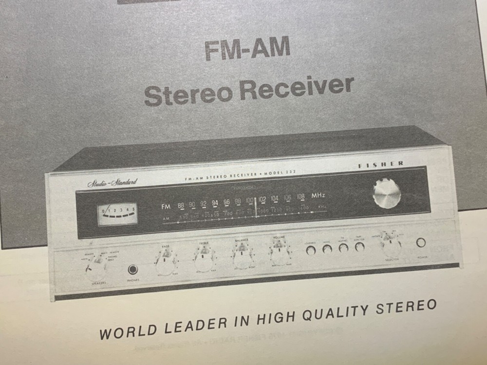 I am selling an Original Fisher 232 Receiver Service Manual.. Item was used at a repair center .. Item will be shipped USPS First Class or Media Mail.....