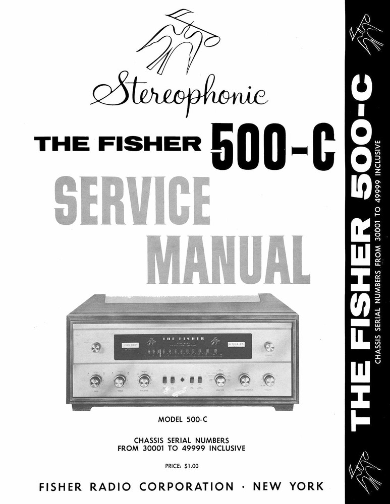 For sale is reprint of Fisher 500-C Service Manual for Chassis serial number 30001 to 49999. Dated 1963. Service Manual is 4 pages long, include part list and two 11x17 foldouts of Circuit Diagrams. Real Paper Manual. Quality Printed and Comb Bound. Printed from available copy or scanned from original at 800dpi, restored in Photoshop, Laser printed on premium acid free paper, they will serve for years. Most manuals Include foldout of Circuit Diagram. Cover page printed on Cover Stock.