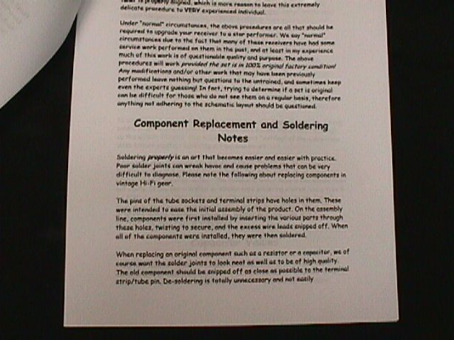 Fisher 800-B Vacuum Tube Receiver Restoration Kit Ignore generic pictures you get the correct stuff! Fisher receivers are the BEST receivers ever made by any company - don't yours deserve the best ?! Here is the VERY BEST Fisher receiver restoration kit that money can buy! We are and always will be the only source qualified to offer ACCURATE and COMPLETE Resto-Pak Restoration Kits - in fact many of our imitators and/or "competitors" actually have purchased our restoration kits in an attempt to see what secrets we build into our restored units! Is your receiver running hot enough to roast tonight's dinner?? Are your output tube plates glowing RED (check them in total darkness - you might be surprised!) Does your FM stereo sound weakish and out of phase?? Does you receiver simply just don't sound "right"?? DON'T LET YOUR RECEIVER ROAST ITSELF TO DEATH! Your FIFTY YEAR OLD Fisher NEEDS a Fisher RESTO-PAK NOW !!!!! This is the affordable next best thing to a professional hands on Restoration. These kits are custom designed. Our Resto-Pak Restoration kits are WORLD FAMOUS! HUNDREDS of our kits have been installed worldwide for over 15 YEARS and these happy Fishers are still happily singing! DO NOT BE INTIMIDATED! Receiver restoration is NOT the terrible chore one may think it is. This kit provides the BASIC FOUNDATION for good operation and is EXTREMELY beneficial for any receiver that is mostly functional and in need of being refreshed and upgraded. Our kits cover EVERYTHING! BIAS SUPPLY! TUNER FM De-Emphasis Stereo AND Mono! PHONO AND PREAMP STAGES! AMPLIFIER with CIRCUIT PROTECTION! AND MORE! As you may (or may not) be aware, Fisher receivers have substantial problems in the biasing of the output tubes. They were biased WAY to hot even as new, and as the selenium bias rectifier ages, the bias supply voltage gets weaker and weaker. With some luck, the power transformer won't fail. It WILL , however, always be operating at excessively high temperatures due to the strain. OUTSTANDING color pictures including detailed pictures of a MPX board removed from the set so you can see components clearly! The eventual and inevitable result is that your precious set is running hotter and hotter until final failure forces restoration, and the replacement of some costly output tubes! As it is, the 7591 tubes are aging at a VERY accelerated rate due to INCORRECT BIASING causing high idling currents. This can and MUST be corrected before the set is used for any length of time. As an added benefit, the power supply will operate in a more relaxed fashion, and the much cooler operating temperatures will be immediately noticed. Just think of all the stress the power transformer is under, and this power and output tube life is being wasted just to generate HEAT , even when NO music is playing! In addition, ALL of the small electrolytics have developed leakage and other age related problems. The original mylar signal caps are now fragile and leaky after 60 years of heat and torture. The failure of a coupling capacitor or shorted tube can easily spell disaster for an output transformer! Good soldering skills and the ability to follow a schematic are required, although if you know which end of a soldering iron to hold you should not encounter any major problems. Our RESTO-PAKS contain the finest quality modern components available today. This includes ALL small electrolytic capacitors as well as ALL signal and coupling capacitors that normally fail. Approximately 26 individual components in all need to be installed/replaced. Yes it will take some time, however, it is a very thorough process. We include an enlarged copy of the entire Operating Manual, COMPLETE Fisher Service Manual for YOUR serial number, and our custom developed THIRTY TWO PAGE Restoration Guide with FULL COLOR photos of the MPX! Also included are the very important specific resistors and parts required to correct the FM De-emphasis. FM De-emphasis is 75 us (microseconds) which is the North American standard. ALL Fisher stereo tube receivers and tuners employ excessive De-emphasis and therefore are NOT de-emphasizing the FM audio at the proper rate. The result is a loss of natural highs due to the attenuation of the high frequency response in Mono and Stereo. When corrected (a simple change of a few components which are included in EVERY RESTO-PAK ) the result is astounding. In fact, we include 1% precision resistors for this application to ensure extremely accurate De-emphasis is achieved and maintained. We can modify the Resto-Pak for the European Standard of 50us at no extra charge! Also, a new, heavy duty Silicon Bias rectifier is supplied, and output tube BIAS setting instructions and parts are included. New super heavy duty power supply diodes and VERY detailed instructions are included as well. Output transformer protection is achieved, and the installation of our kit will provide the ability to determine the PRECISE degree to which your output tubes are matched using only a digital DC voltmeter! Our package includes a nice enlarged copy of the original owners manual, the CORRECT service manual for your specific unit (determined by the serial number), and our detailed restoration procedure covering everything except alignment (which is covered in the service manual, however, test equipment is needed). The procedure instructs how to correct all weak spots in the unit, such as checking the specialized MPX filters which tend to drift in value thereby affecting audio response, balance, etc. Also, the benefits of cathode resistor installation on each output tube are explained in detail. In addition, several weak spots in the Stereo Multiplex circuit are addressed - components that (as these glorious units continue to age) in recent years have shown signs of significant failure rates that now warrant replacement - and these are ALL included as well in our kit. All capacitors that must be changed in the entire set are noted in the manuals on an ind