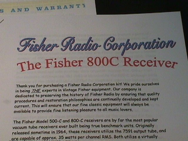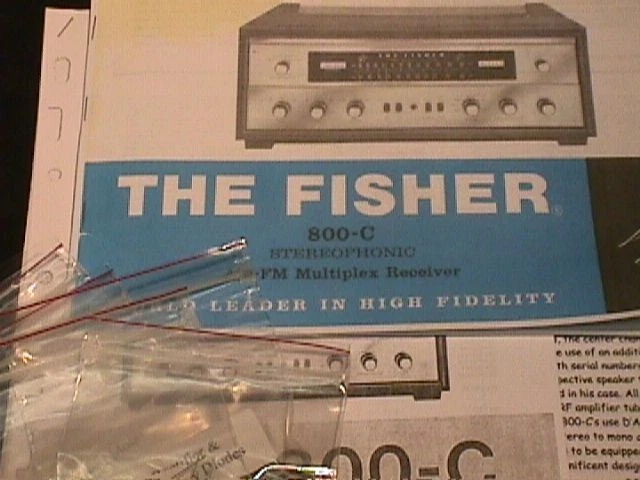 Fisher 800-C Vacuum Tube Receiver Restoration Kit Fisher receivers are the BEST receivers ever made by any company - don't yours deserve the best ?! Here is the VERY BEST Fisher receiver restoration kit that money can buy! We are and always will be the only source qualified to offer ACCURATE and COMPLETE Resto-Pak Restoration Kits - in fact many of our imitators and/or "competitors" actually have purchased our restoration kits in an attempt to see what secrets we build into our restored units! Is your receiver running hot enough to roast tonight's dinner?? Are your output tube plates glowing RED (check them in total darkness - you might be surprised!) Does your FM stereo sound weakish and out of phase?? Does you receiver simply just don't sound "right"?? DON'T LET YOUR RECEIVER ROAST ITSELF TO DEATH! Your FIFTY YEAR OLD Fisher NEEDS a Fisher RESTO-PAK NOW !!!!! This is the affordable next best thing to a professional hands on Restoration. These kits are custom designed. Our Resto-Pak Restoration kits are WORLD FAMOUS! HUNDREDS of our kits have been installed worldwide for over 15 YEARS and these happy Fishers are still happily singing! DO NOT BE INTIMIDATED! Receiver restoration is NOT the terrible chore one may think it is. This kit provides the BASIC FOUNDATION for good operation and is EXTREMELY beneficial for any receiver that is mostly functional and in need of being refreshed and upgraded. Our kits cover EVERYTHING! BIAS SUPPLY! TUNER FM De-Emphasis Stereo AND Mono! PHONO AND PREAMP STAGES! AMPLIFIER with CIRCUIT PROTECTION! AM Coupling Capacitor AND MORE! As you may (or may not) be aware, Fisher receivers have substantial problems in the biasing of the output tubes. They were biased WAY to hot even as new, and as the selenium bias rectifier ages, the bias supply voltage gets weaker and weaker. With some luck, the power transformer won't fail. It WILL , however, always be operating at excessively high temperatures due to the strain. OUTSTANDING color pictures including detailed pictures of a MPX board removed from the set so you can see components clearly! The eventual and inevitable result is that your precious set is running hotter and hotter until final failure forces restoration, and the replacement of some costly output tubes! As it is, the 7591 tubes are aging at a VERY accelerated rate due to INCORRECT BIASING causing high idling currents. This can and MUST be corrected before the set is used for any length of time. As an added benefit, the power supply will operate in a more relaxed fashion, and the much cooler operating temperatures will be immediately noticed. Just think of all the stress the power transformer is under, and this power and output tube life is being wasted just to generate HEAT , even when NO music is playing! In addition, ALL of the small electrolytics have developed leakage and other age related problems. The original mylar signal caps are now fragile and leaky after 50 years of heat and torture. The failure of a coupling capacitor or shorted tube can easily spell disaster for an output transformer! Good soldering skills and the ability to follow a schematic are required, although if you know which end of a soldering iron to hold you should not encounter any major problems. Our RESTO-PAKS contain the finest quality modern components available today. This includes ALL small electrolytic capacitors as well as ALL signal and coupling capacitors that normally fail. Approximately 37 individual components in all need to be installed/replaced. Yes it will take some time, however, it is a very thorough process. We include an enlarged copy of the 17 page Operating Manual, 12 page Service Manual for YOUR serial number, and our custom developed Thirty Four PAGE Restoration Guide with FULL COLOR photos! Also included are the very important specific resistors and parts required to correct the FM De-emphasis. FM De-emphasis is 75 us (microseconds) which is the North American standard. ALL Fisher stereo tube receivers and tuners employ excessive De-emphasis and therefore are NOT de-emphasizing the FM audio at the proper rate. The result is a loss of natural highs due to the attenuation of the high frequency response in Mono and Stereo. When corrected (a simple change of a few components which are included in EVERY RESTO-PAK ) the result is astounding. In fact, we include 1% precision resistors for this application to ensure extremely accurate De-emphasis is achieved and maintained. We can modify the Resto-Pak for the European Standard of 50us at no extra charge! Also, a new, heavy duty Silicon Bias rectifier is supplied, and output tube BIAS setting instructions and parts are included. New super heavy duty power supply diodes and VERY detailed instructions are included as well. Output transformer protection is achieved, and the installation of our kit will provide the ability to determine the PRECISE degree to which your output tubes are matched using only a digital DC voltmeter! Our package includes a nice enlarged copy of the original owners manual, the CORRECT service manual for your specific unit (determined by the serial number), and our detailed restoration procedure covering everything except alignment (which is covered in the service manual, however, test equipment is needed). The procedure instructs how to correct all weak spots in the unit, such as checking the specialized MPX filters which tend to drift in value thereby affecting audio response, balance, etc. Also, the benefits of cathode resistor installation on each output tube are explained in detail. In addition, several weak spots in the Stereo Multiplex circuit are addressed - components that (as these glorious units continue to age) in recent years have shown signs of significant failure rates that now warrant replacement - and these are ALL included as well in our kit. All capacitors that must be changed in the entire set are noted in the manuals on an individual basis with crystal clear instructions.