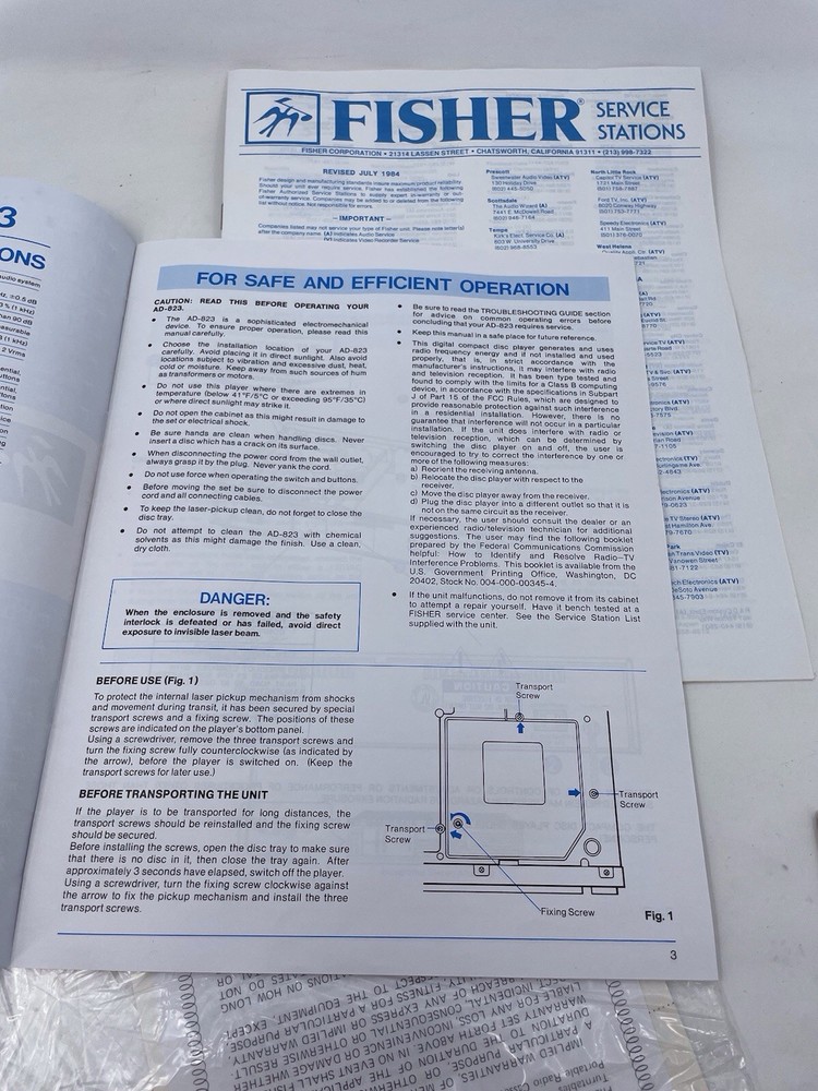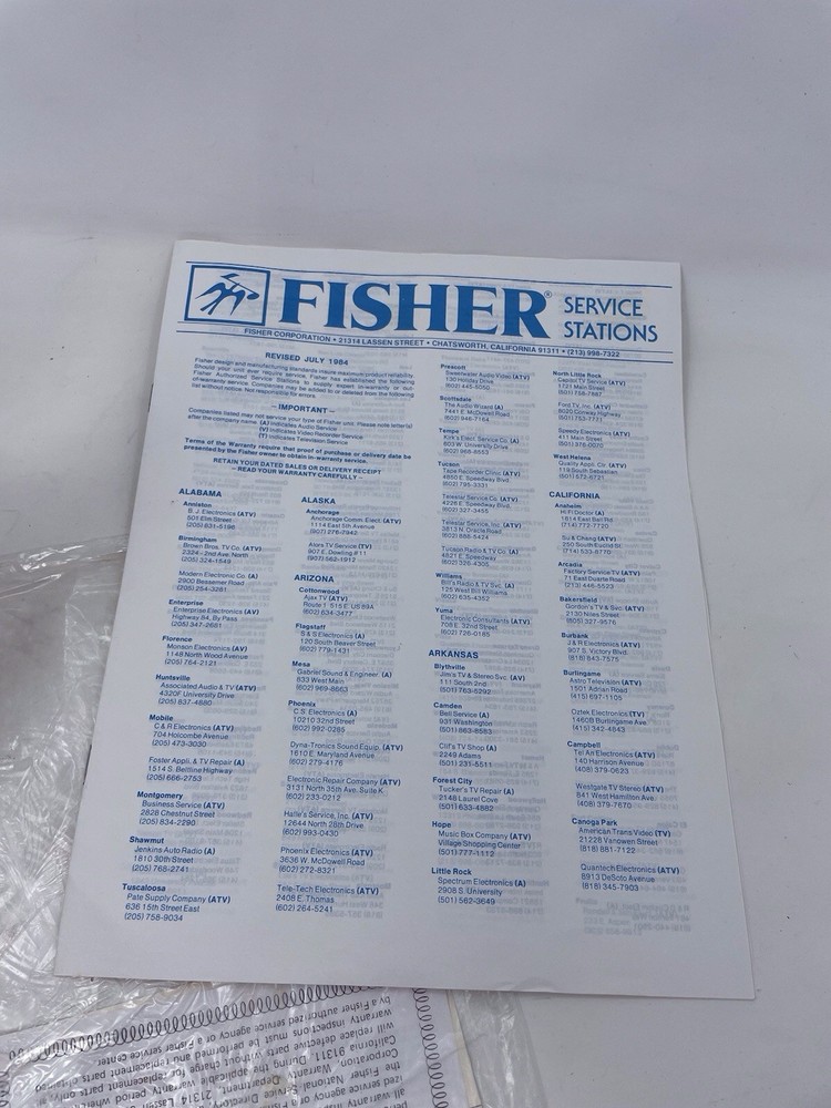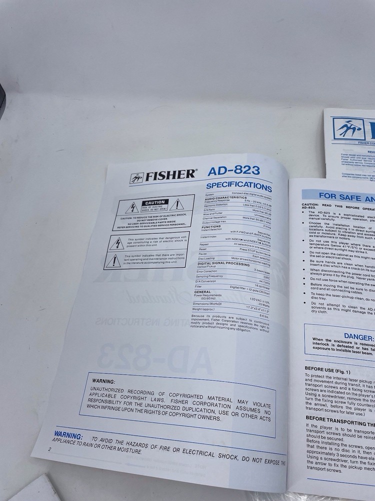 Fisher AD-823 Operating Instructions Digital Compact Disc Player Service Station *Please look closely and enlarge photos to see all details as they are part of the description. Please know your sizes, as to avoid an unnecessary return which you will have to pay shipping. I am not an expert but I do try to inspect all items and describe them and any flaws to the best of my ability. Any errors or omissions are totally unintentional. * Please contact me prior to purchase if you would like additional photos or with any questions you may have as all items are sold "as is" and all sales are final unless the items has been misrepresented in some way. * Items are shipped within 1 business days after receipt of payment and great care is taken when packing for shipment. The USPS shipping method may be changed depending on size, weight and your zip code. * FEEDBACK - Please leave feedback after your item is delivered so we will know you have received your item and are pleased with your purchase. Your positive feedback is greatly appreciated and I will gladly do the same for you. If there is a problem, please contact me through email prior to leaving feedback