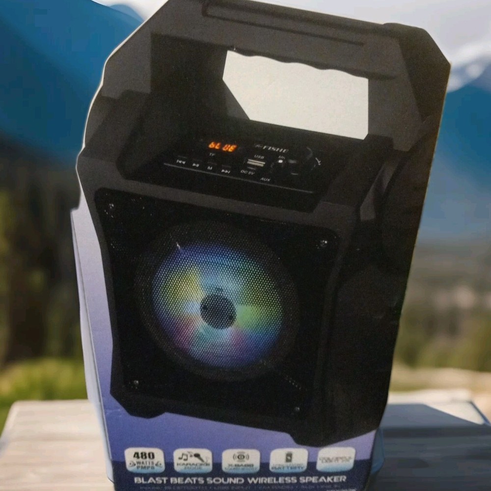 New open box The Fisher Blast Beats Portable Bluetooth Speaker FBX262K is a versatile and powerful portable speaker system in black color. With wireless connectivity options like Bluetooth 5.0 and true wireless stereo technology, this speaker allows for seamless integration with various devices. It features a long-lasting battery, a karaoke mode, X-Bass sound boost, and colorful light effects for an immersive audio experience. The illuminated design and carrying handle make it convenient to take on the go, while the 480 watts PMPO output delivers clear and crisp sound for all your music needs.
