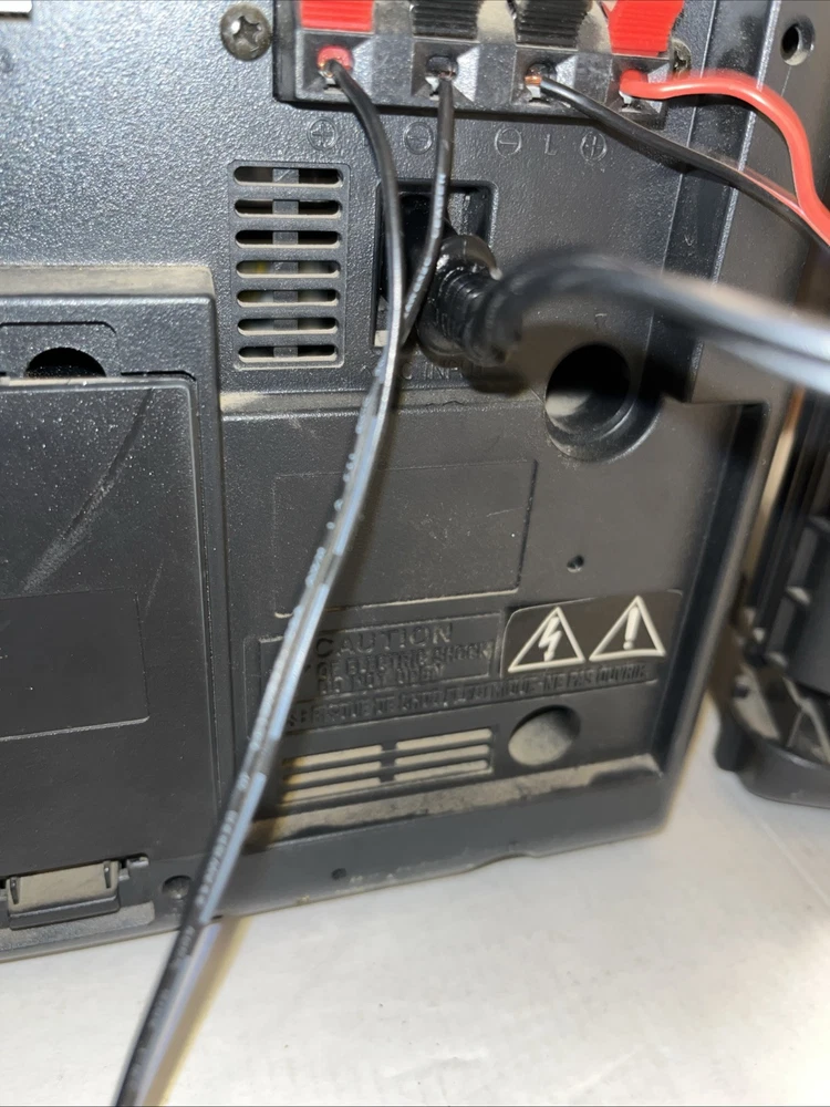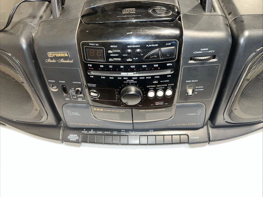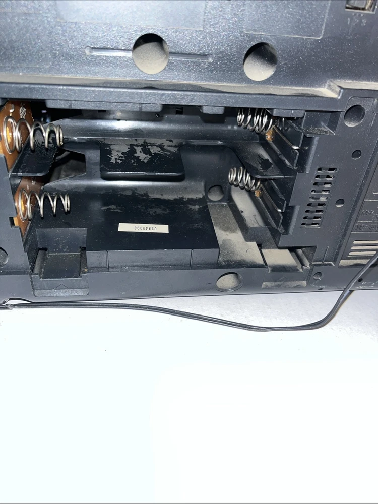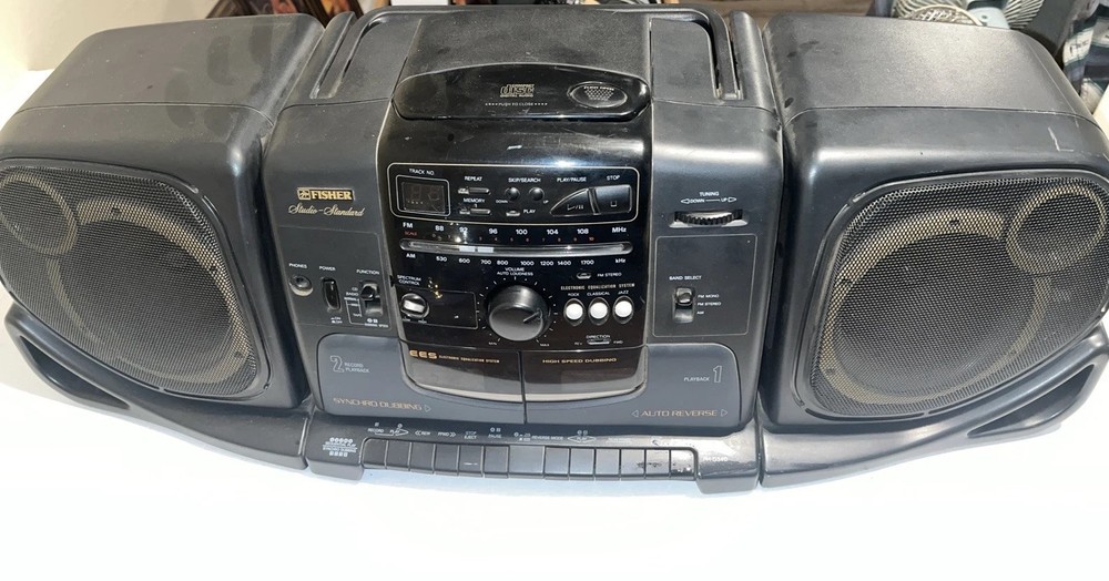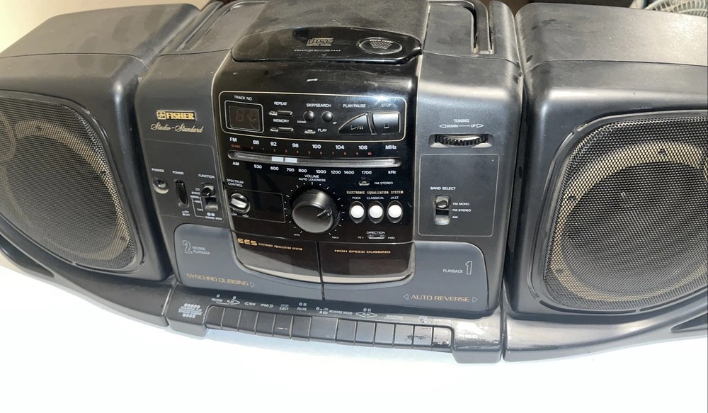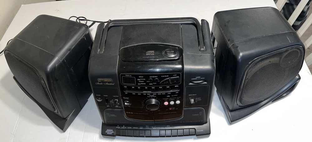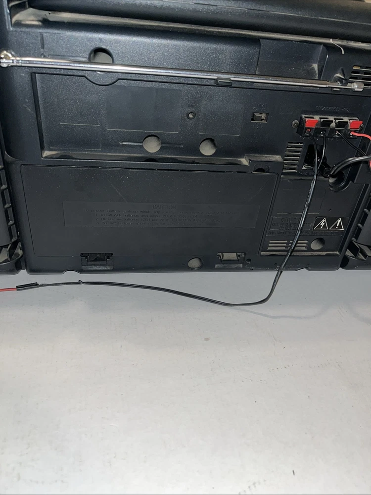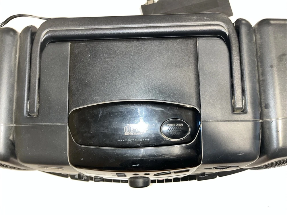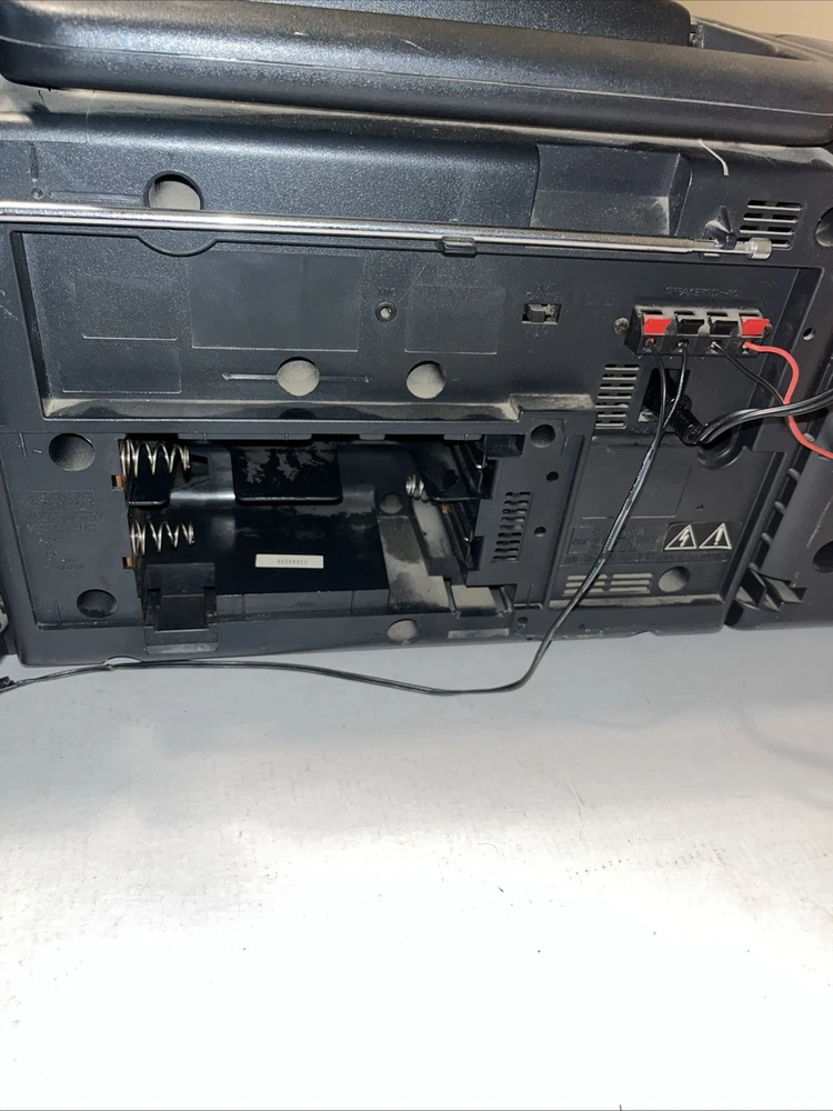 Radio Works speakers work probably needs some new speaker wire. I put a CD in there. It did not play the CD, but it spins. I have not tested out the tape decks yet, but AM/FM radio works sound works comes with power cord battery cover a good project for somebody who knows how to fix it. Please see pictures for all details.
