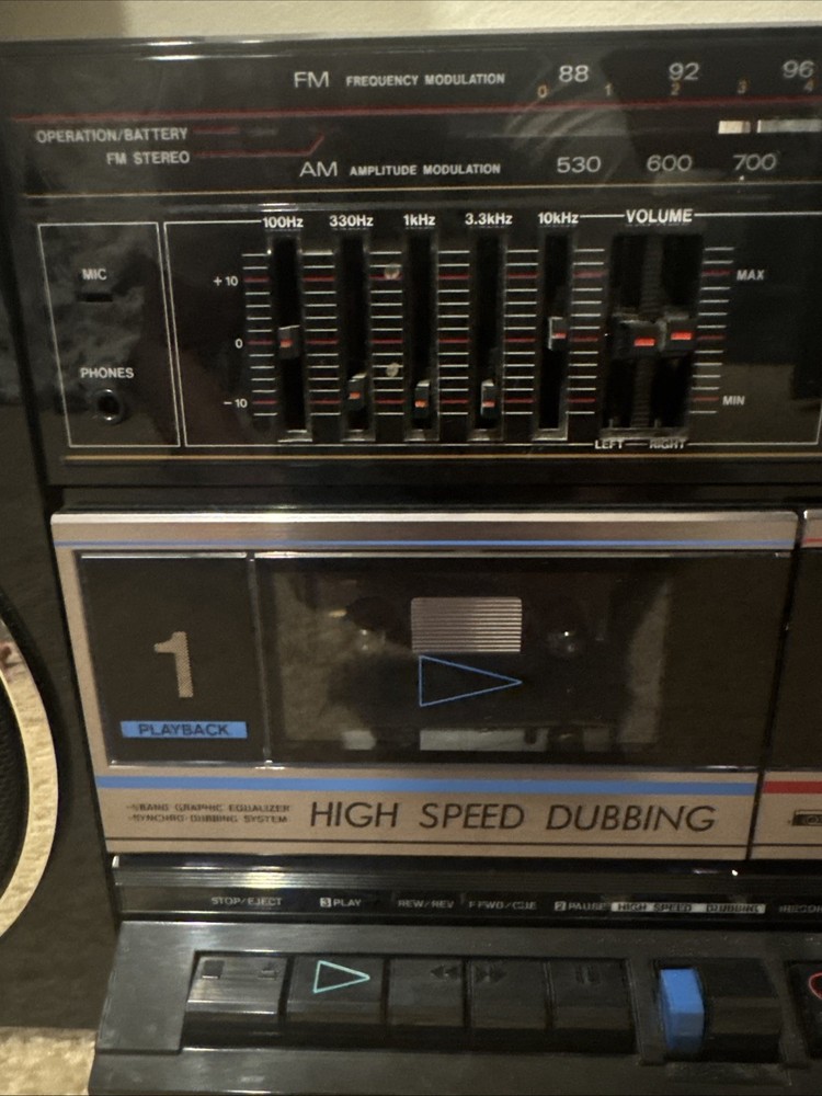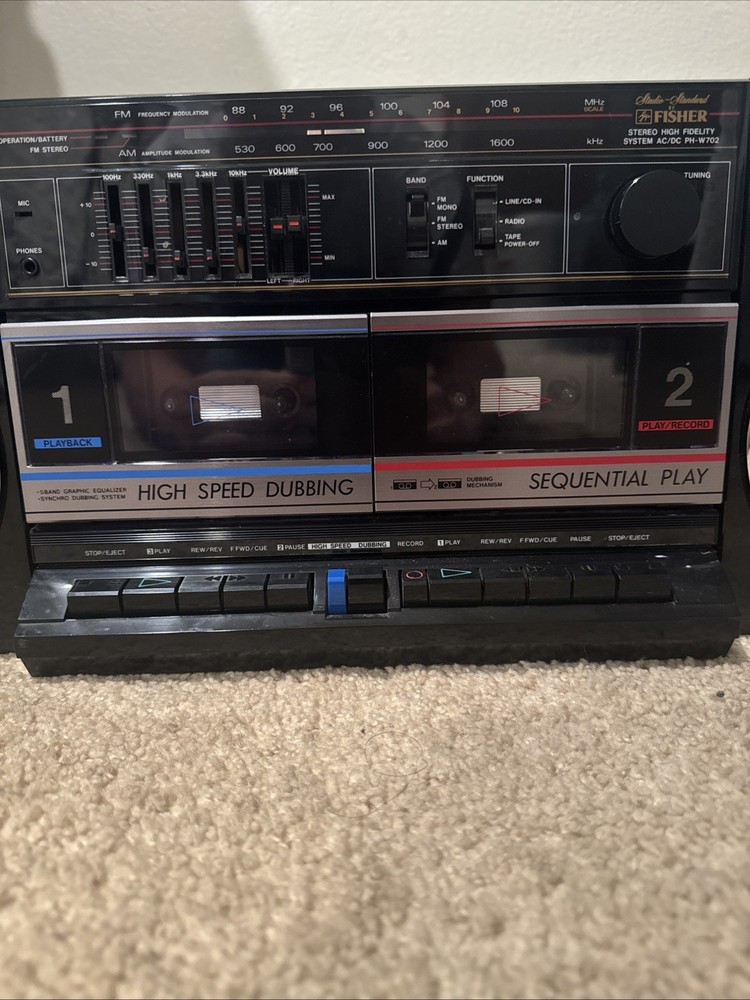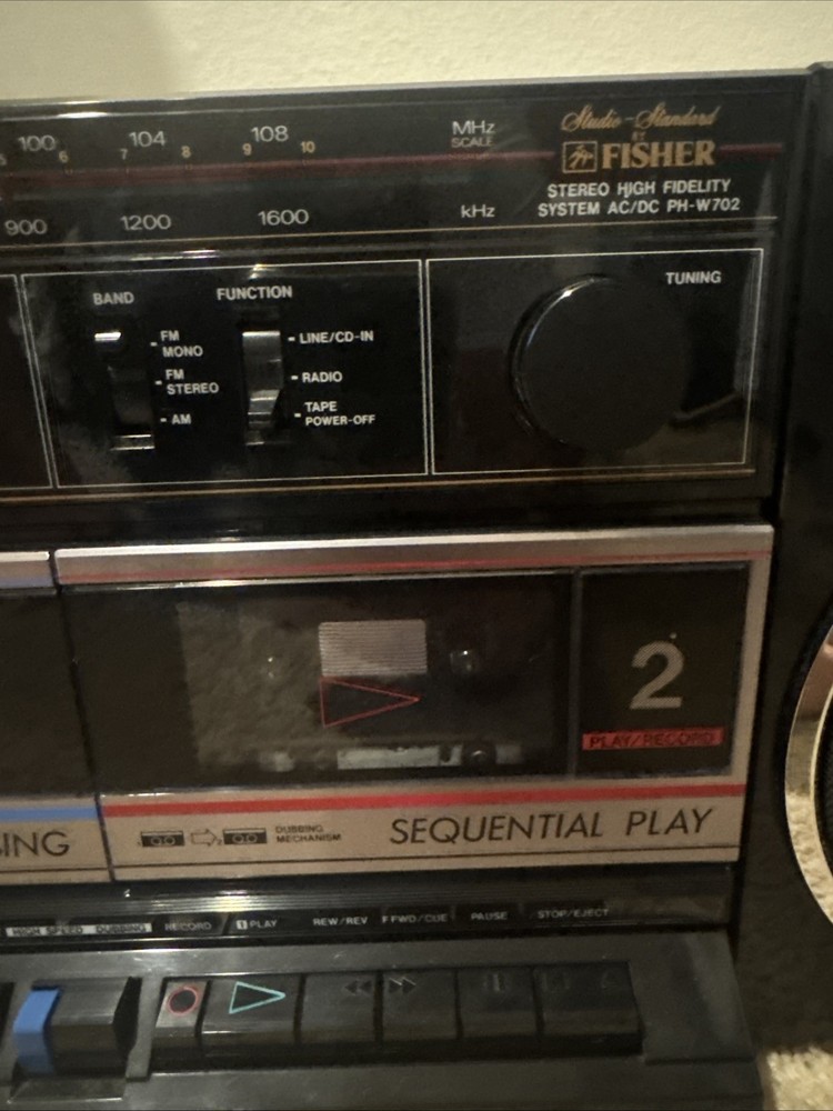 The Fisher Boombox PH-W702 is an 80's boombox that works but the tape doesn't. It has a black color and features an FM/AM stereo connectivity, AM/FM band, headphone jack, cassette tape, Hi-Fi amplifier, and a model number of PH-W702. This boombox is perfect for anyone looking for a vintage audio experience.(12#5)