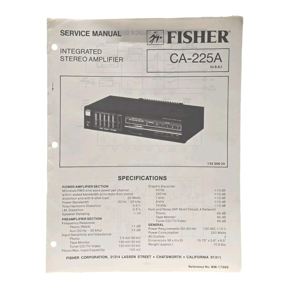 This is a service manual for the Fisher CA-225A integrated stereo amplifier. This manual also has the schematics. Please message me if you have any questions, and I thank you so very much for looking at my Fisher stereo amplifier service manual.