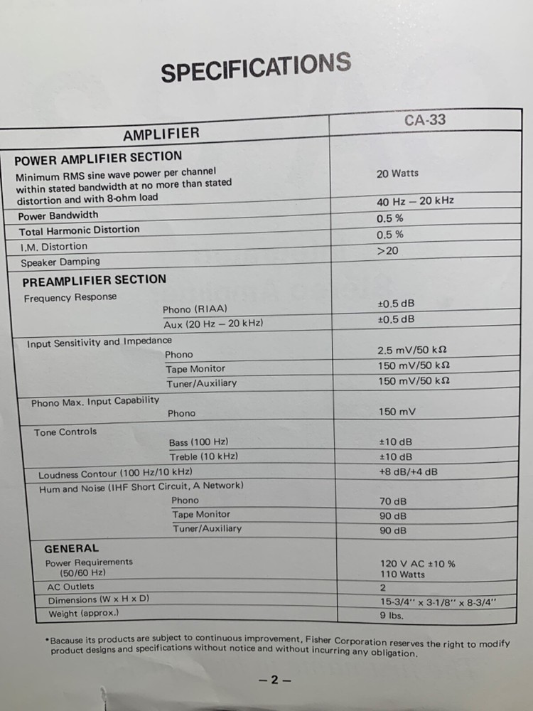I am selling a Fisher CA-33 Service Manual Integrated Stereo Amplifier Original.. Item was used at a repair center .. Item will be shipped USPS First Class or Media Mail.....