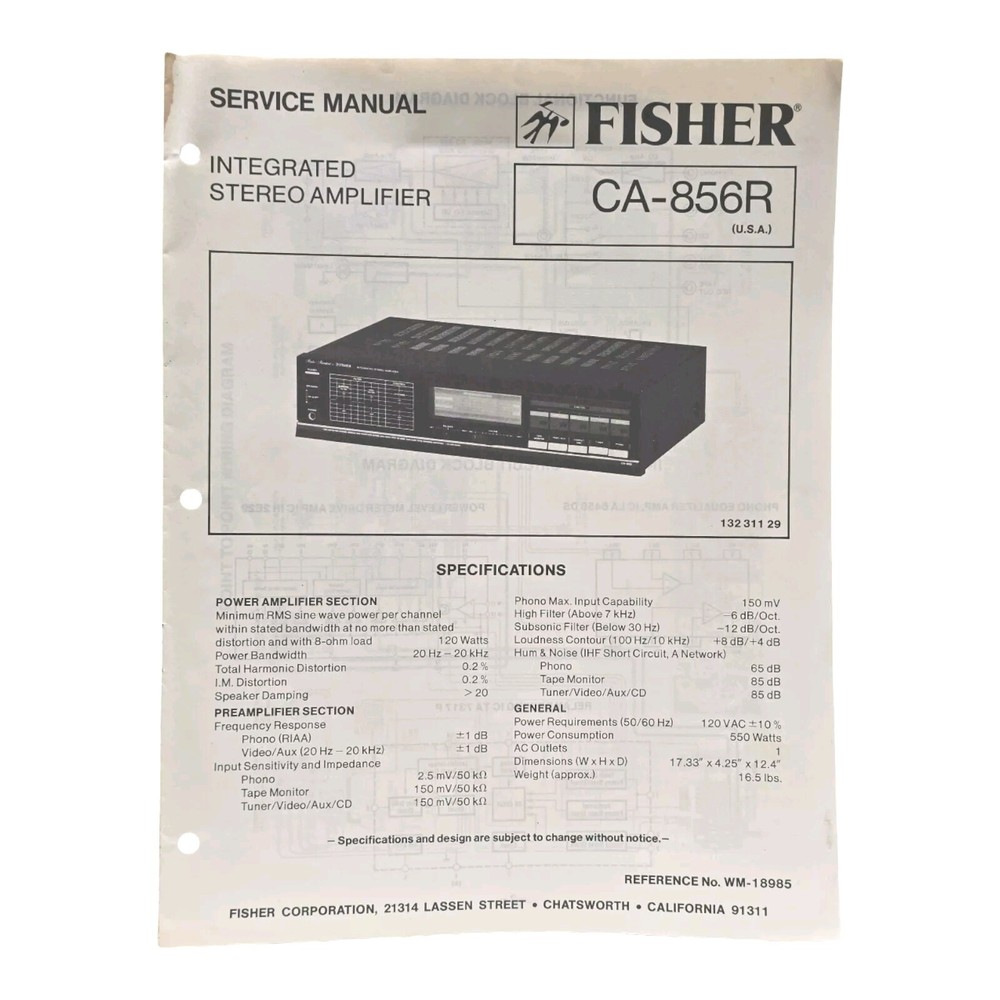 This is a service manual for the Fisher CA-856R integrated stereo amplifier. This manual also has the schematics. Please message me if you have any questions, and I thank you so very much for looking at my Fisher stereo amplifier service manual.