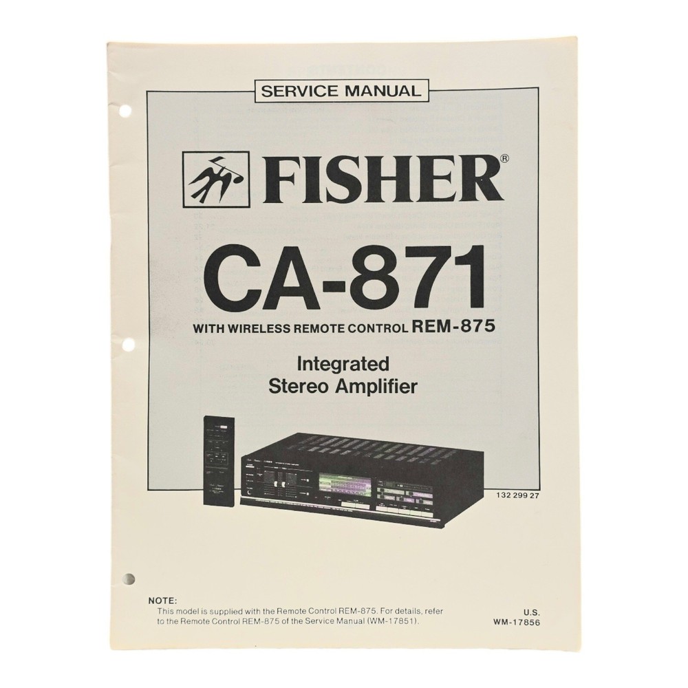 This is a service manual for the Fisher CA-871 (with wireless remote REM-875) integrated stereo amplifier. This manual also has the schematics. Please message me if you have any questions, and I thank you so very much for looking at my Fisher stereo amplifier service manual.