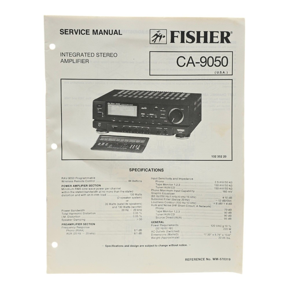This is a service manual for the Fisher CA-9050 integrated stereo dc amplifier. This manual also has the schematics. Please message me if you have any questions, and I thank you so very much for looking at my Fisher stereo amplifier service manual.
