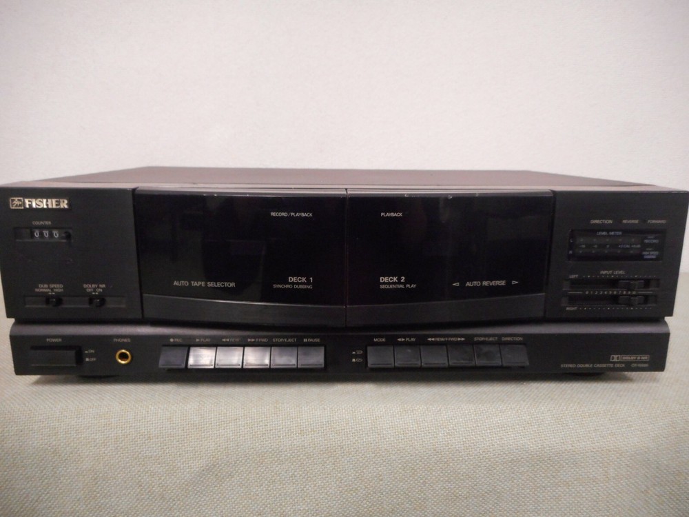 Vintage Fisher dual cassette player/recorder. Features: auto reverse, auto tape selector, Dolby B-C NR, synchro dubbing sequential play, tape counter, record level meter, dual RCA In/Out and headphone out. Has scratches (see pictures), tested and fully functional.