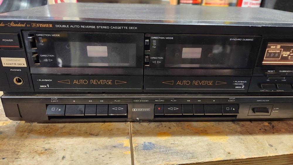 nice looking Fisher double cassette deck. motor runs. belts are probably broken. I am listing several cassette decks that are not working, probably all broken belts. being sold as is with no warranty.