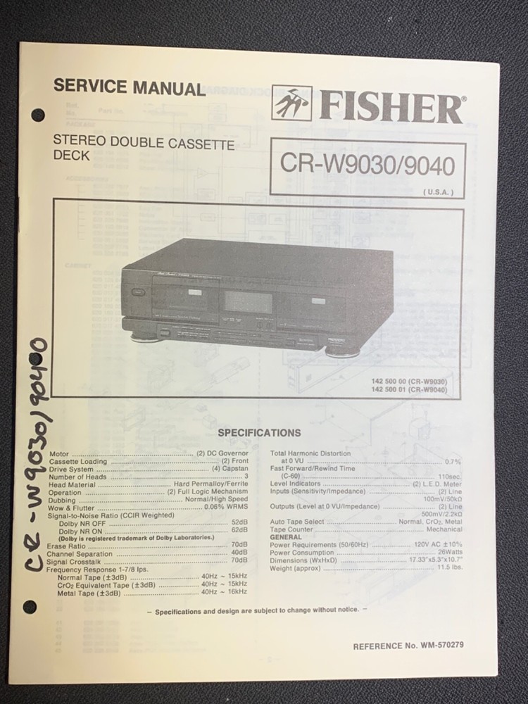 I am selling a Fisher CR-W9030/9040 Service Manual Stereo Double Cassette Deck Original.. Item was used at a repair center .. Item will be shipped USPS First Class or Media Mail.....