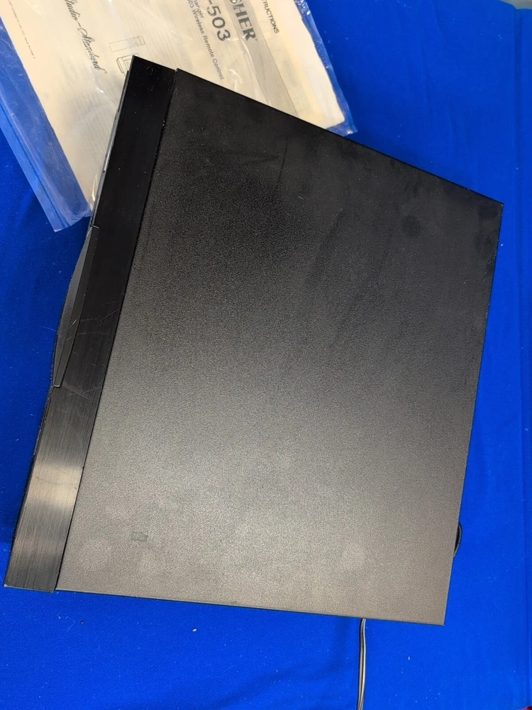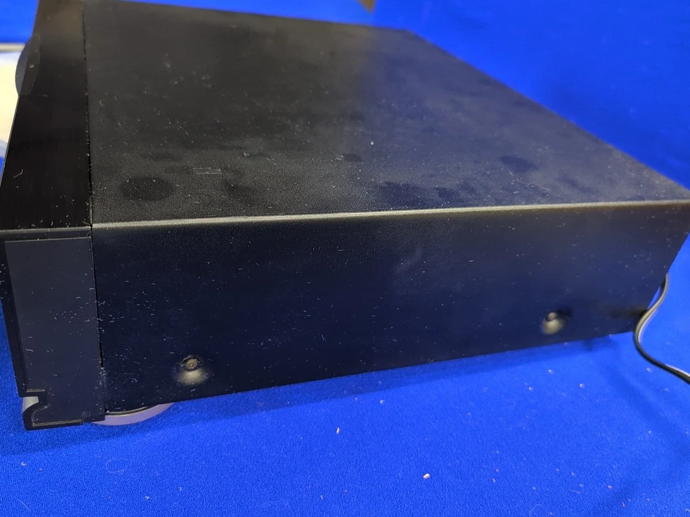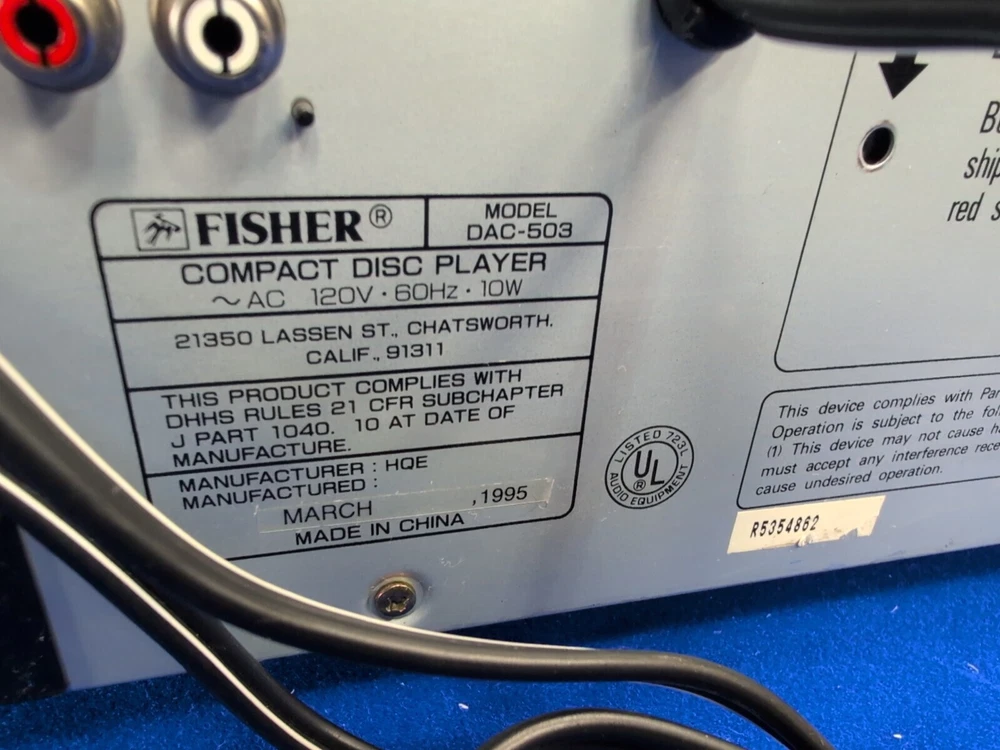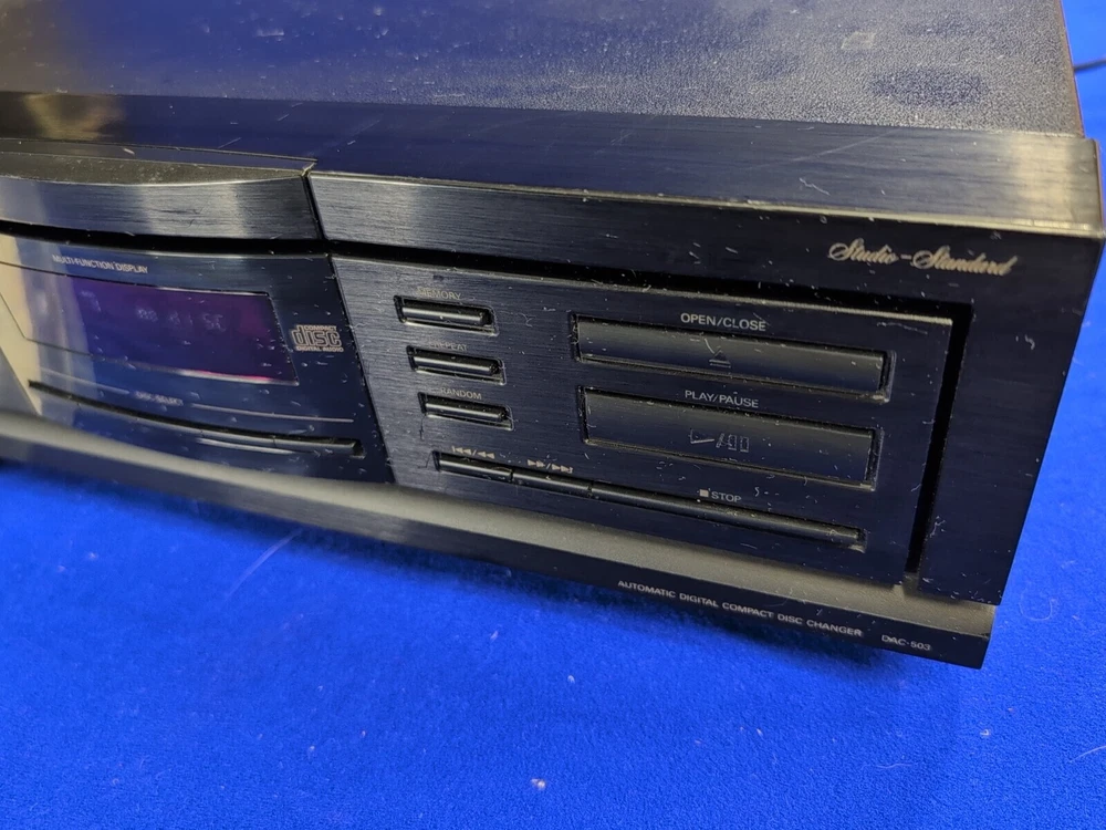 This Fisher DAC-503 CD changer is a vintage 1995 model that can hold up to 5 CDs. It has a 3-inch screen size and a black color that complements any home audio setup. The unit measures 16 inches in length, 5 inches in height, and 15.5 inches in width. This 1st generation CD changer features RCA audio outputs and a stereo L/R RCA audio input. It also has a CD changer capacity of 5 discs, making it perfect for those who want a hassle-free music listening experience. The Fisher DAC-503 CD changer is a great addition to any home audio system and is sure to impress with its functionality and sleek design. Unit cleaned and tested. The tray is picky about being level but functions as intended. Great vintage piece!