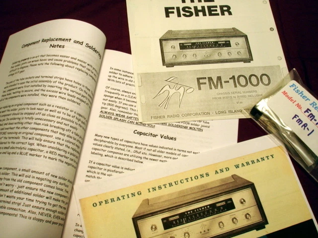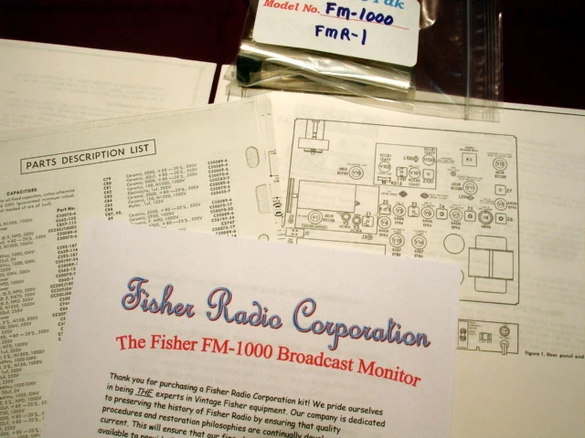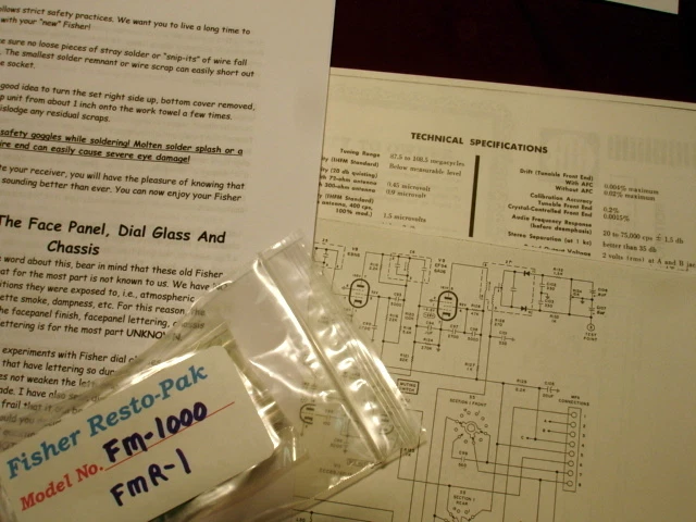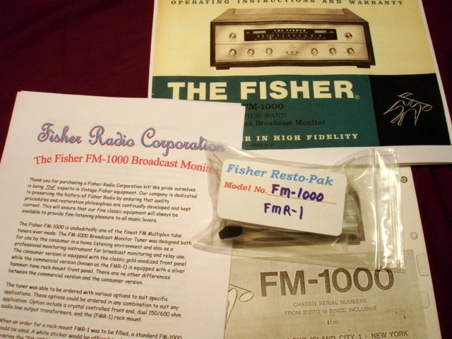 Fisher FM-1000 and FMR-1 Broadcast Monitor Tuner Resto-Pak Restoration Kit! Here it is. FINALLY! Requests for this kit have been POURING in for some time. We have had a kit for the FM-1000 Stereo Tuner and its identical twin the rack mounted FMR-1 for years and are finally now offering it on your favorite site where we all seem to find everything including the impossible. This is the VERY BEST Fisher FM-1000 FMR-1 vacuum tube tuner restoration kit with FULL COLOR PHOTOS that money can buy. Does your FM multiplex stereo sound weakish and out of phase?? Time to change that old, tired Selenium Rectifier? Is Oscar Peterson getting tinny sounding? Is your tuner just not sounding "right"?? You NEED a Fisher RESTO-PAK NOW! This is the affordable next best thing to a professional hands on Restoration by the "Doc" as These kits were custom designed by him Our Resto-Pak Restoration kits are WORLD FAMOUS! HUNDREDS of our kits have been installed worldwide for over 15 YEARS and these happy Fishers are still happily singing! DO NOT BE INTIMIDATED! Tuner restoration is NOT the terrible chore one may think it is. This kit provides the BASIC FOUNDATION for good tuner operation and is EXTREMELY beneficial for any tuner that is mostly functional and in need of being refreshed and upgraded. At this point in time, all vintage audio gear regardless of manufacture would benefit from some type of upgrading, and certainly a checkup before use is a definite requirement for safety and performance reasons. All models have their specific overhaul guidelines. As these tube sets age, ALL of the small electrolytics develope some leakage and other age related problems. The original mylar signal caps are now fragile and leaky after 40++ years of heat and torture. Our RESTO-PAKS contain the finest quality modern replacement components available today. Included are ALL required resistors and small electrolytic capacitors as well as ALL signal and coupling capacitors that normally fail. Your tired old selenium rectifier will be replaced with a New super heavy duty silicon full wave power supply. VERY detailed instructions are included. Your tuner will SPRING to life! Approximately 38 individual components are included for installation/replacement! Yes it will take some time, however, it is a very thorough process. Also included are the very important specific resistors and parts required to correct the FM De-emphasis . FM De-emphasis, which directly determines the degree of high frequencies the tuner will reproduce , is 75us (microseconds) which has always been the North American standard. ALL Fisher MULTIPLEX stereo tube receivers and tuners employ excessive De-emphasis and are therefore NOT accurately de-emphasizing the FM audio. The result is a loss of natural highs due to the attenuation of the audio high frequency response in Mono and Stereo. Once corrected (a simple change of a few components which are included in EVERY RESTO-PAK) the result is astounding. In fact, we include 1% precision resistors for this application to ensure that extremely accurate De-emphasis is achieved and maintained. Europe and most other areas of the world use a de-emphasis of 50us. We can modify the Resto-Pak for the European Standard of 50us at no extra charge! Advanced, high value output coupling capacitors are provided which will greatly enhance low frequency coupling to ANY preamp and enable use with a solid state preamp without the usual loss of bass frequencies. The FM-1000 FMR-1 is a top notch tube tuner, the best ever made. It is a top of the line instrument meant for the serious audio connoisseur. Its legendary performance is well known among knowledgeable collectors. This will be a VERY rewarding project for you and your tuner! Our package includes a nice enlarged copy of the original owners manual, the CORRECT service manual for your specific unit (determined by the serial number), and our detailed restoration procedure covering everything except alignment (which is covered in the service manual, however, test equipment is needed). This procedure allows the rebuilder to correct all weak spots in the unit. All capacitors, resistors, and other parts that must be changed in the entire set are CLEARLY noted in the manuals. In all you will be changing over 35 components! We are now including with this fine kit FULL C O L O R PHOTOS of critical areas to assisit in the restoration process. Also included are very detailed instructions on SAFELY cleaning the dial glass without damaging the delicate screening, and cleaning the face panel and chassis - there are even notes on effective soldering technique and general safety issues. These kits are a wealth of information and provide upgrades that will make an astounding improvement in the performance of your fine Fisher! We are also the only source qualified to offer ACCURATE and COMPLETE Resto-Pak Restoration Kits for such complex instruments as this one. Good soldering skills and the ability to follow a schematic are required, although if you know which end of a soldering iron to hold you should not encounter any major problems. Here is a tiny example of the comments we receive: "...You have given (as I'm sure you have generously done so many times before) the benefit of real-life, professional knowledge and experience together with the gift of thoughtfulness. It is a truly rare and much appreciated combination." and... "You have offered and provided a degree of care and attention rarely seen in business..." YES! We try HARDER! We also have THOUSANDS of original Fisher parts - inquire. shipping, tracking, and insurance for all Great 50 USA states is FREE! Most other countries $25.00. PLEASE MENTION SERIAL NUMBER WHEN ORDERING. Serial number ensures you get the EXACT service manual for your Fisher! There are several different service manuals for some models - the proper serial number ensures you get the EXACT manual for YOUR set. Questions during the installation? We provide FREE expert ema