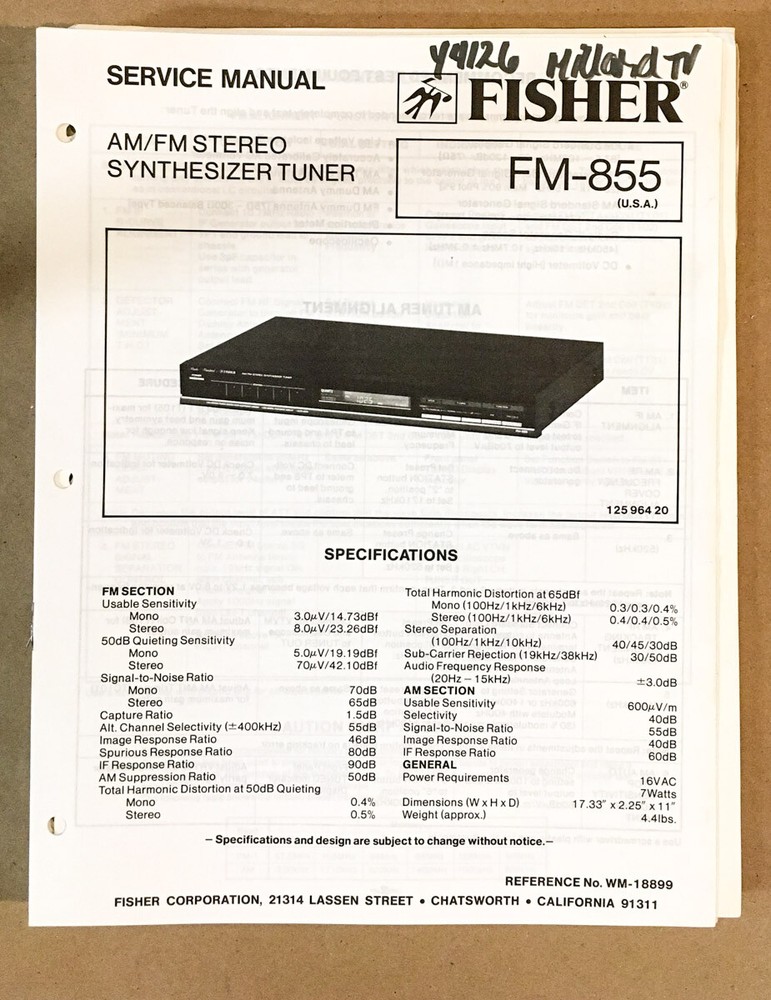 Fisher FM-855 Tuner Service Manual – Original Factory Guide