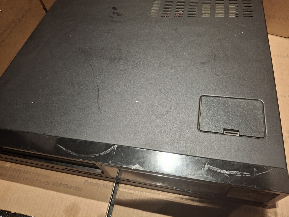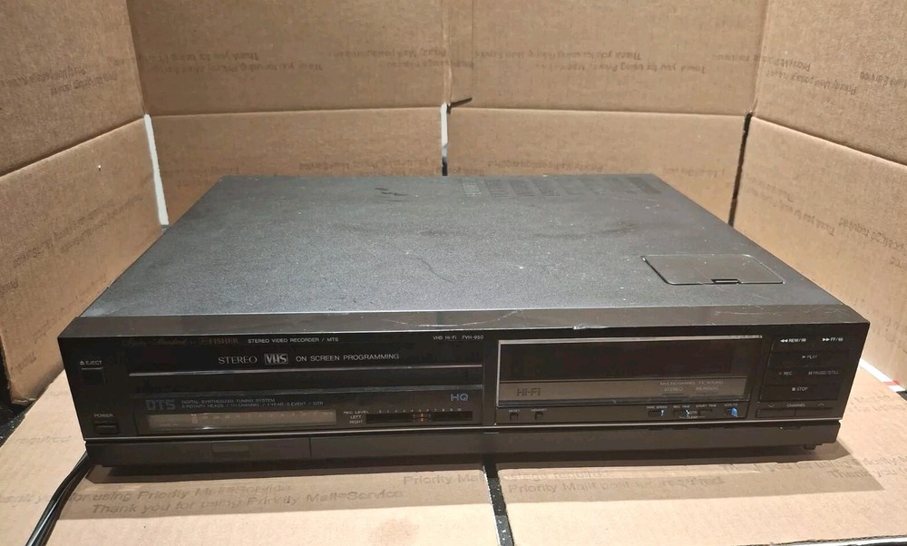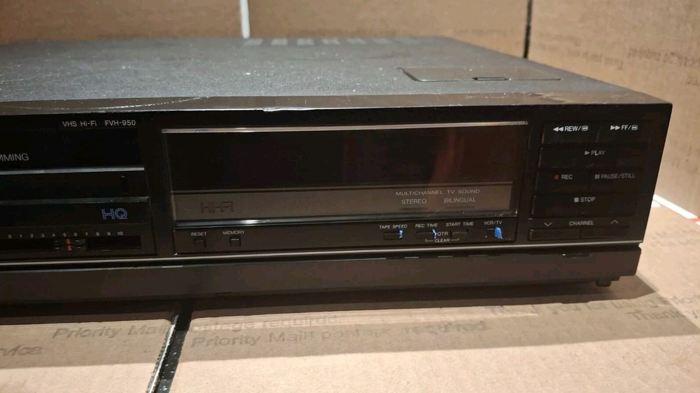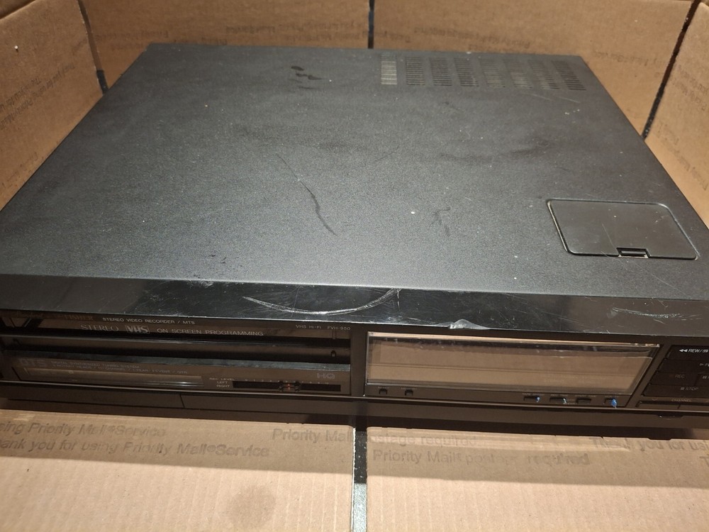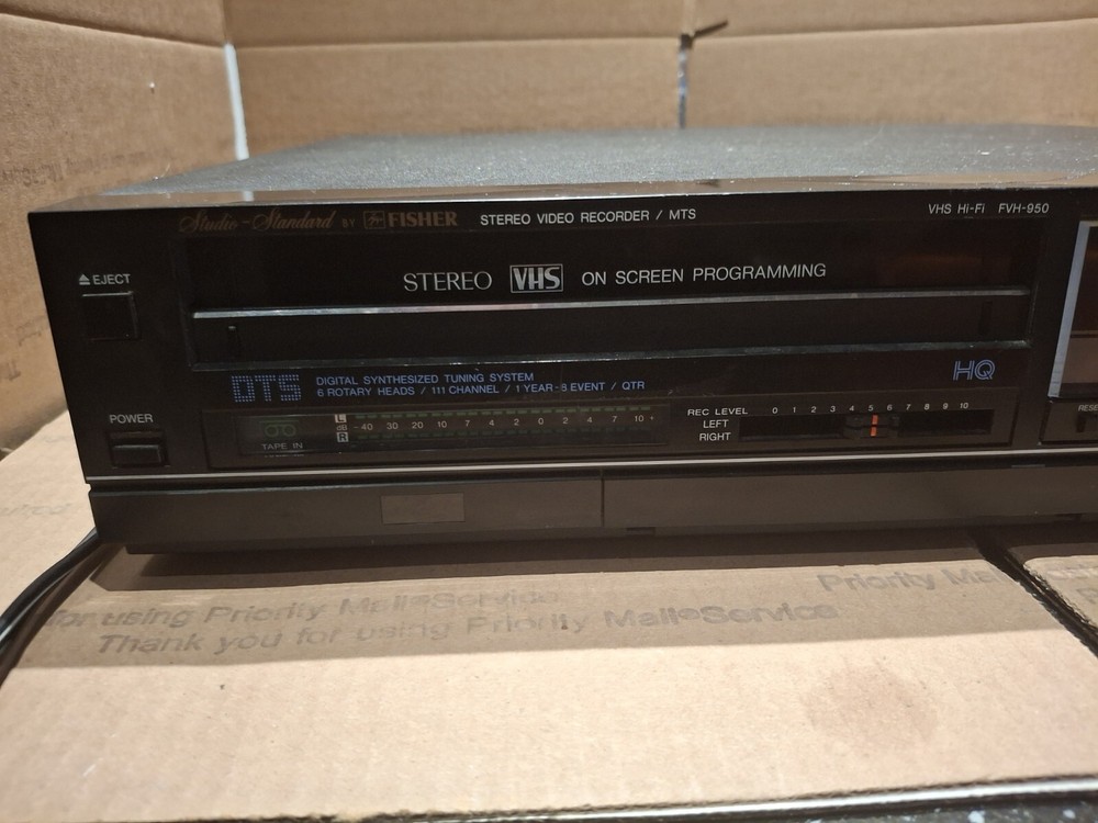 This vintage Fisher FVH-950 VHS Hi-Fi Stereo Video Recorder is a great addition to any home entertainment system. With its classic design and sturdy build, this recorder is sure to last for years to come. It is compatible with VHS tapes and features a stereo video output for a high-quality viewing experience. This vcr was tested and had some problems it would play a tape sometimes but also would eat the tape others. Seems to have only video for a second when turned on. Some of the buttons seem to be non functional. The flap on the bottom of the unit that opens has a broken hing but it can be repaired. The unit has q big scratch on top of it as shown with scratches and scrapes in corners.