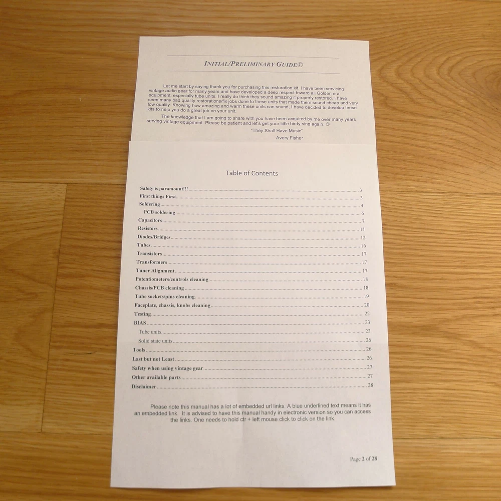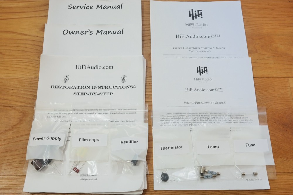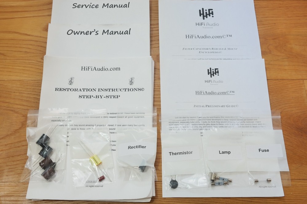 The scarcity of good, honest techs who can do good and reasonably priced restoration/rebuild of audio equipment inspired me to create this restoration kit. In today's day and age, it is difficult to find a knowledgeable technician who can service your audio gear properly. I have seen many poor quality restorations of equipment that cost way too much for their owners. In 99% of the cases, only a few parts were replaced, instead of a full and proper restoration job. A proper restoration must replace all electrolytic, paper, film, oil capacitors. Do not fall for partial kits. This is not a good or proper way to restore your audio equipment. It is the same as with car tires; one should never replace just one tire and keep the other worn-out tires on. A proper rebuild requires a full recap of all oil, paper, lytic capacitors. On the other hand, if one succeeds in finding a good tech, the wait time is usually 6-12 months for the unit to be serviced, and costs are sky-high. I have been servicing audio equipment for many years and have developed deep respect for all good equipment. Knowing how amazing and warm these units can sound, I decided to put together this kit. It includes very good upgrades and improvements that must be done to the unit. This restoration kit will make a huge difference in the sound quality. All the parts are of high-quality Japanese Nichicon / Rubycon / WIMA / IC / United Chemi capacitors. I am extremely particular about the quality of the parts provided in this kit. Knowing how many bogus/fake caps, diodes, resistors, etc. are out there, I source all the parts from reputable wholesalers and buy them in bulk. Vintage audio equipment has the potential to deliver rich and authentic sound when it is properly restored. Not only can it enhance your listening experience, but it can also evoke memories and bring joy to your life. Let's work together to bring your vintage gear back to its full potential, and make sure you have the music you deserve. ♩♬♫♪♫♩♬ “They Shall Have Music”- Avery Fisher Included in this kit: 1. Power/Filter stage capacitors ( Nichicon / Nippon / United Chemi) electrolytic capacitors. 1 x custom made PCB adapter plate to help one replace the multi-section can capacitor. Note, the image with silver multicap cans shown restaffed with new caps is for illustration purpose only. 2. Detailed instruction with colorful images, schematics, manuals (all of these are in electronic form, I consider these much better than printed version due to zoom availability). 3. Schematics (all of these are in electronic form, I consider these much better than printed version due to zoom availability). 4. Complete audio path upgrade with high quality WIMA or IC (Illinois capacitor) film capacitors. 5. Parts for complete recap of all the electrolytic capacitors. 6. Complete recap of all oil, film, paper, lytic caps. 7. fuse/s 8. Instructions on how to clean the chassis. 9. Instructions on how to clean a faceplate 10. Instructions on how to polish knob covers. 11. Support/help to a reasonable extent in case you need it. (This is what makes us different from other sellers.) The custom-designed PCB boards simplify the restoration process for multi-capacitor can capacitors in vintage audio equipment. Clearly labeled with polarity markings and mounting guides, they ensure precise assembly and seamless integration into your restoration project. These PCBs are also designed with cuts and openings to accommodate the original multi-section capacitor covers, allowing them to be reinstalled and preserving the authentic vintage look. An essential addition for maintaining both authenticity and functionality in vintage audio gear. We also offer a great selection of Restoration Kits , LED conversion kits , Volume Controls , Rotary Switches and other rare/unique parts; Make sure to check our store ---------> LINK (Use the search bar inside the shop to find what you need faster) We may also be interested in purchasing your equipment