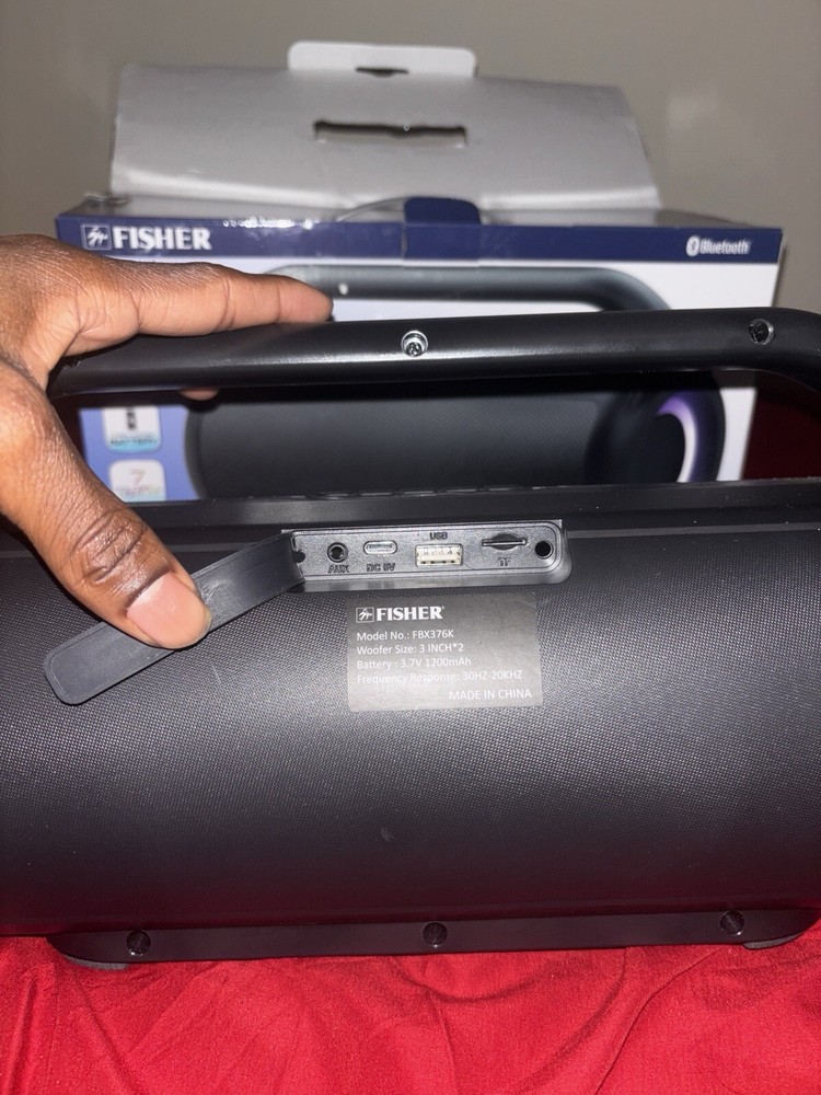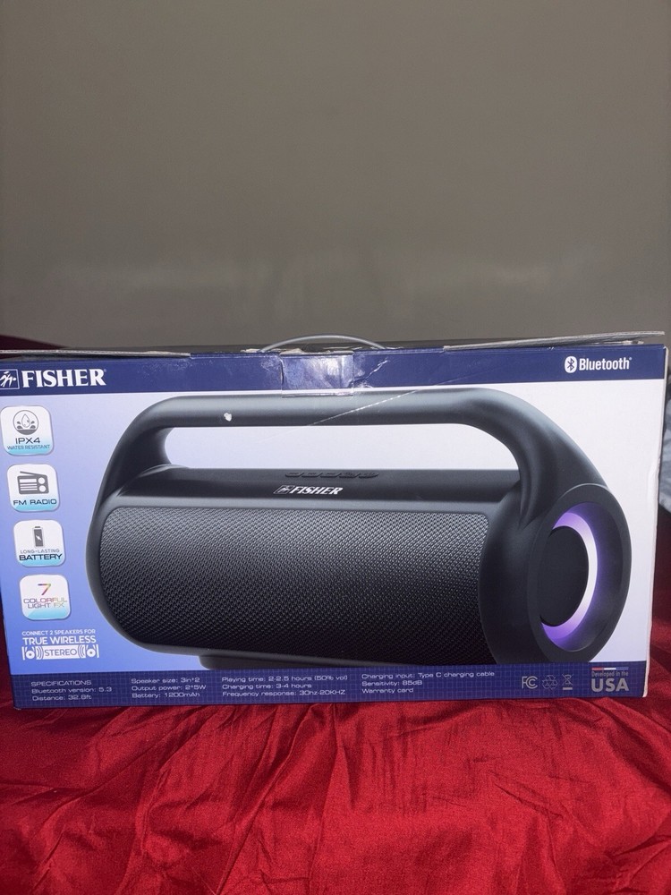 This Fisher LED Bluetooth speaker works perfectly and packs impressive sound for its size. The lights add a cool vibe, and it's practically new since it was only used twice. Just note it doesn’t include a USB charger, but if you have one, this speaker is a steal for the price. Great for parties or chilling at home!