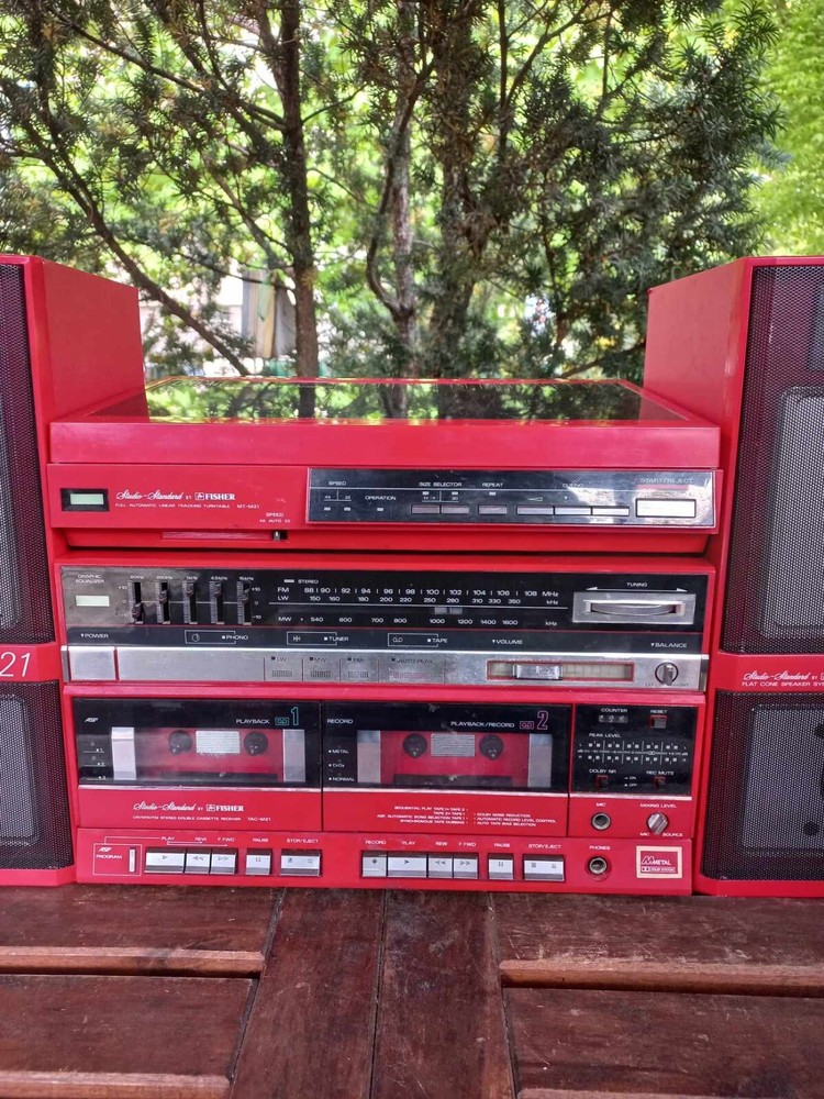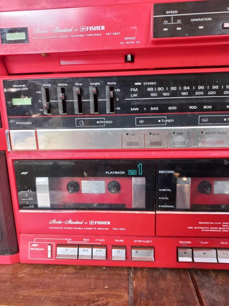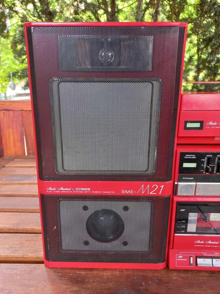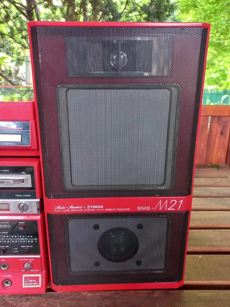 Here We offer a Fisher M21 stereo component system together with speakers The system comprises of the following components : MT M21 turntable - working but the needle sometimes slips and the arm rushes to the center TAC M21 Stereo double cassette receiver - Radio works. Right hand cassette recorder works. Other side does not. SME M21 speaker set A heavy duty, liitle stereo, in unique and very rare red color.