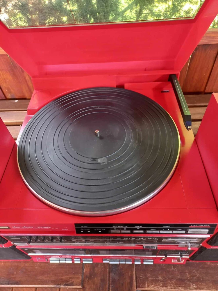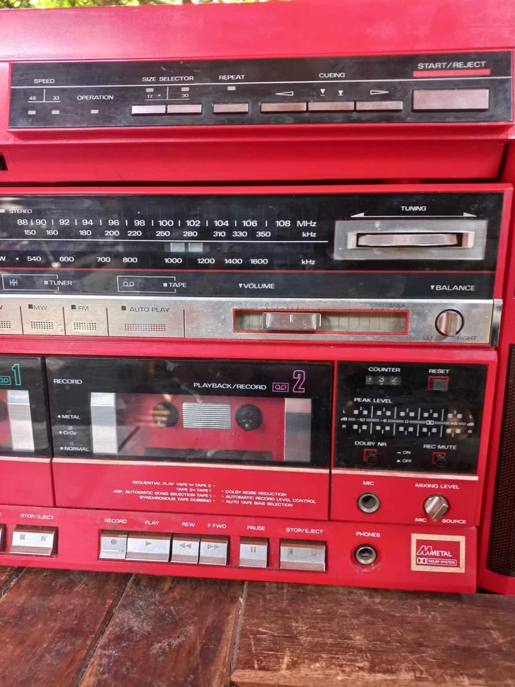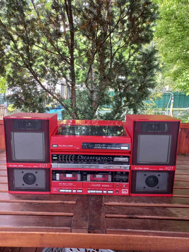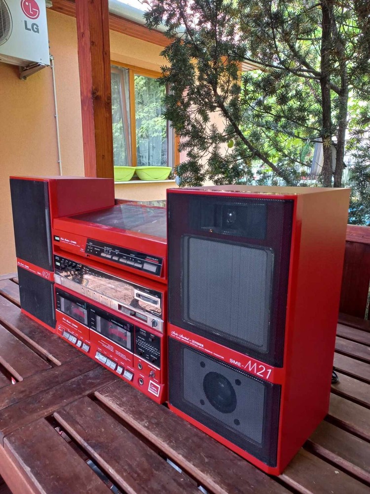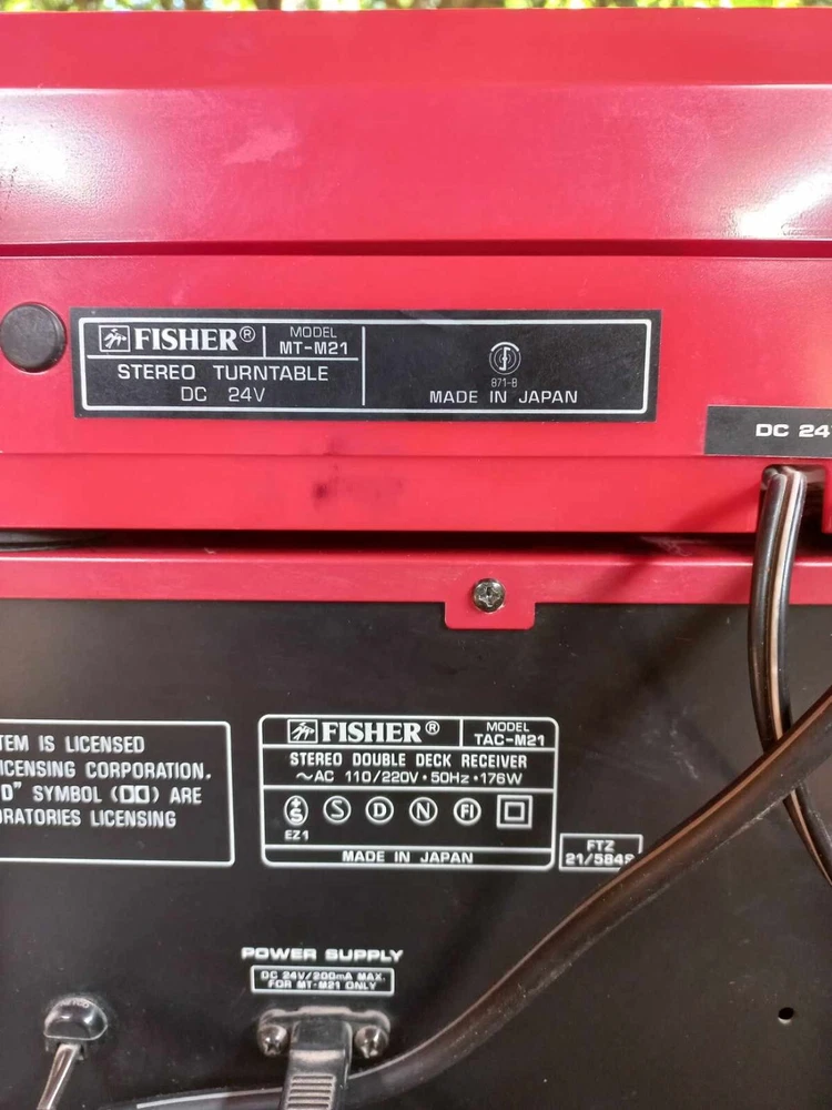 Here We offer a Fisher M21 stereo component system together with speakers The system comprises of the following components : MT M21 turntable - working but the needle sometimes slips and the arm rushes to the center TAC M21 Stereo double cassette receiver - Radio works. Right hand cassette recorder works. Other side does not. SME M21 speaker set A heavy duty, liitle stereo, in unique and very rare red color.
