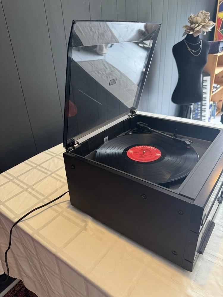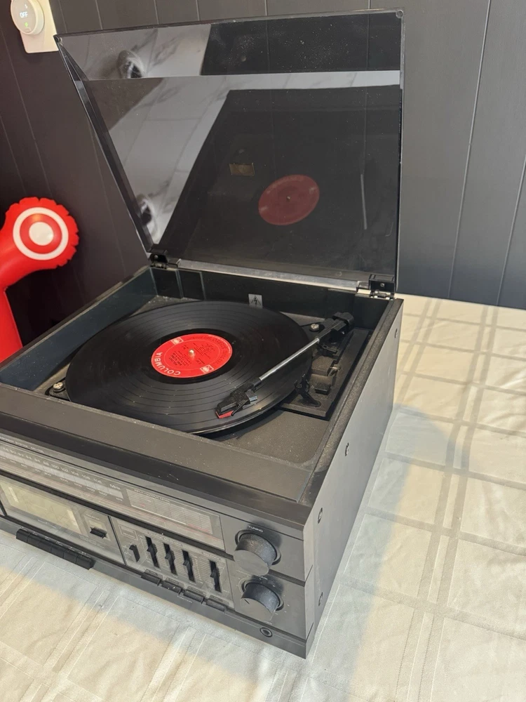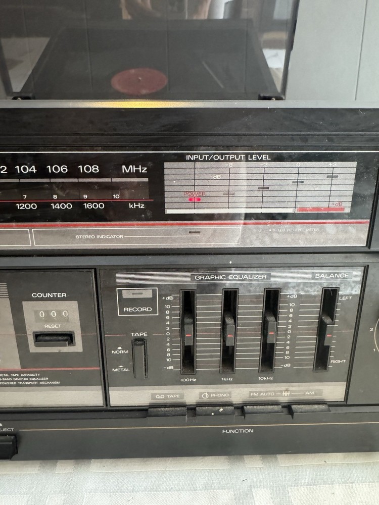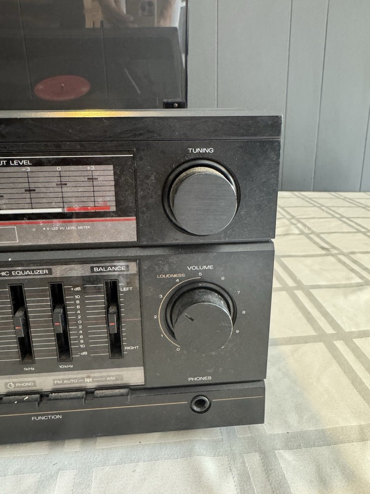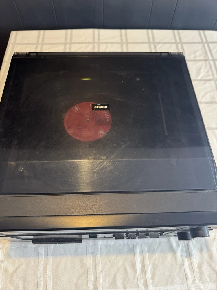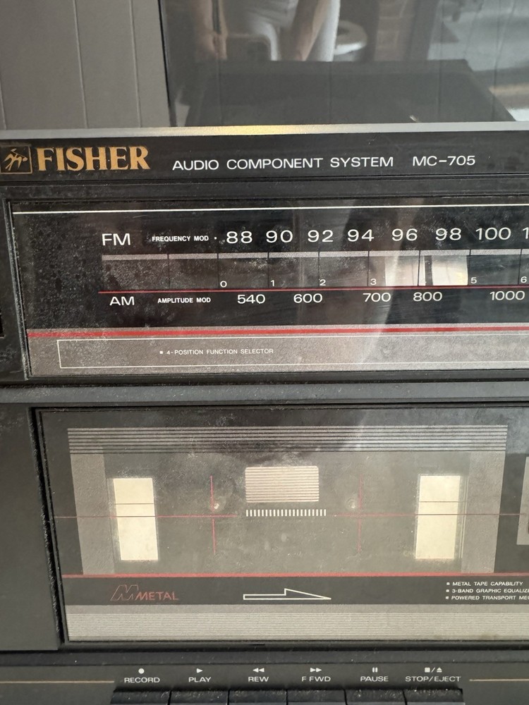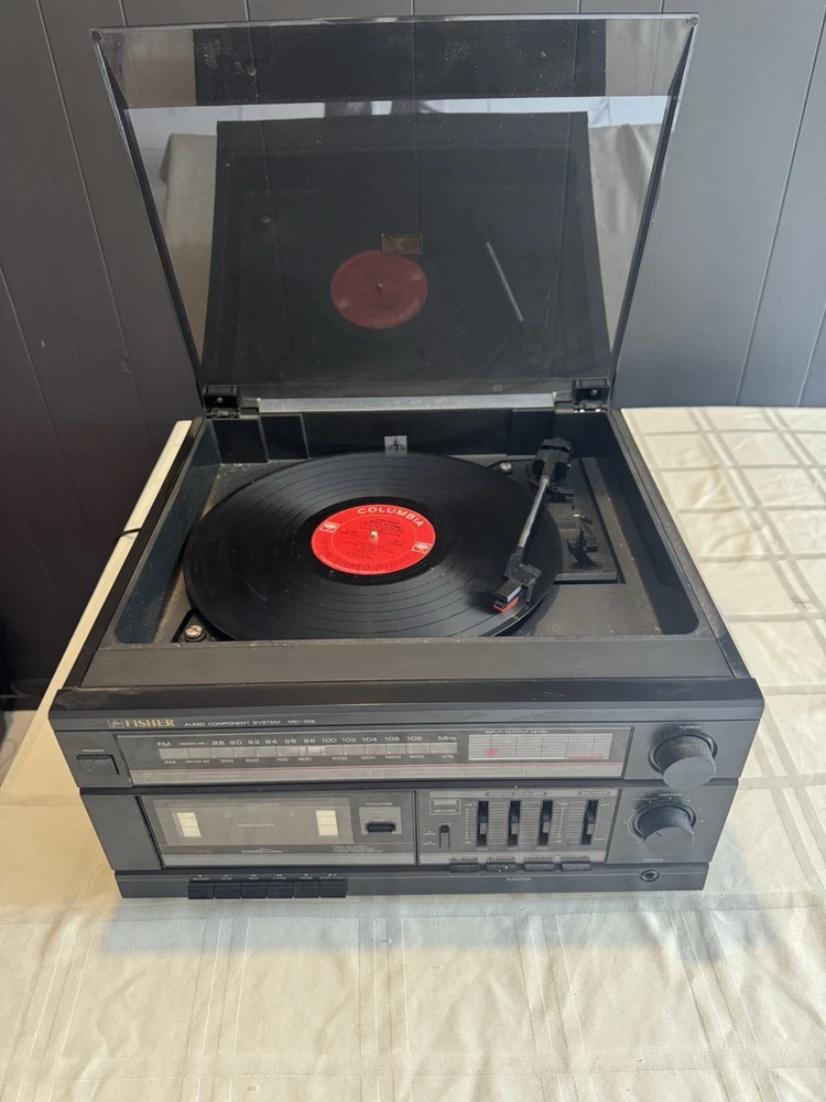 Vintage Fisher MC-705 Audio Component System featuring turntable, cassette deck, and AM/FM radio in one compact unit. Classic 1980s design with wood grain finish and clear acrylic dust cover for turntable. Features 3-band graphic equalizer, metal tape capability, and multiple audio controls. Turntable tested and working - cassette deck and radio not tested. Great for vinyl enthusiasts and retro audio collectors. Shows normal vintage wear but functions well. Perfect for bringing classic sound to your home setup.