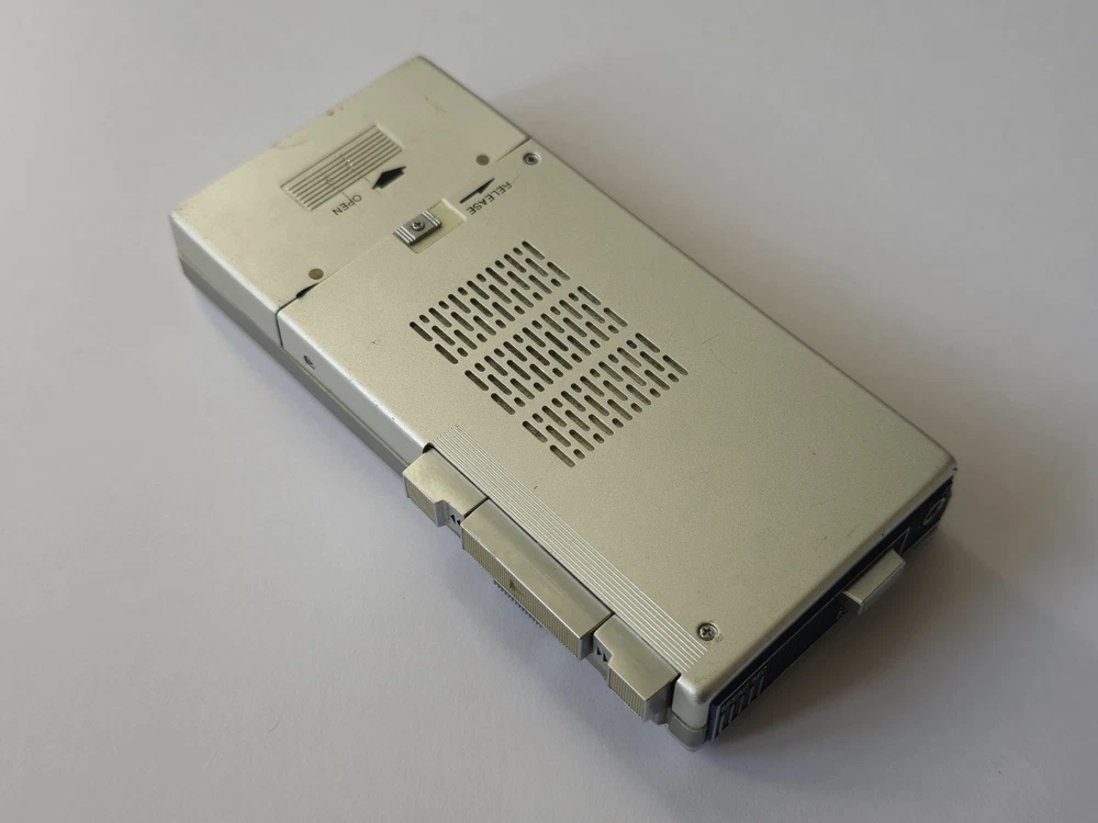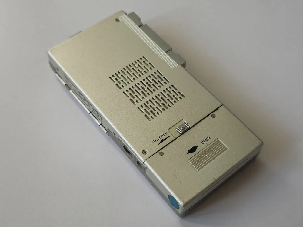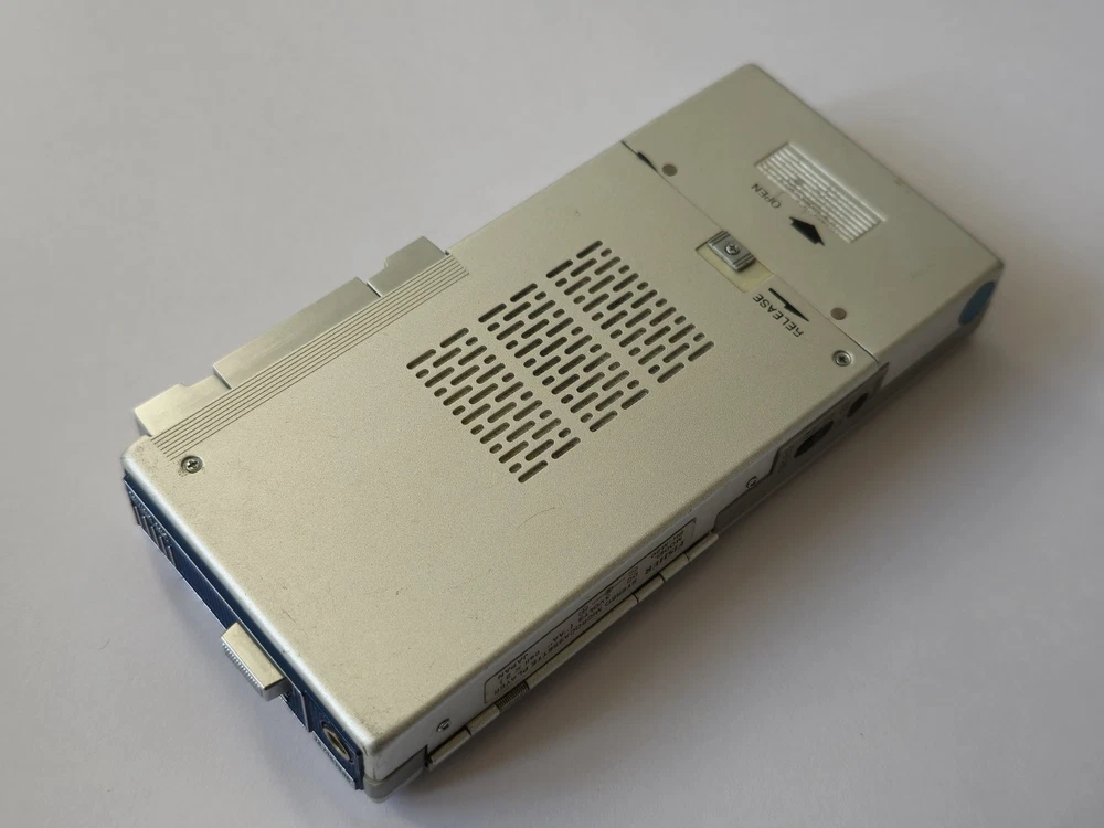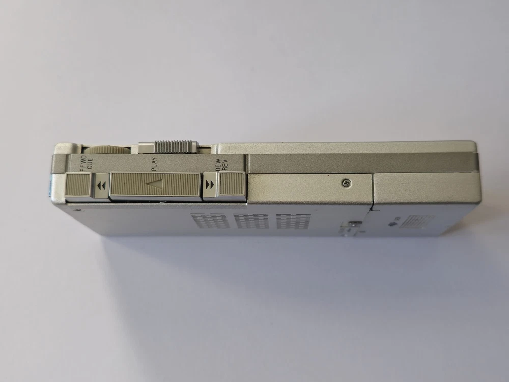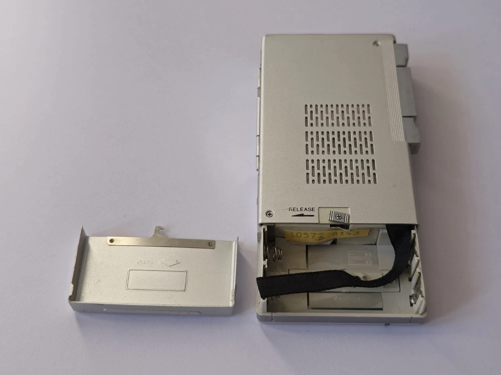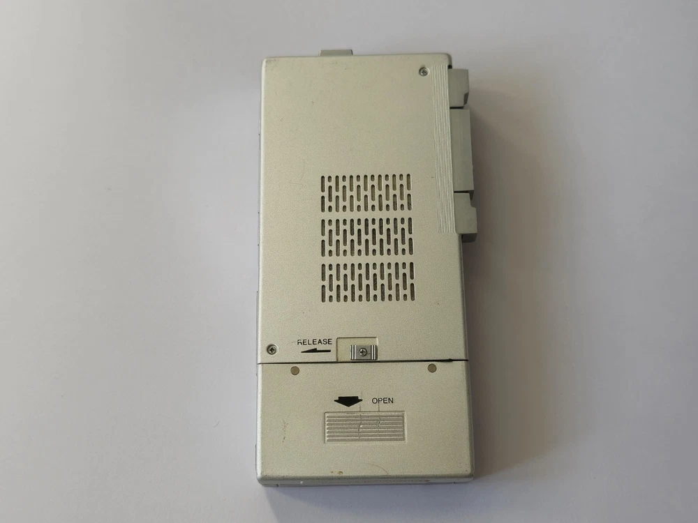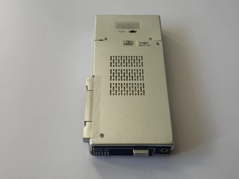 This vintage microcassette player is in great shape with only minor wear. The battery compartment is clean and all controls work smoothly. Perfect for restoration projects!