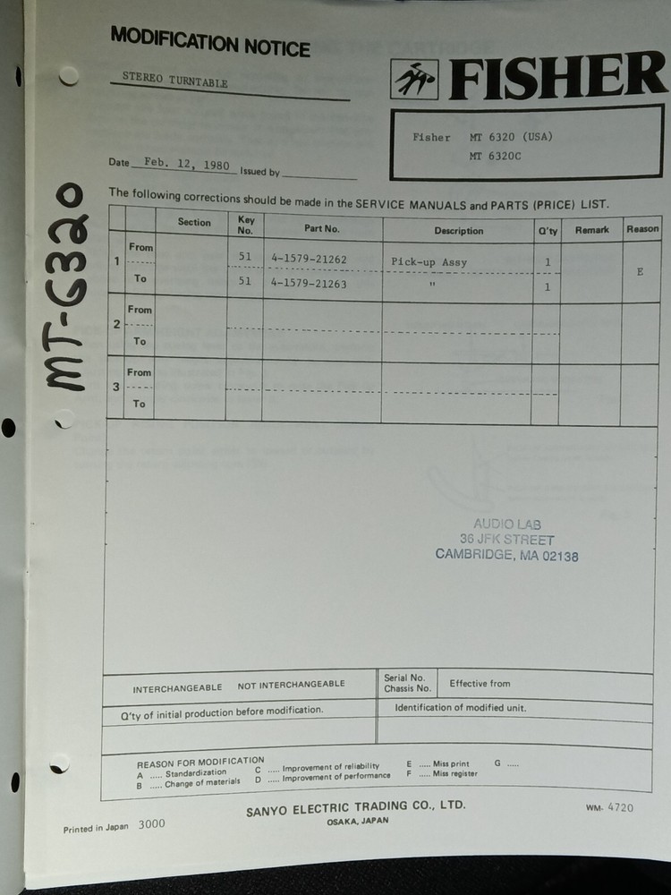 I am selling a Fisher MT-6320 MT-6320C Service Manual Direct Drive Stereo Turntable Original.. Item was used at a repair center .. Item will be shipped USPS First Class or Media Mail.....
