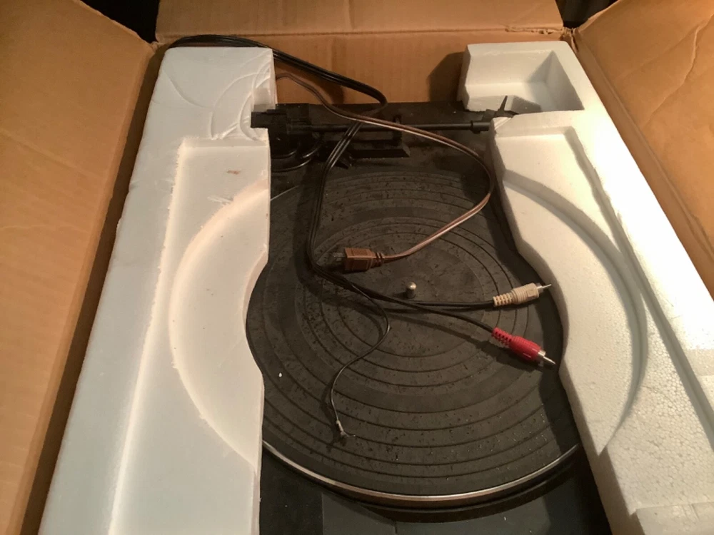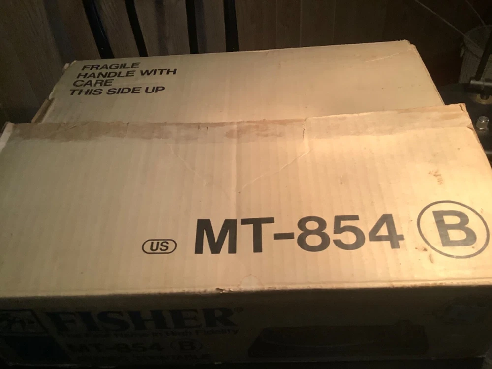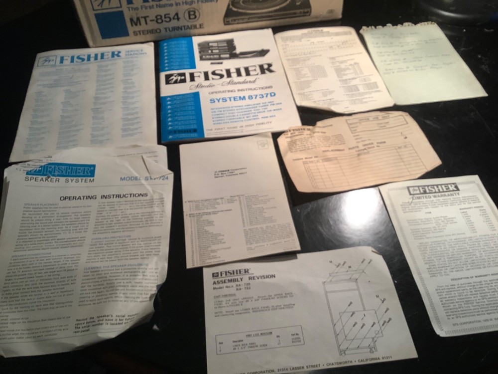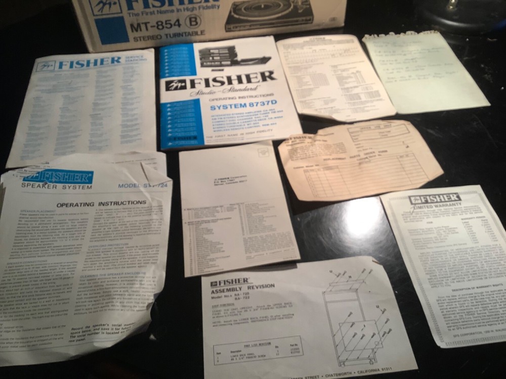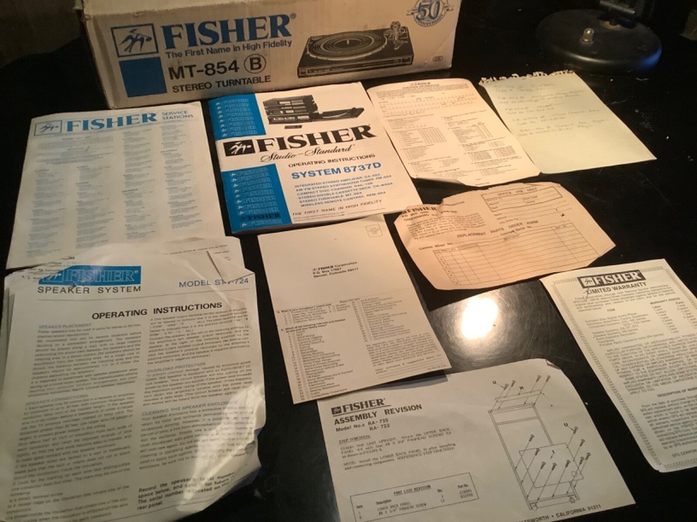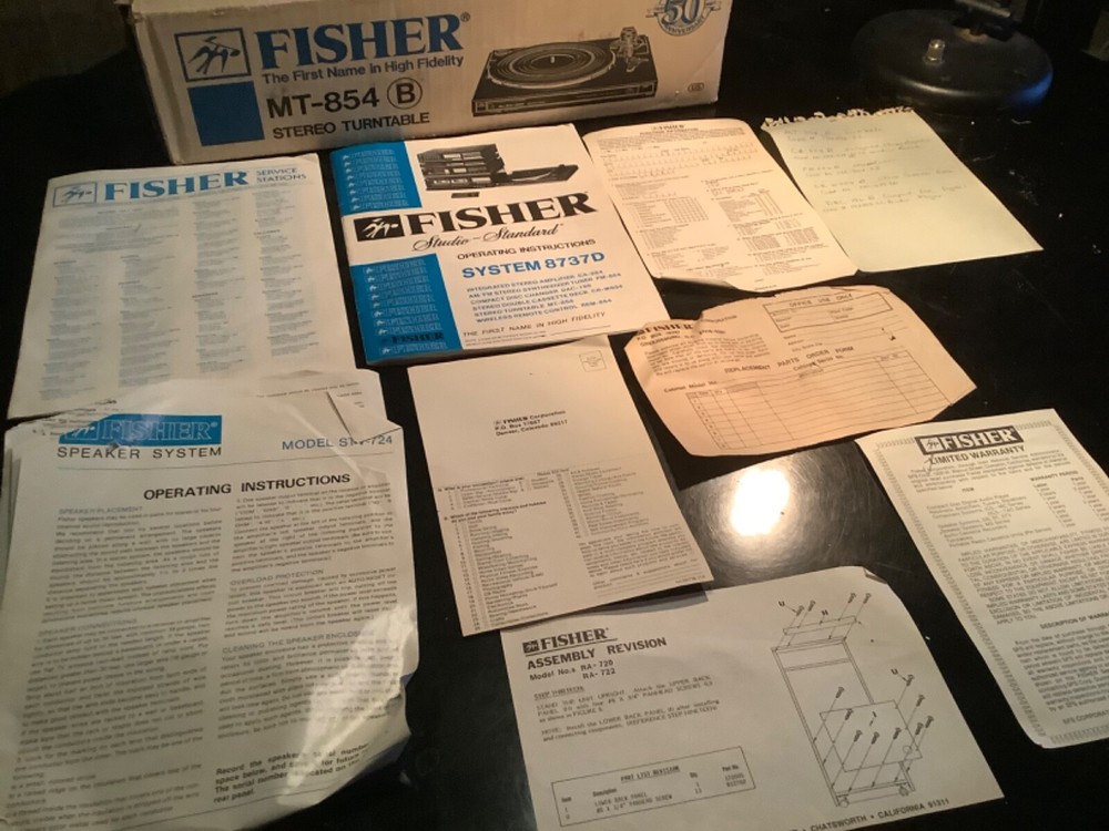 Vintage stereo phonograph turntable, n.o.s., designed for use with Fisher CA-854B integrated altered amplifier with remote - but can be connected to any suitable amplifier. This item was part of a package being System 8738D.Never used, does not come with a dust cover due to it being in a cabinet (for which this item was never installed). One defect is that the rubber mat for the turntable platter is deteriorating, but should be easily available.