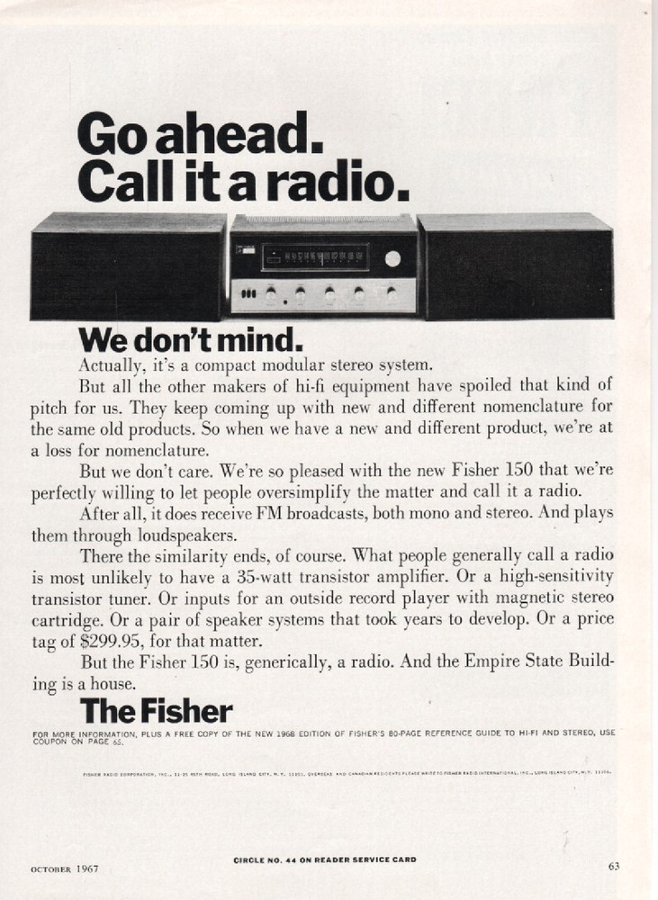 Fisher - Model 150 Stereo System - Original Magazine Ad - 1967 Very good Condition. (Lot# - AUD-29-37) Shipping to the U.S. is 3.65 - International shipping - Ebay international shipping program Payment is by Ebay Managed Payments