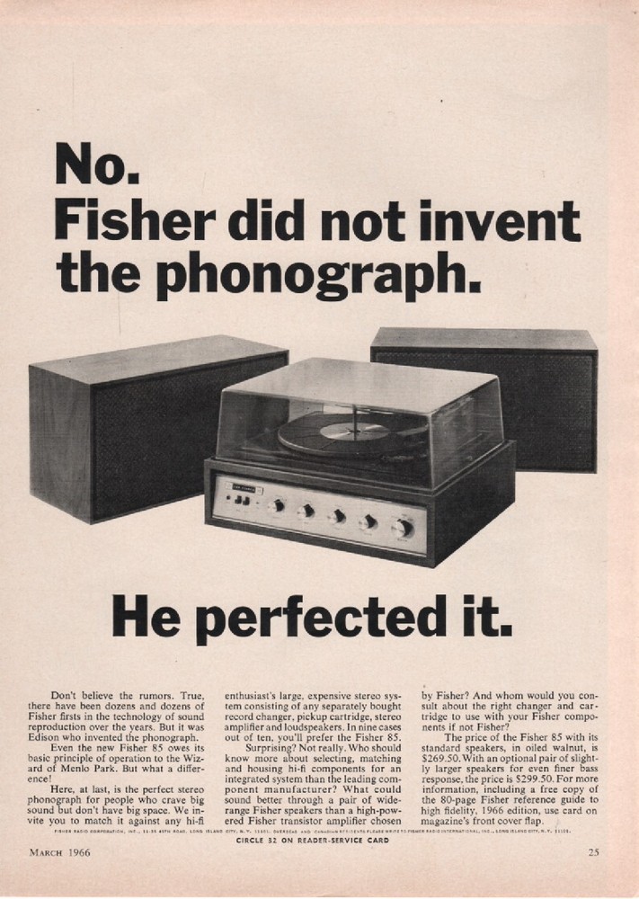 Fisher - Model 85 Stereo System - Original Magazine Ad - 1966 Very good Condition. (Lot# - AUD-29-35) Shipping to the U.S. is 3.95 - International shipping - Ebay international shipping program Paymen...