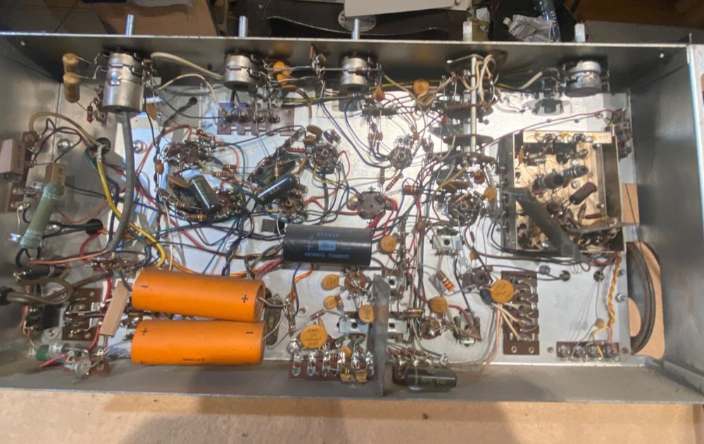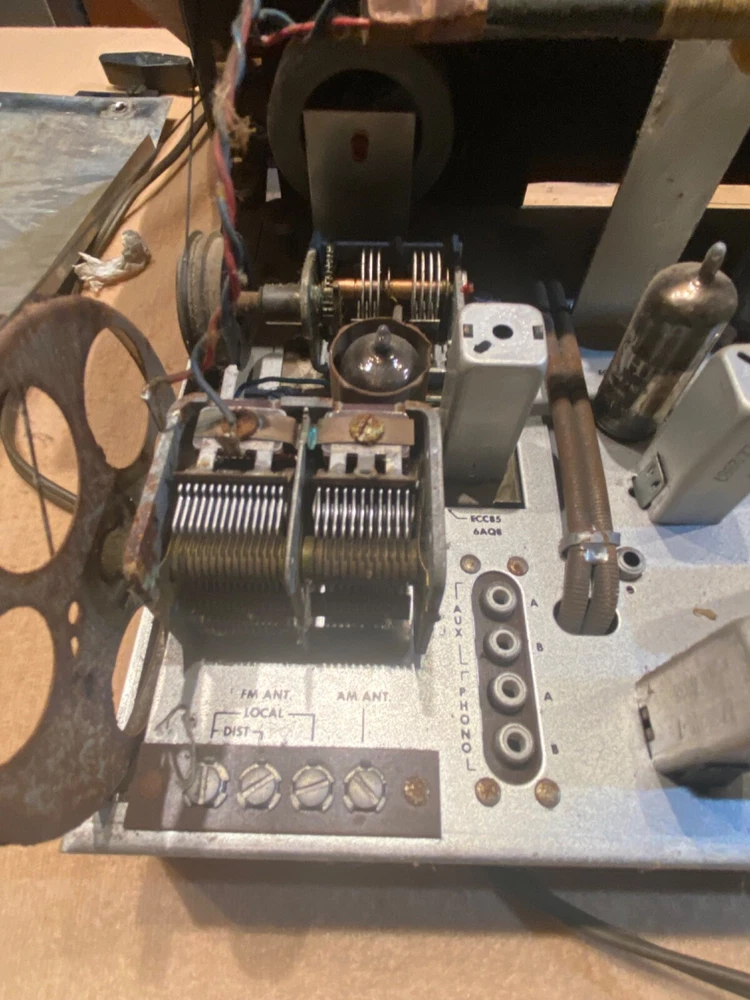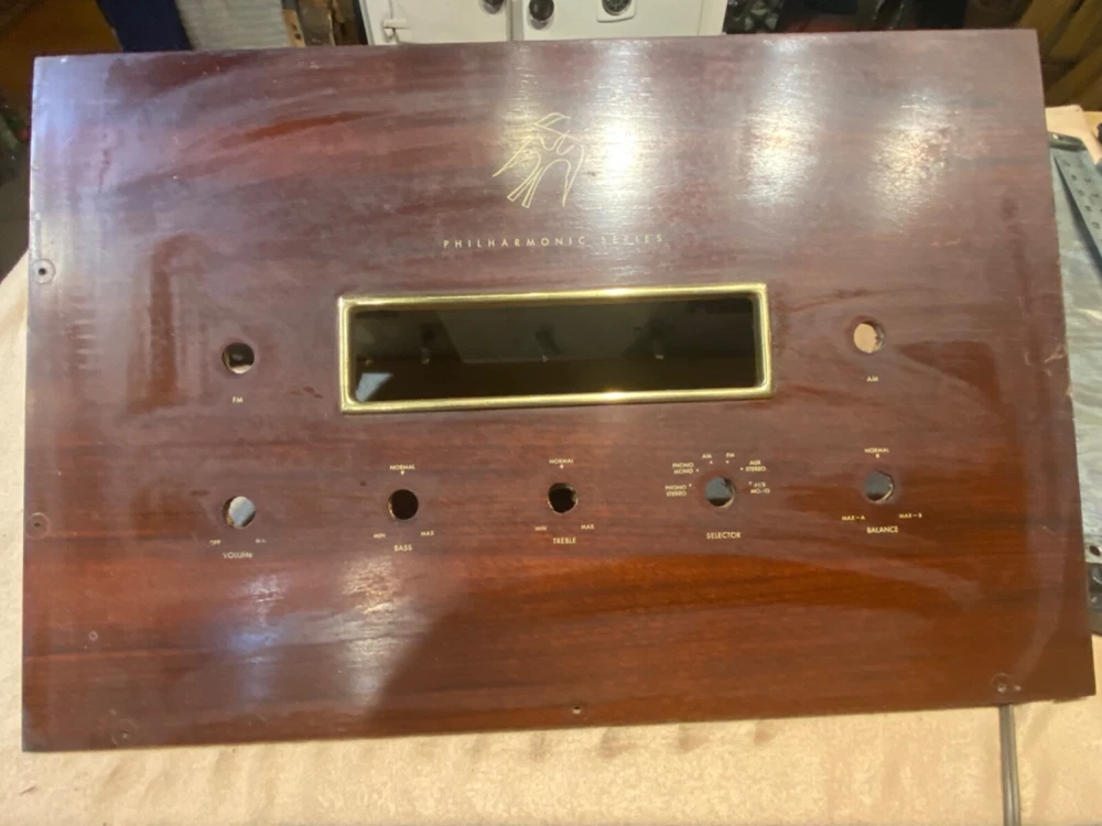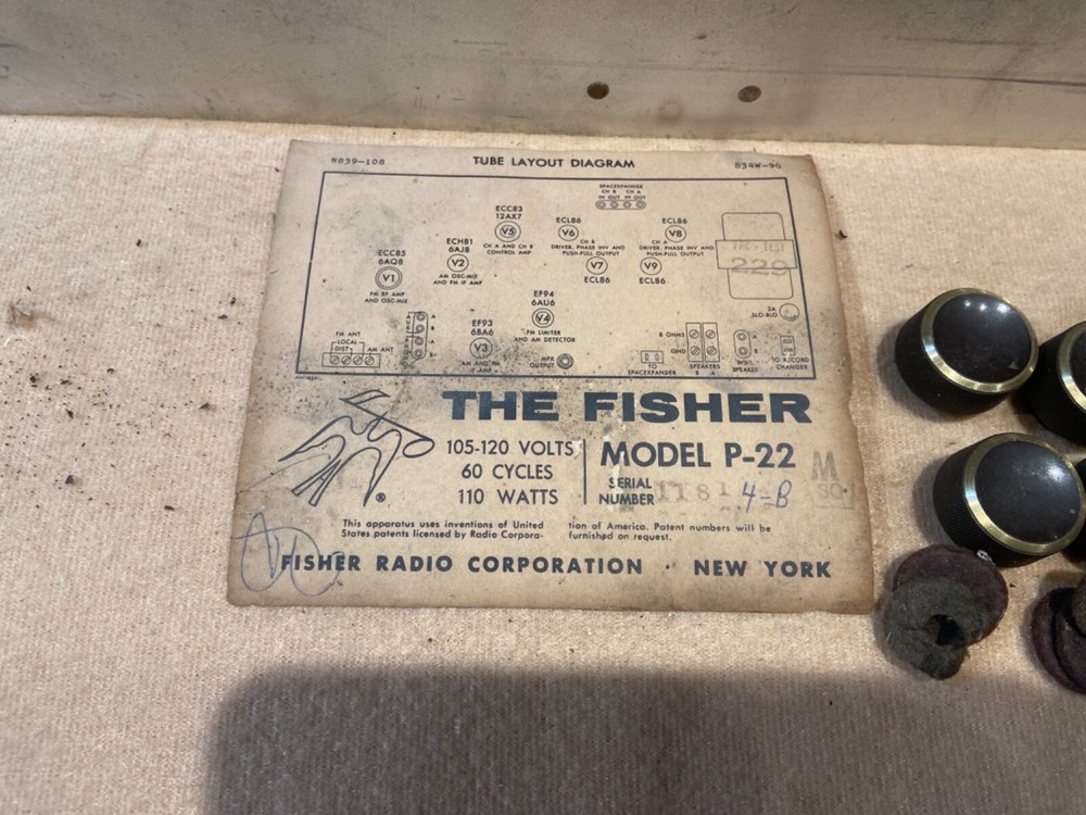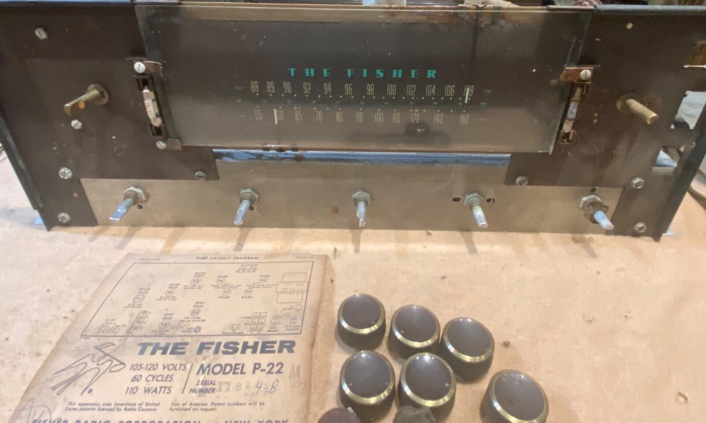 This is a vintage early 1960s Fisher tube receiver chassis from a console stereo. I pulled this many years ago and just rediscovered it in a box. It is complete with knobs and it's untouched. It will need a restoration with new capacitors. I believe it was working when I pulled it from the console, but it's been sitting at least ten years. It comes with all the tubes shown. I will also include the front, wood face plate, but I may need to ship it in a separate box due to its size. FREE LOCAL PICKUP IS ALSO AVAILABLE FROM MY AUDIO SHOP HERE IN WESTERN NY.