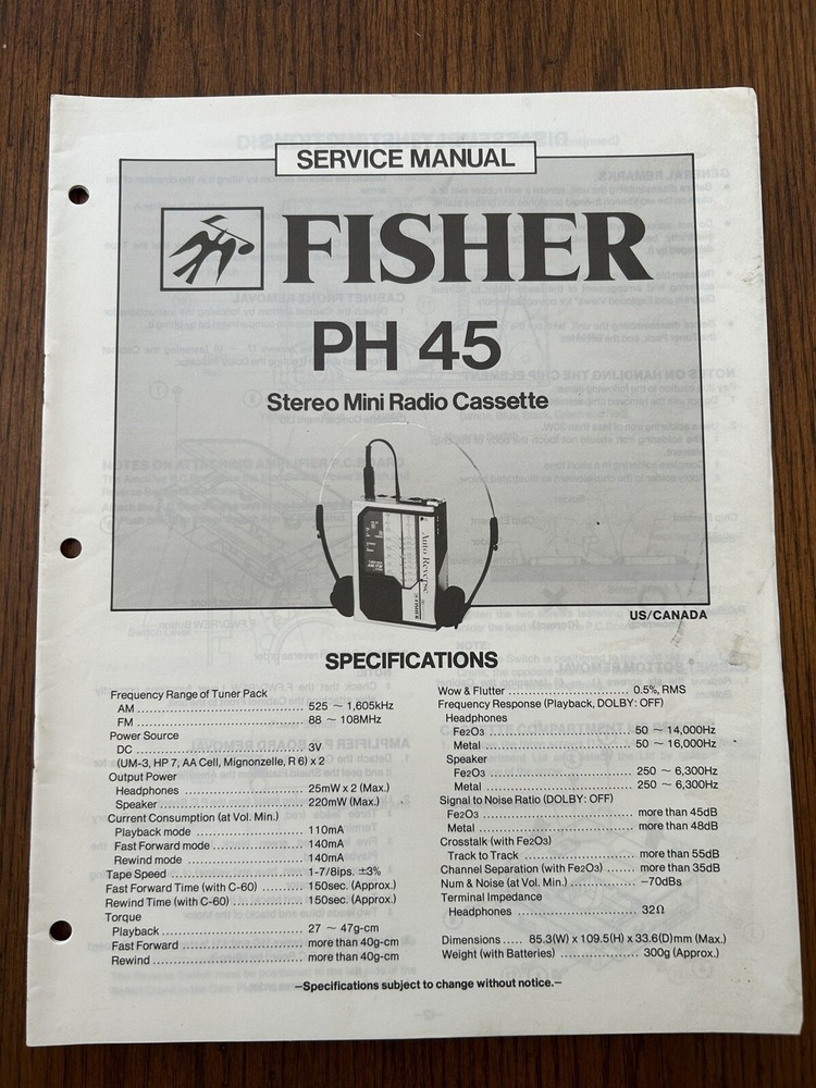 Fisher PH45 Vintage Stereo Cassette Walkman Repair Manual OEM Service Guide