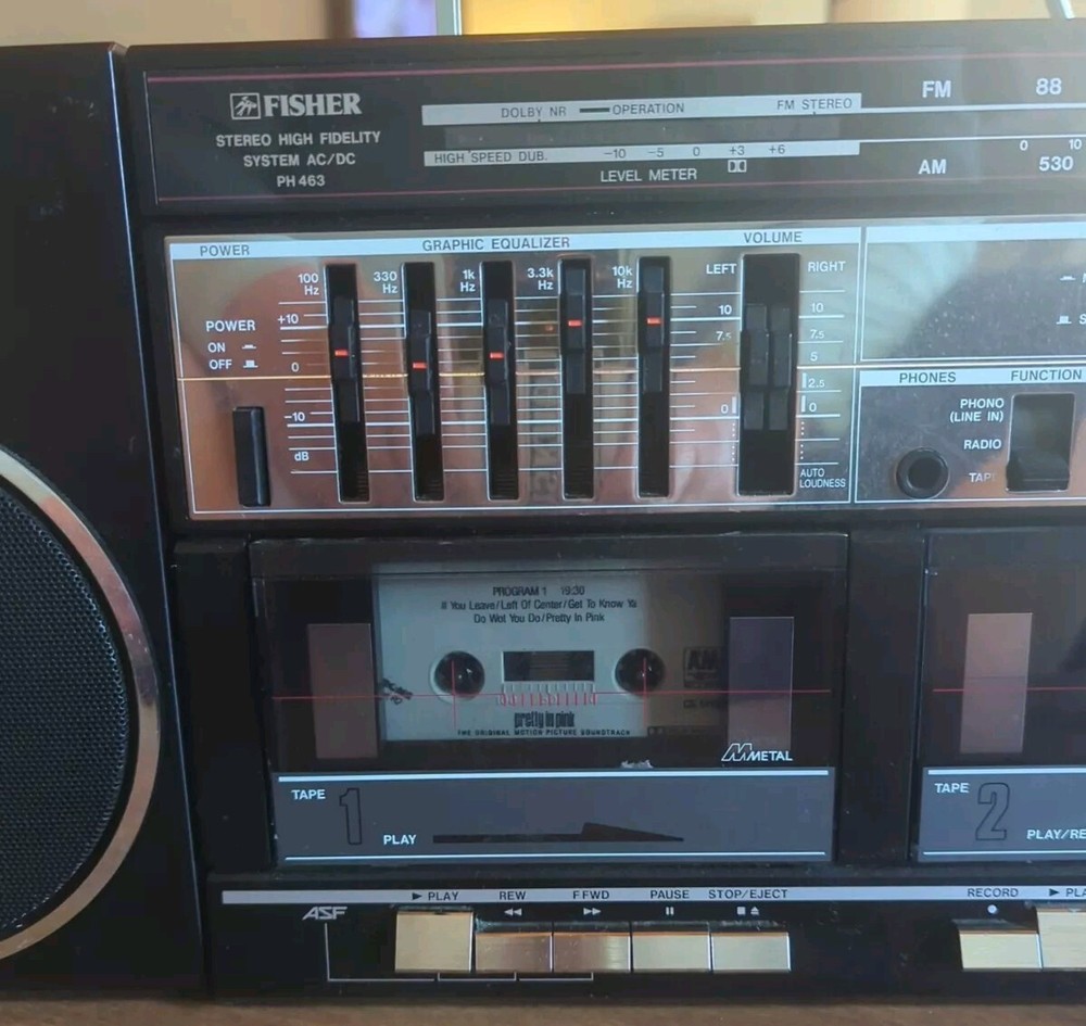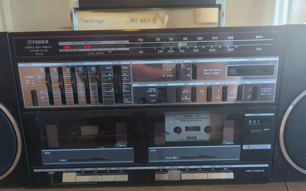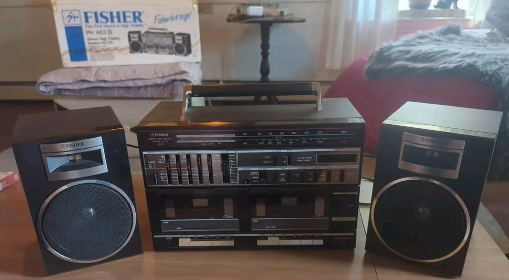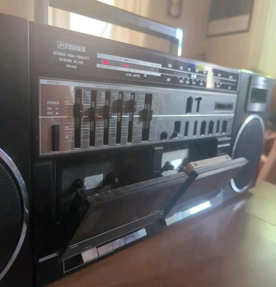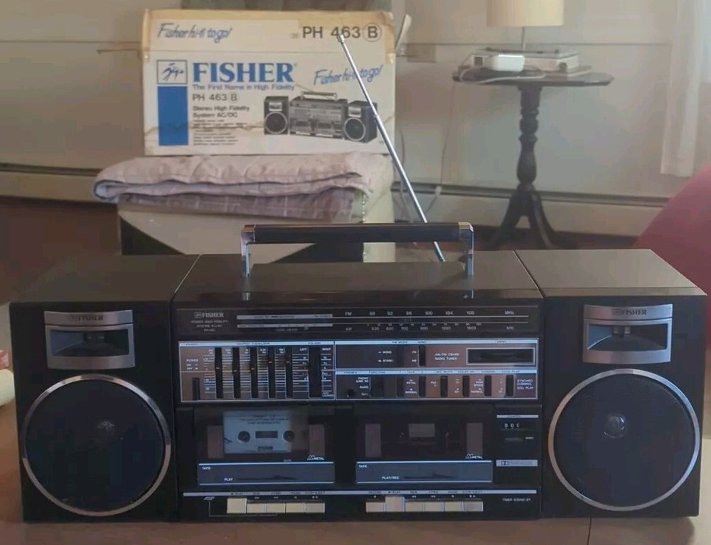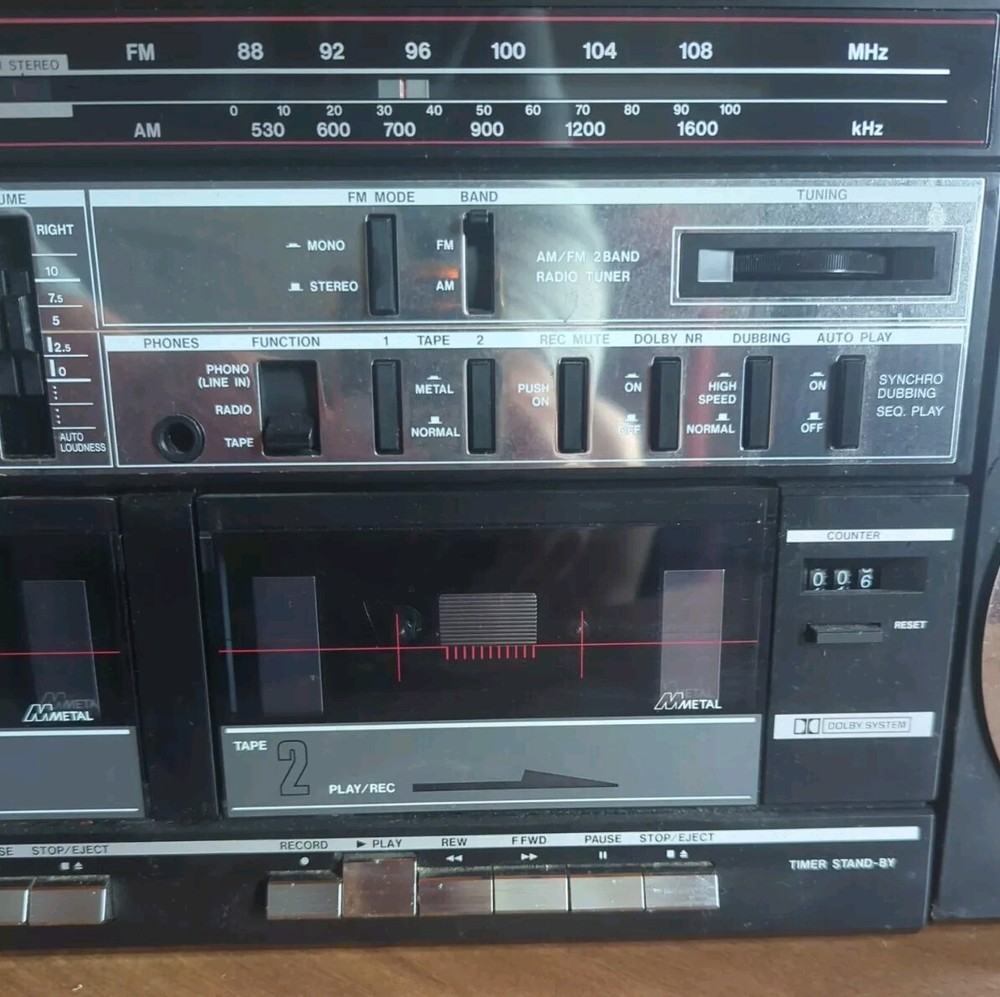 Super clean, There are a few issues as follows. left tape deck works but is funky. Likes to pop open. The right side works perfectly. Radio work great. The left speaker seems not as perfect as the right one. Probably just needs a good interior cleaning. The box is original with storage damage stains and 1 piece of original Styrofoam packing. No paperwork