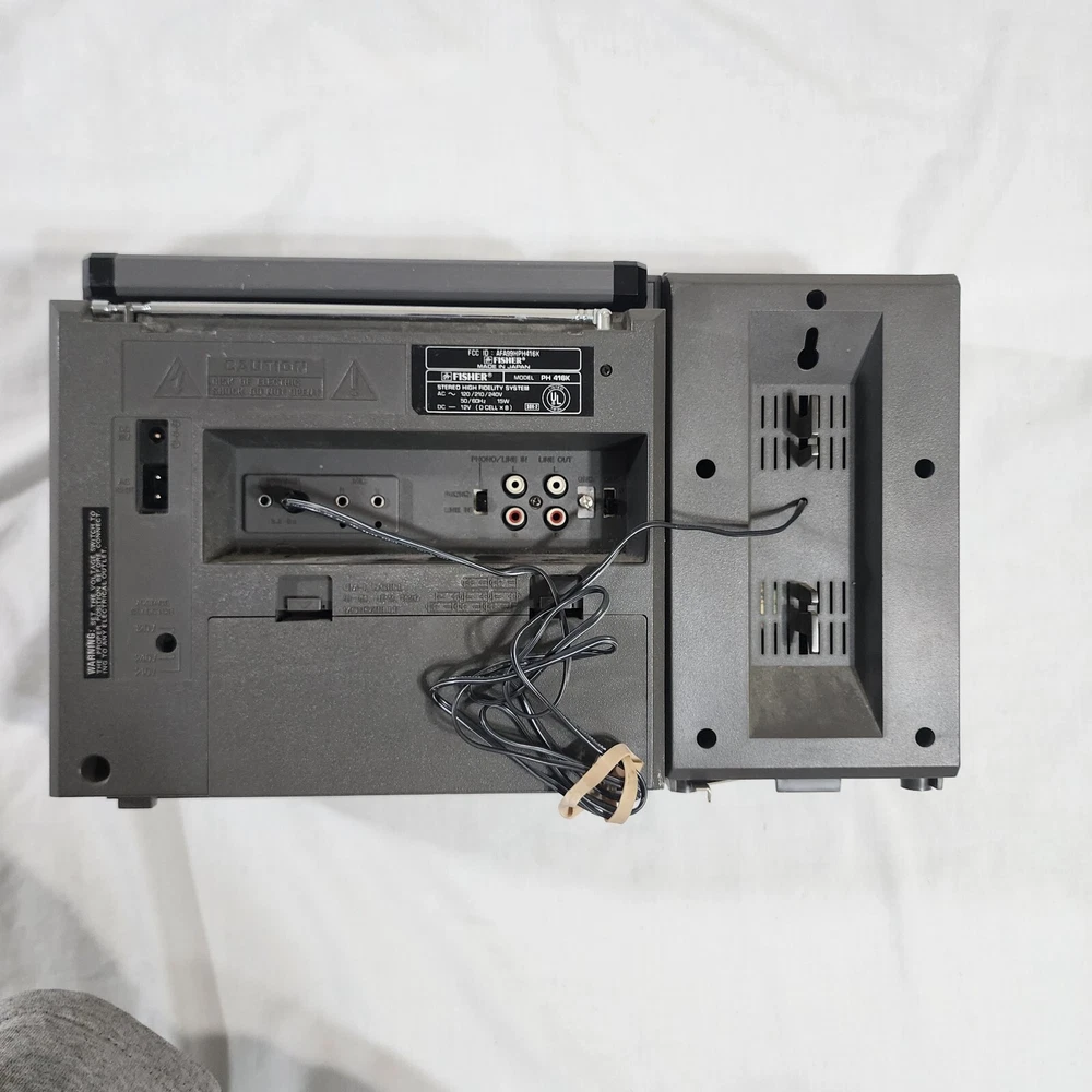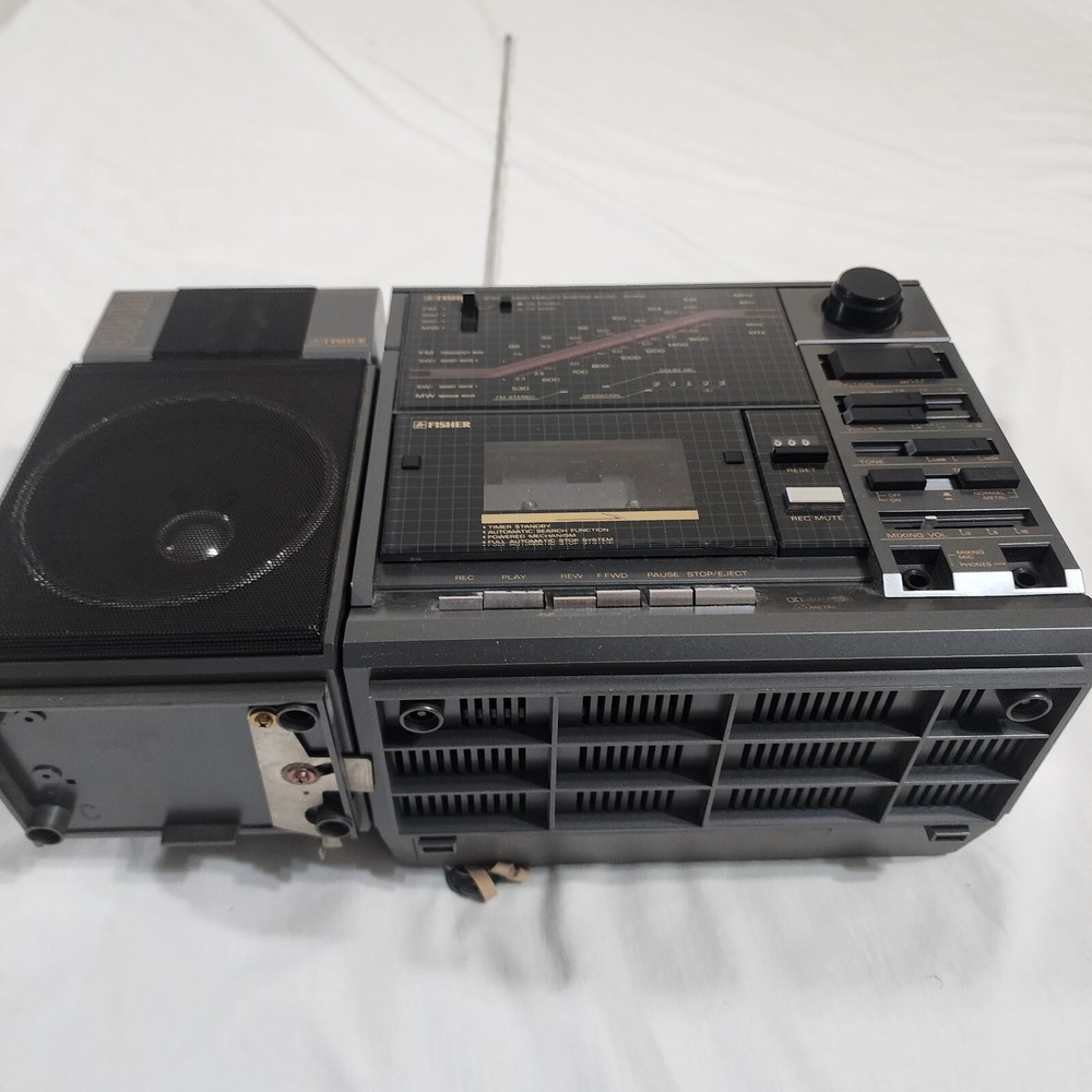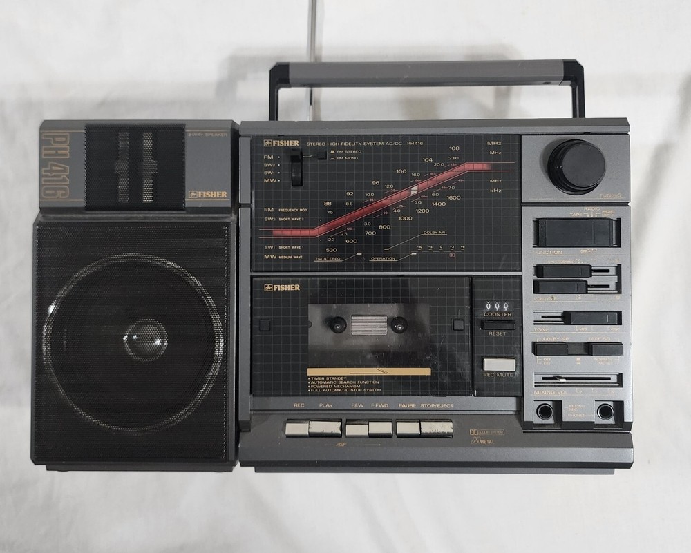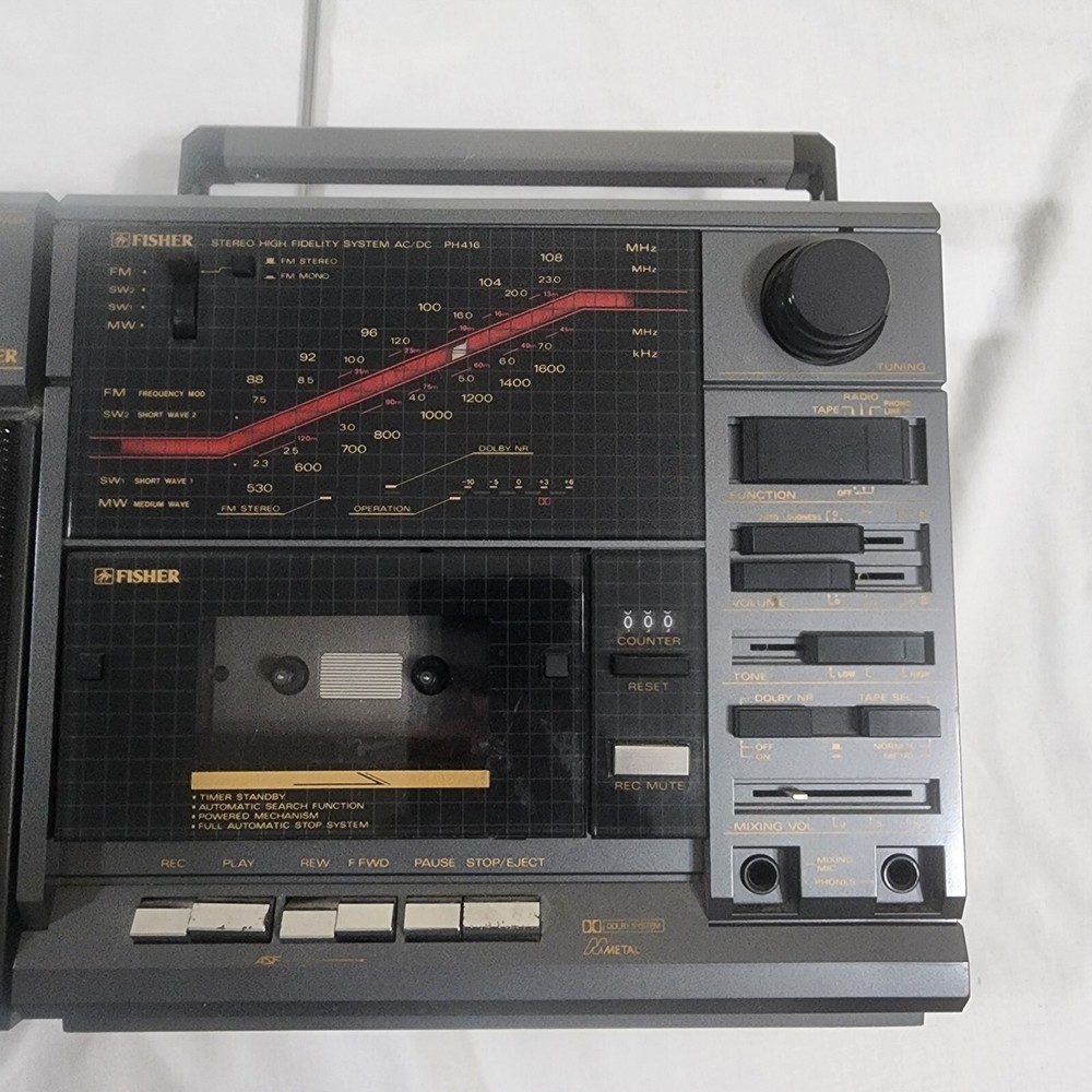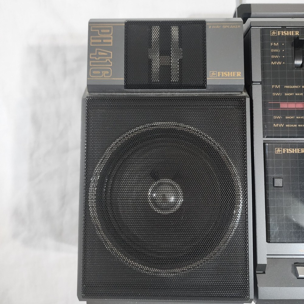 Fisher PH416 Boombox Stereo HiFi Cassette Radio Japan Vintage Retro - Working Item Details: Brand: Fisher Model: PH416 Type: Boombox Stereo Origin: Made in Japan Features: Radio, Cassette (untested) Color: Silver / Black Condition: Pre-owned Vintage Good physical condition with general wear from age and use. Radio functionalities work properly. π» Cassette tape player is untested (functionality unknown). Missing right side speaker. Please view all pictures for details. π¦ Next-Day Shipping (Excluding Saturdays and Sundays!) π π¬ Message me if you have any questions! π― Offers are welcomed! Extra Tags: #FisherPH416 #VintageBoombox #RetroStereo #MadeInJapan #CassettePlayer #SaveByThrift πΆπ»