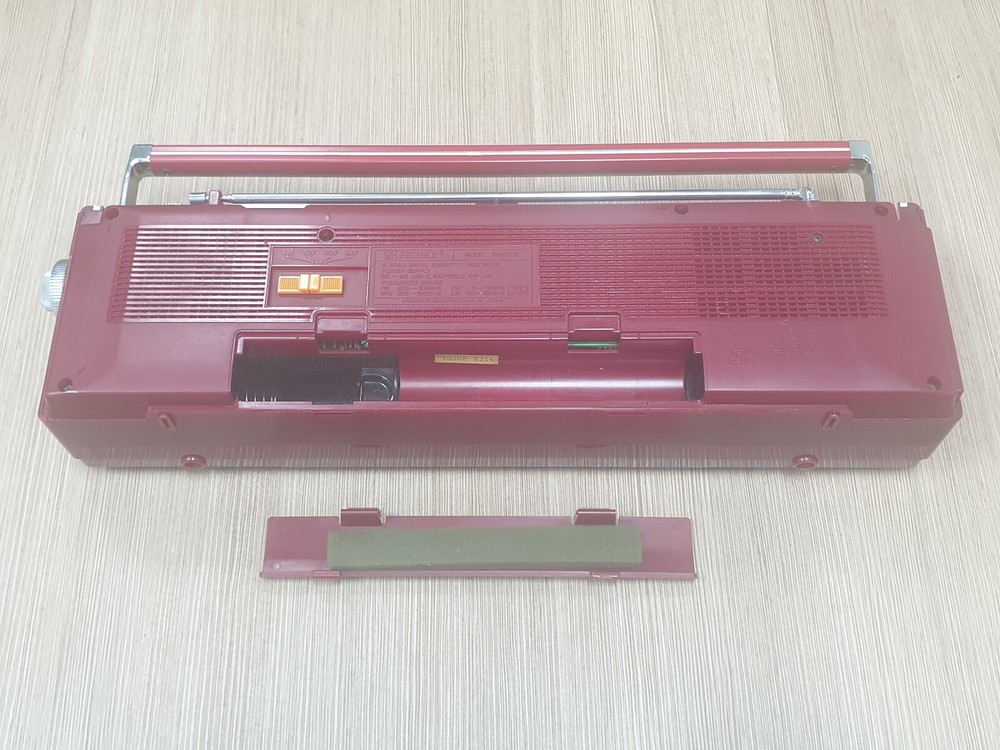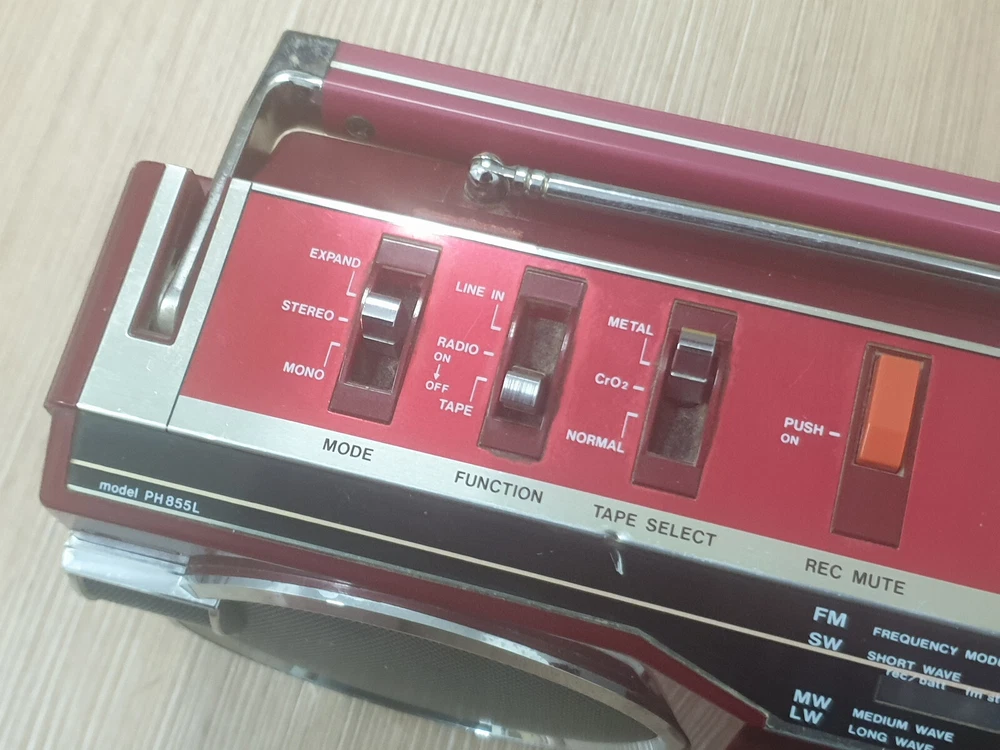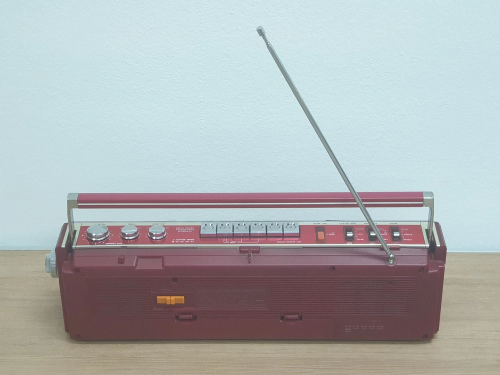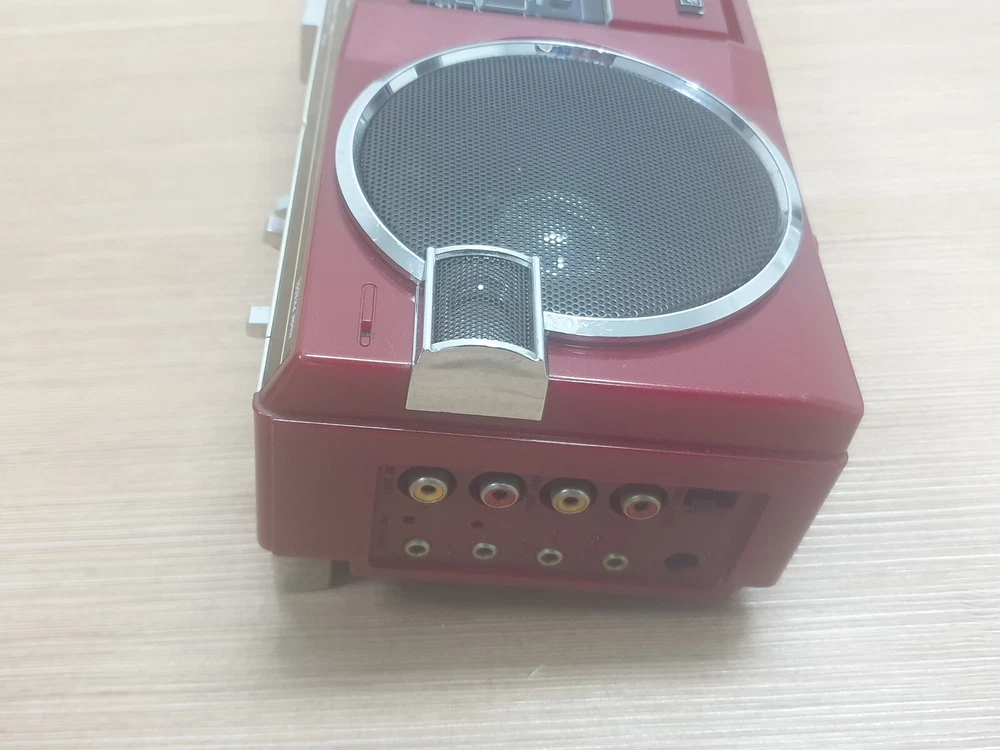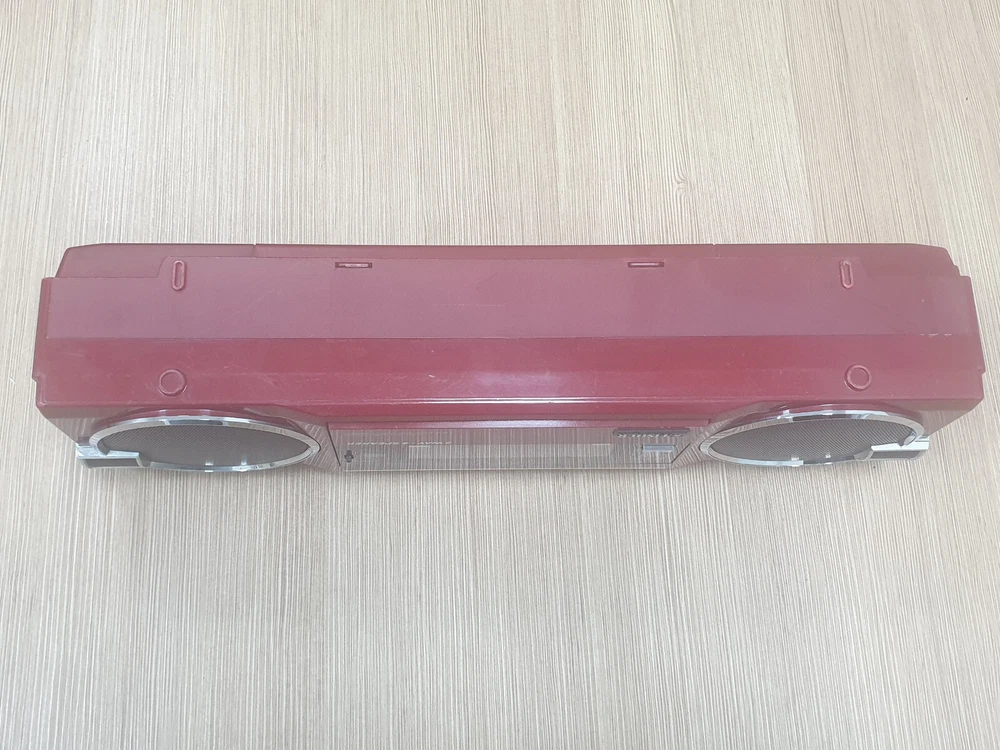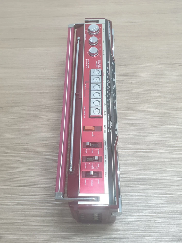 Collectable boombox in red color with a chrome accents. Unit will need professional restoration, because all its functions are not operational. Just a boombox is listed, no other accessories are included. Please look at photos and read complete description. Item is in good cosmetic condition.Unit has visible scuffs and scratches on the front side mainly and couple of punctiforme impressions on the top side metal panel.Small amount of dust is present.Battery compartment is clean, and unit will operate with them.Batteries are not included.Battery cover closes properly.Sponge will likely need replacement.Antenna is very good, bent gently.It opens and retracts as should.It can hold in most positions, not all.All switches and knobs are operating fine mechanically.Tape compartment opens softly and properly closes.Tuning is good and reception is proper.FM is tested only and unit tune to stations as should.Sound is good and switching options are functional.Volume regulation is good.Balance is working.Tape transport is not functional.Sound of a motor is heard once commands are issued.Recordings were not tested.Those are all testings performed with a unit.It is offered AS described for a complete professional restoration.