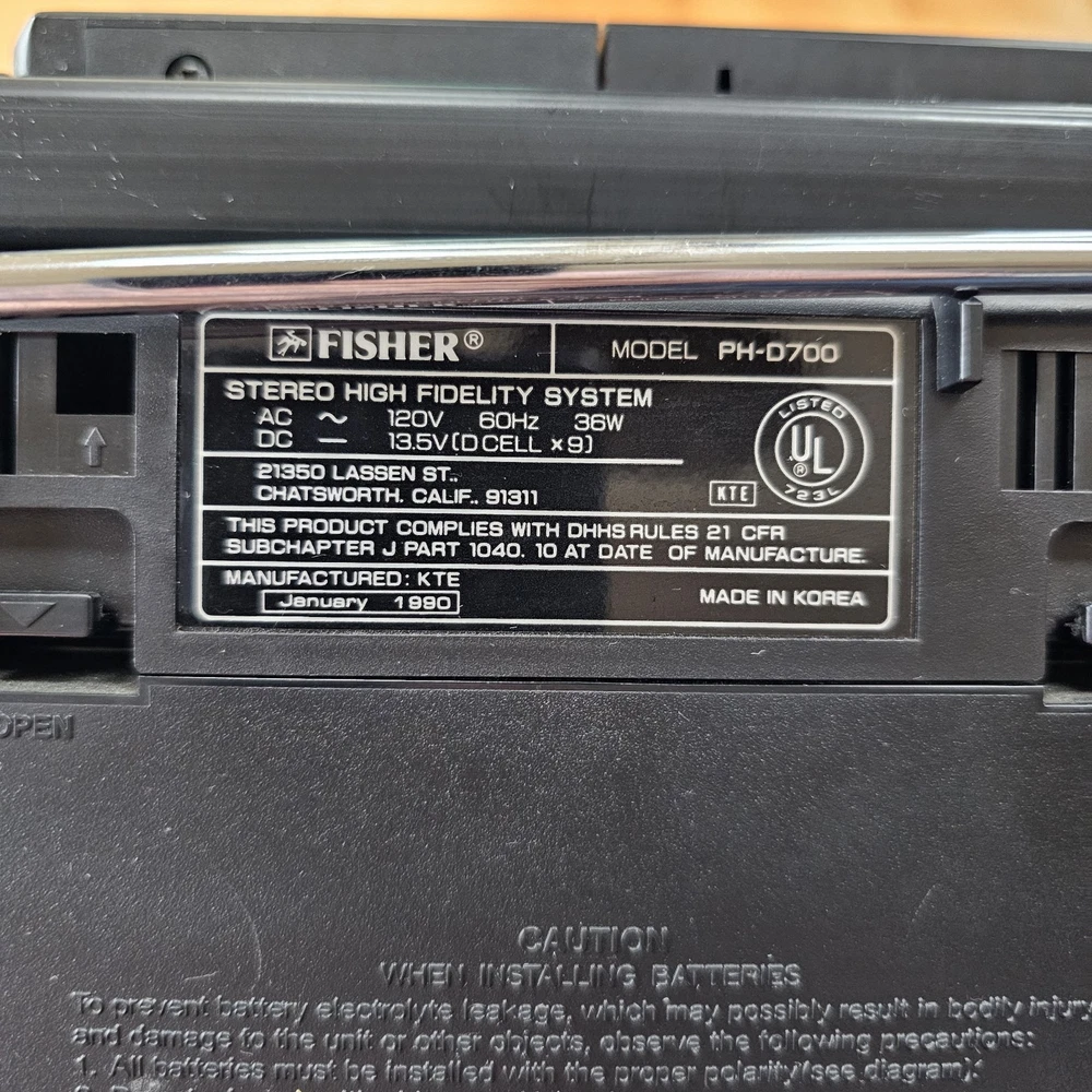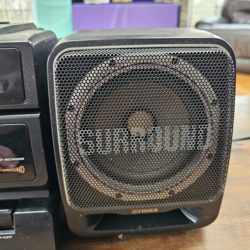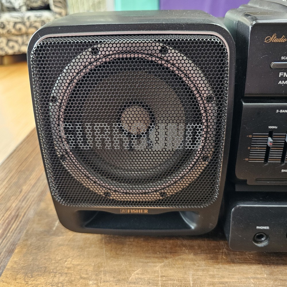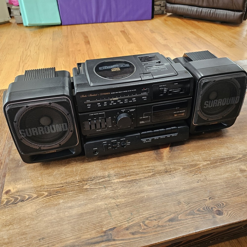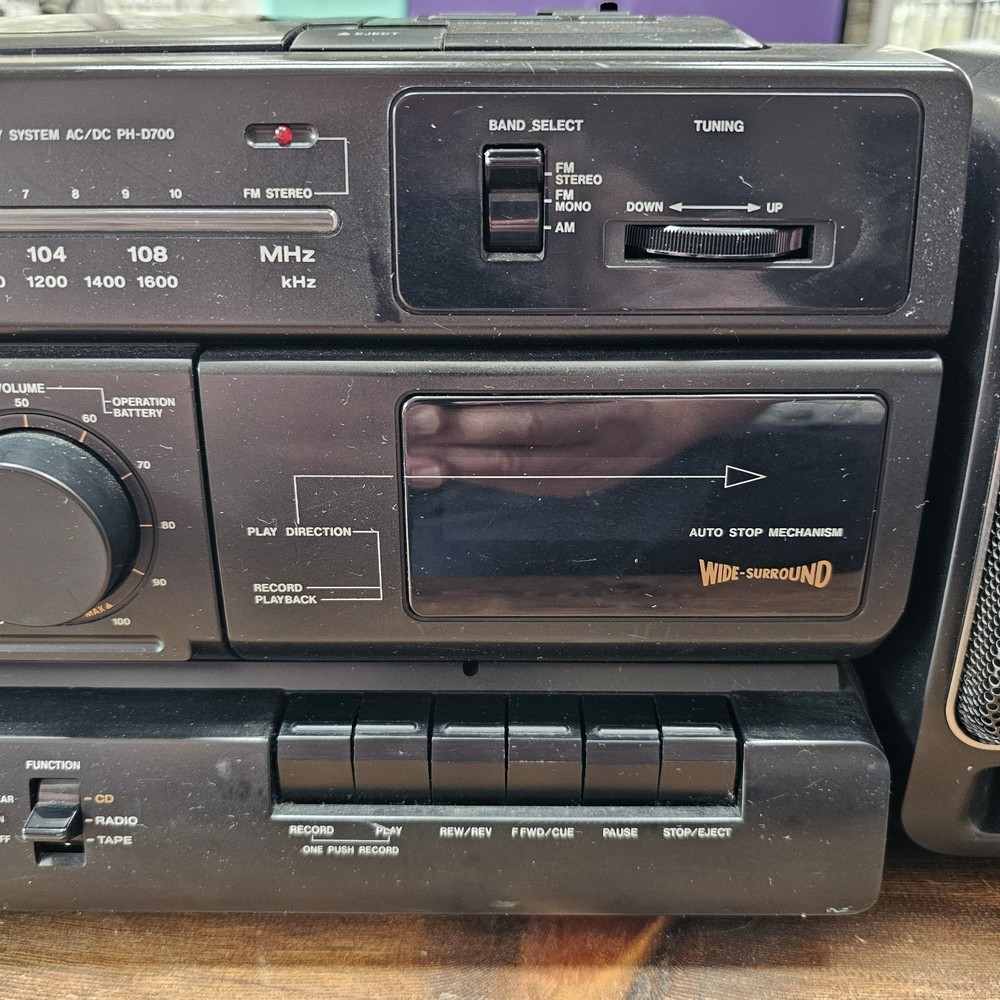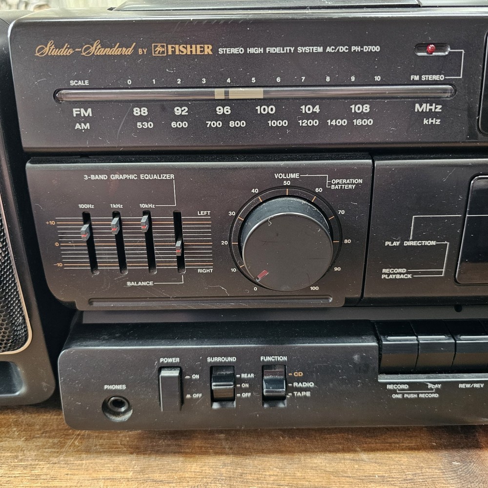 Fisher PH-D700 Boombox W/ CD AM-FM Cassette Surround Stereo Hi-Fi READ ITEM WORKS AND SOUNDS AMAZING. RADIO AND CD BOTH WORK WELL. CASSETTE PLAYER DOES PLAY BUT TAPE IS MUFFLED AND SLOW. I DONT KNOW IF I HAVE A BAD TESTING TAPE BUT I AM SELLING THIS UNIT AS THE CASSETTE PLAYER NOT PROPERLY WORKING. Sound on this is fantastic. Battery department clean. See pictures as they provide the most accurate description.