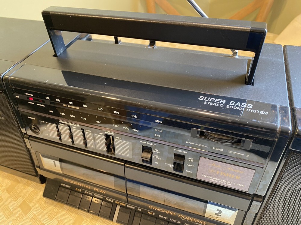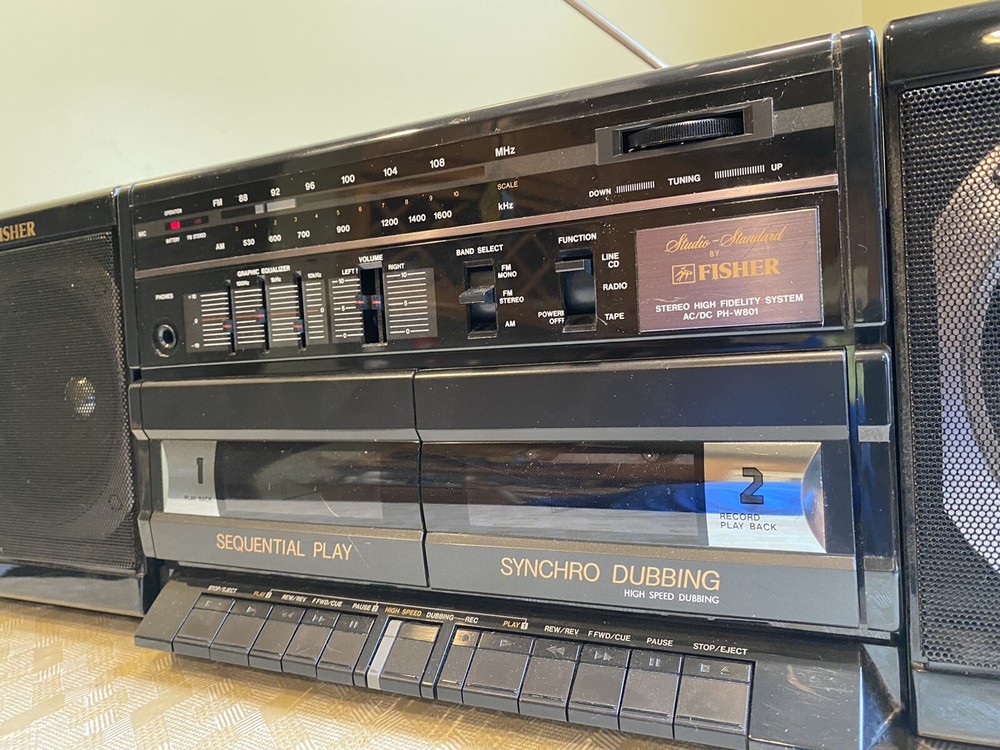 Fisher PH-W801 Surround Sound Boombox AM/FM WORKING Cassette DOES NOT WORK. When attempting to use the cassette player (with or without a cassette) it just makes a humming sound from inside, I assume the belts have failed from age. This unite still works on am and fm radio and makes for a great throwback radio or item for your collection. Please view all photos and use your own judgment when purchasing.