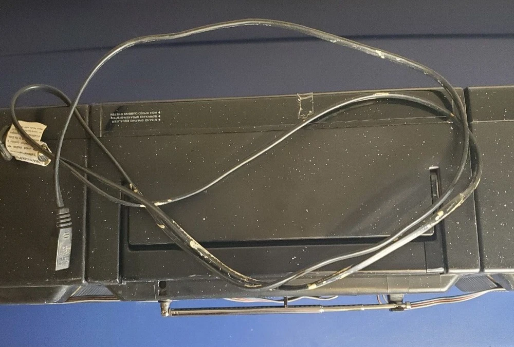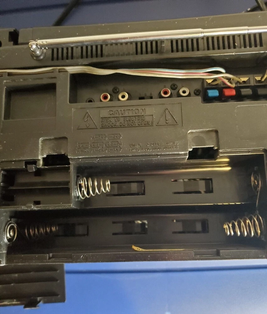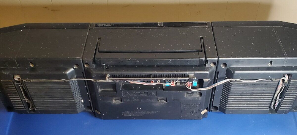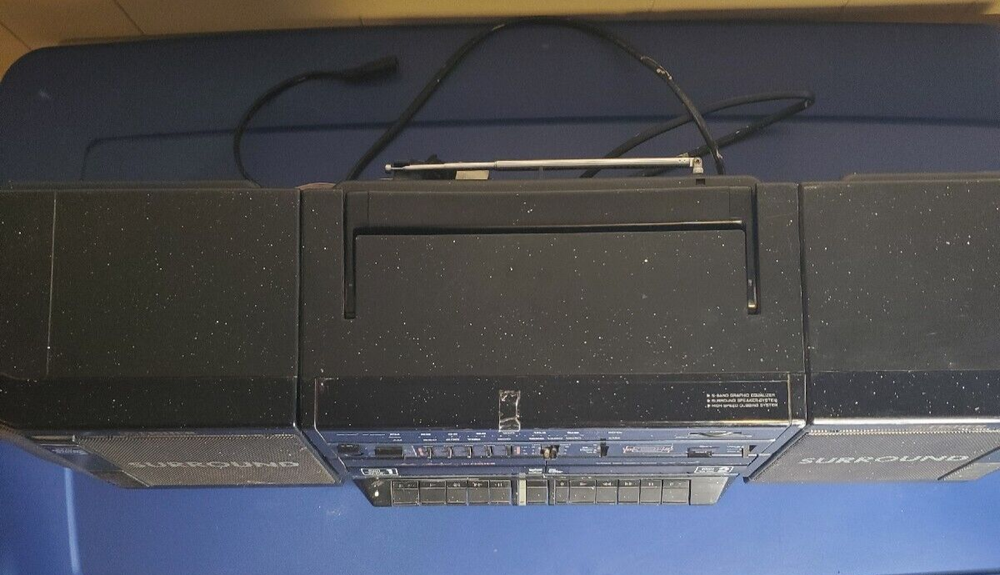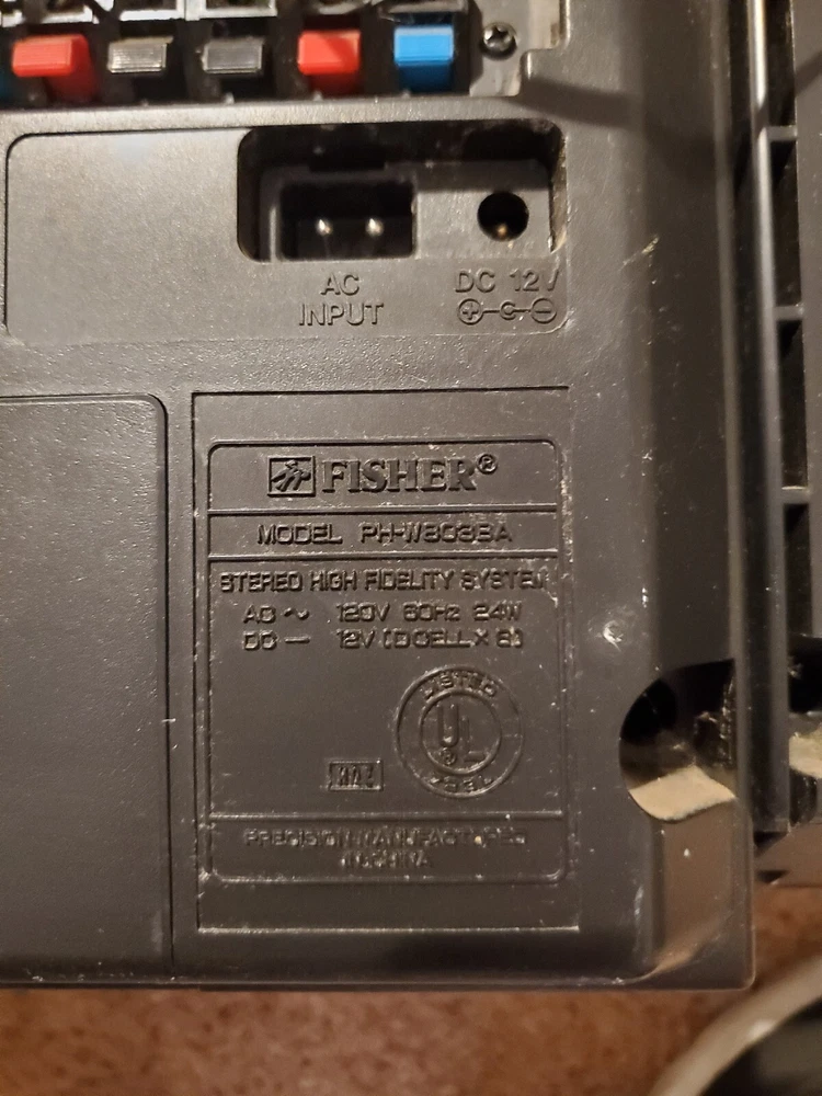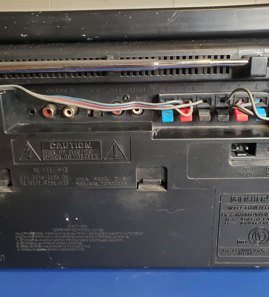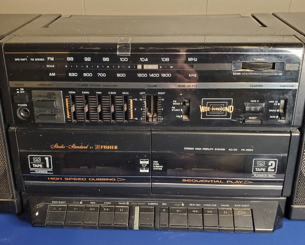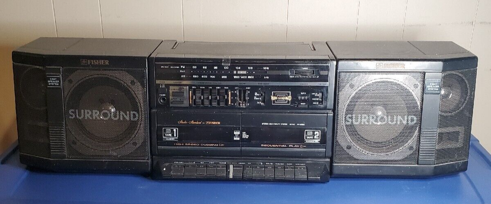 Fisher PH-803BA surround sound boombox. Radio works fine and there is a connection on the back for a CD player or other device. Speakers detach. Works on power or batteries. Battery compartment is clean with no corrosion. This would make a great unit for a workshop or garage. It's is really loud and has great sound. The radio sounds great. It has some light paint specs on it that may come off with a fingernail. Normal wear for a unit this old. Antenna may have been replaced. Looks different than the original. I have not opened it, but typically the belts break on these old cassette units. Replacement belts are available if you search for them. The transport buttons on the decks are fine buy the tape just doesn't turn. Comes with the power cord which has paint on it as well. This box has two RCA jacks on it and a switch for rear speakers. I have not tested it, but looks like you could connect this to separate powered speakers or a receiver. Fisher was known for making higher end stuff.