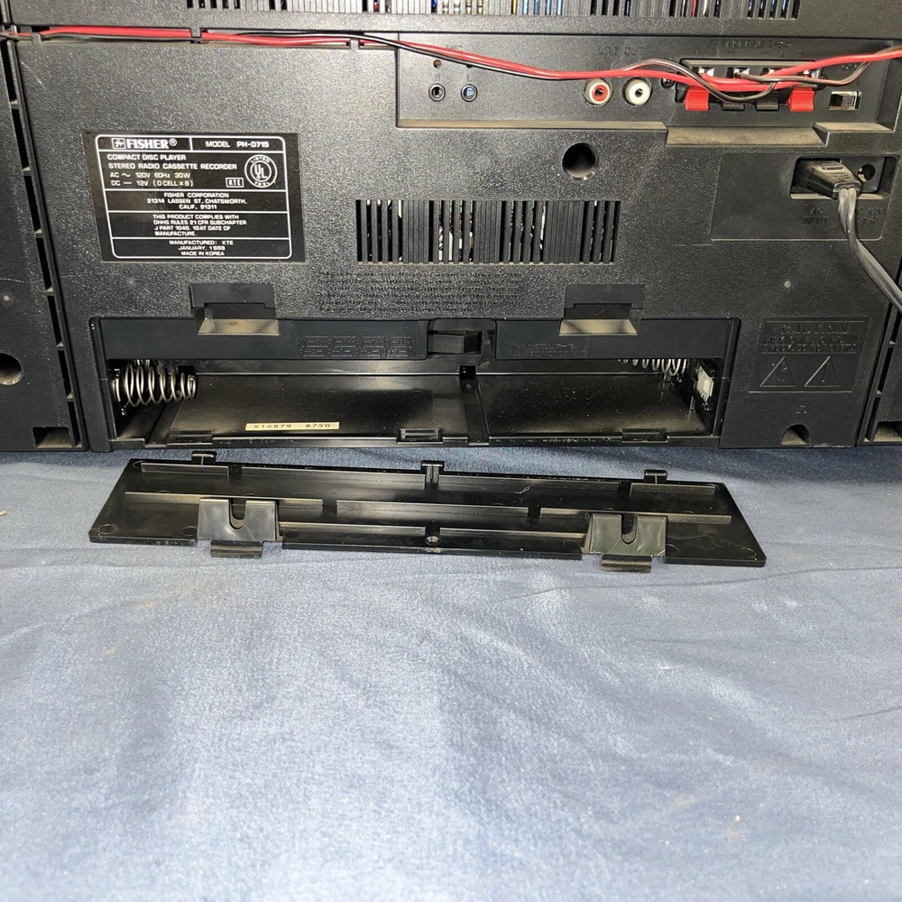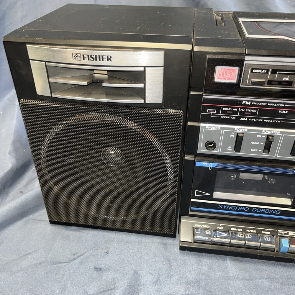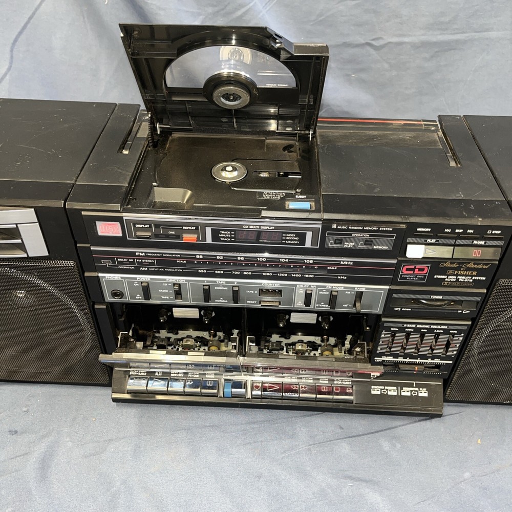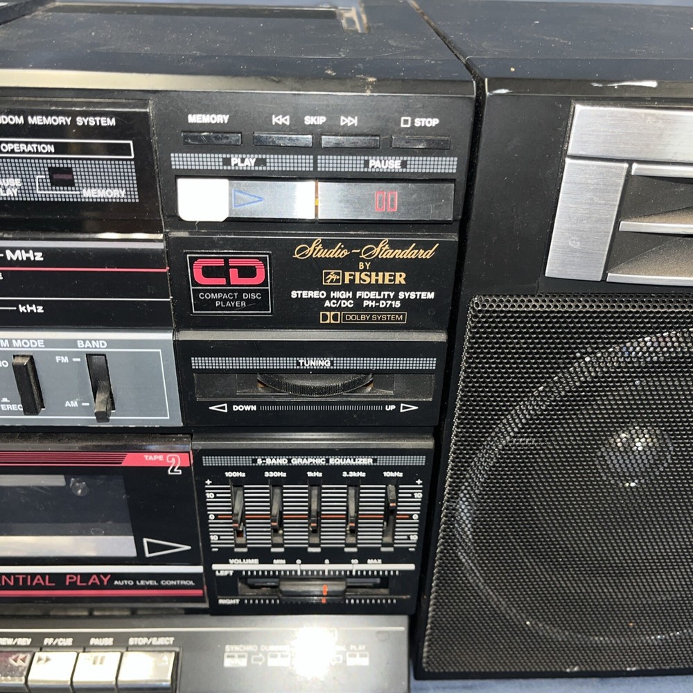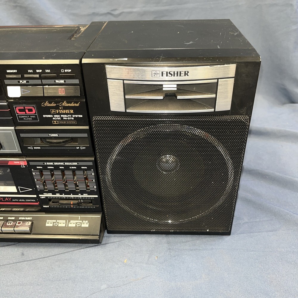 The Fisher Ph-d715 Studio Standard AM/FM Radio, Cassette and CD Player is a versatile boombox that offers a range of features for your audio needs. With its sleek black design and detachable speakers, this boombox is perfect for both home and on-the-go use. The CD player allows you to enjoy your favorite music, while the AM/FM radio provides a variety of listening options. Additionally, the built-in headphone jack and cassette tape player make it easy to enjoy your music privately. Overall, the Fisher Ph-d715 is a reliable and stylish option for your portable stereo needs. Item has been tested under ac power. Battery function not tested. Radio functions as expected. Cd player starts and spins, does not play. Neither cassette player works. Cassette and CD functions will need repair. Will be packed and shipped with care.