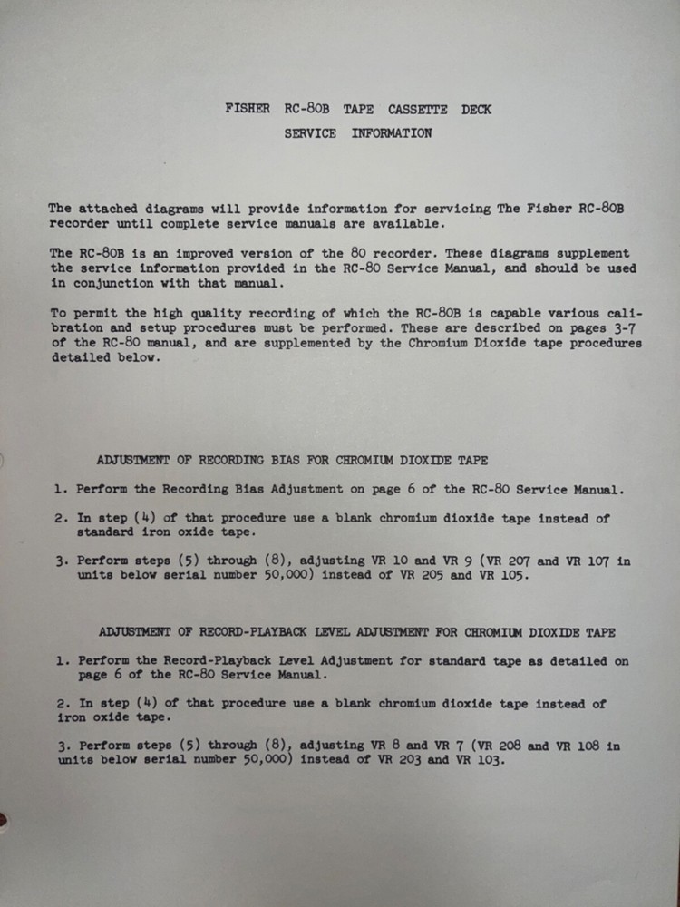 I am selling an Original Fisher RC-80B Stereo Tape-Cassette Recorder Service Manual.. Item was used at a repair center .. Item will be shipped USPS First Class or Media Mail..